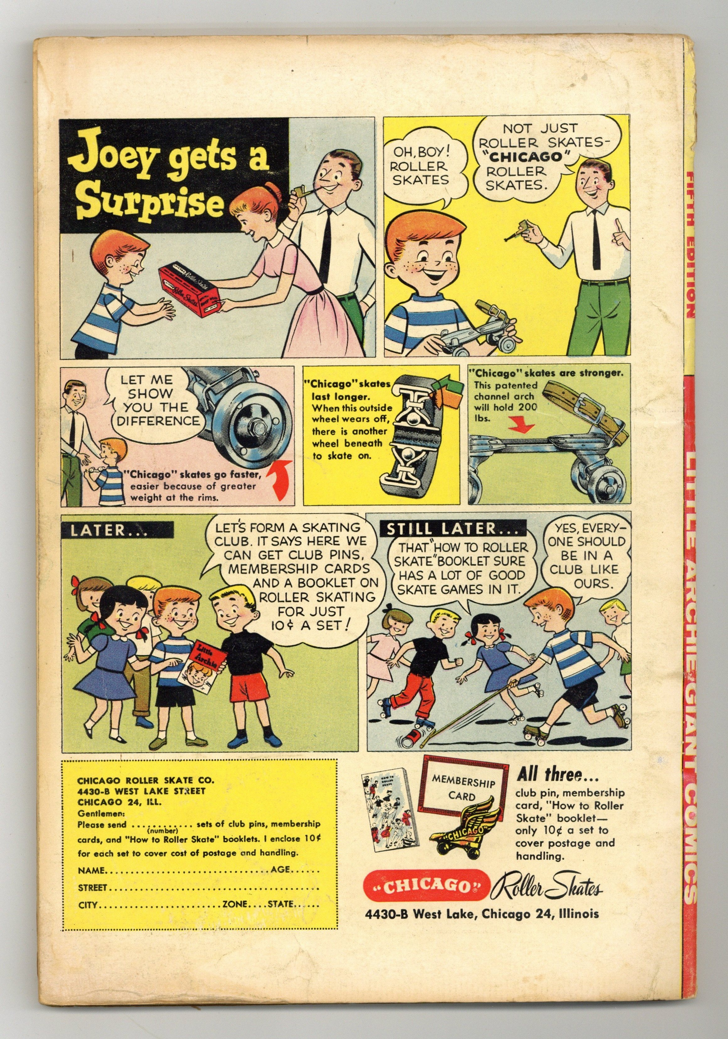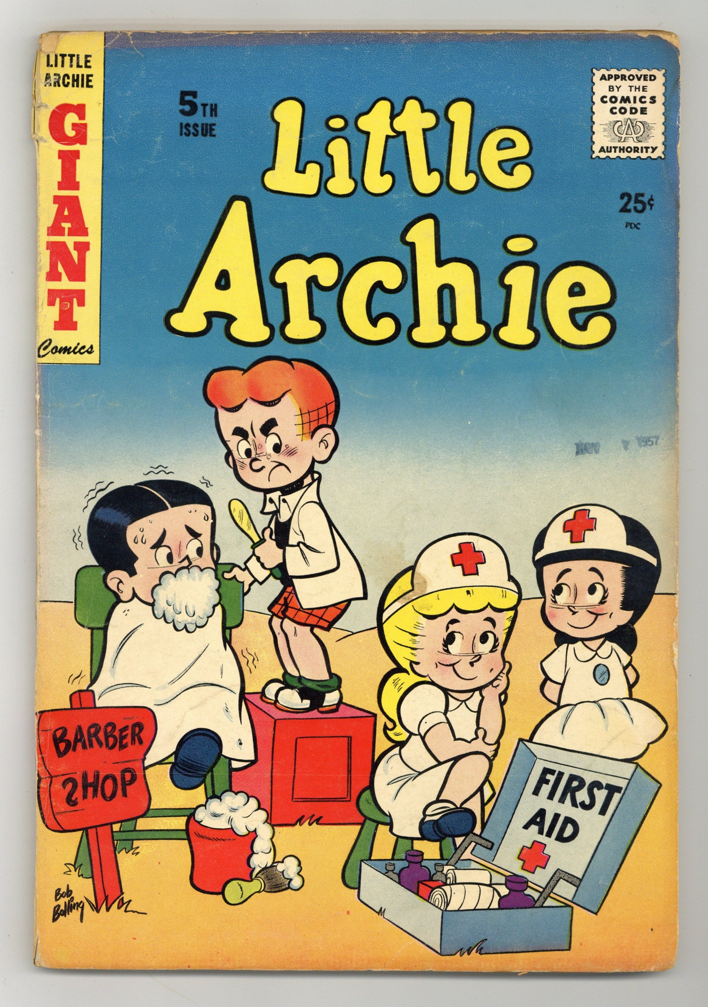 Cover art by Bob Bolling. A text story about Veronica trying to play Nurse. Laff Patrol, script and art by Bob Bolling; When the girls join the boys' attempt to play Foreign Legion, Little Archie offers a medal to anyone who shows unusual bravery on the next patrol. Roger's Riot, script and art by Bob Bolling; Fred and Mary think that the "Roger" Little Archie keeps talking to is an imaginary friend. The Son Shines Bright starring Pat the Brat. It's a Breeze, art by Jack Bradbury; The kids try to take the wash down off the line on a windy day. The Dolphin article. Fair Game starring Little Archie, pencils by Bill Vigoda. Not So Dumb starring Bunny, script and art by Samm Schwartz. 84 pgs. $0.25. Cover price $0.25.