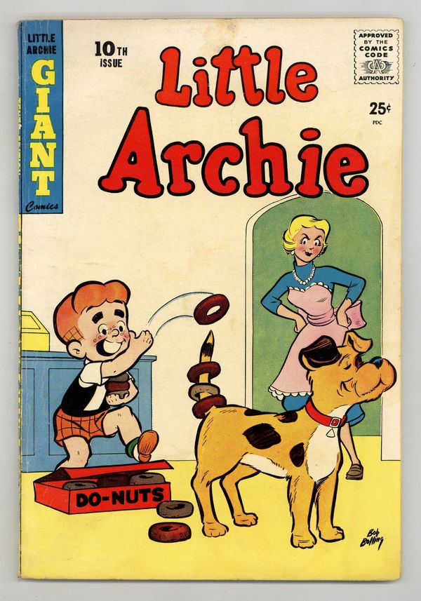 Cover art by Bob Bolling. Little Archie and the Good Ol' Gang, art by Bob Bolling; A black-and-white pin-up picture featuring all the regular members of Little Archie's Good Ol' Gang. Ark Antics, script and art by Bob Bolling; After his father tells him the story of Noah and the Ark, Little Archie builds his own ark out of the old rowboat on Carson's Creek, and lets everyone come on the ark in exchange for a fee of jelly beans. Cold Comfort, art by Samm Schwartz; Little Archie and his friends build an igloo. Television Tykes, script and art by Dexter Taylor; Little Archie starts his own television station, consisting of a hollowed-out box made up to look like a television set, and gets his friends to do programs and even commercials. 84 pgs. $0.25. Cover price $0.25.