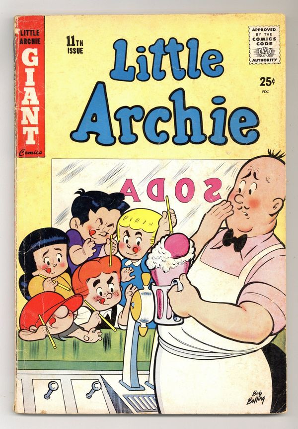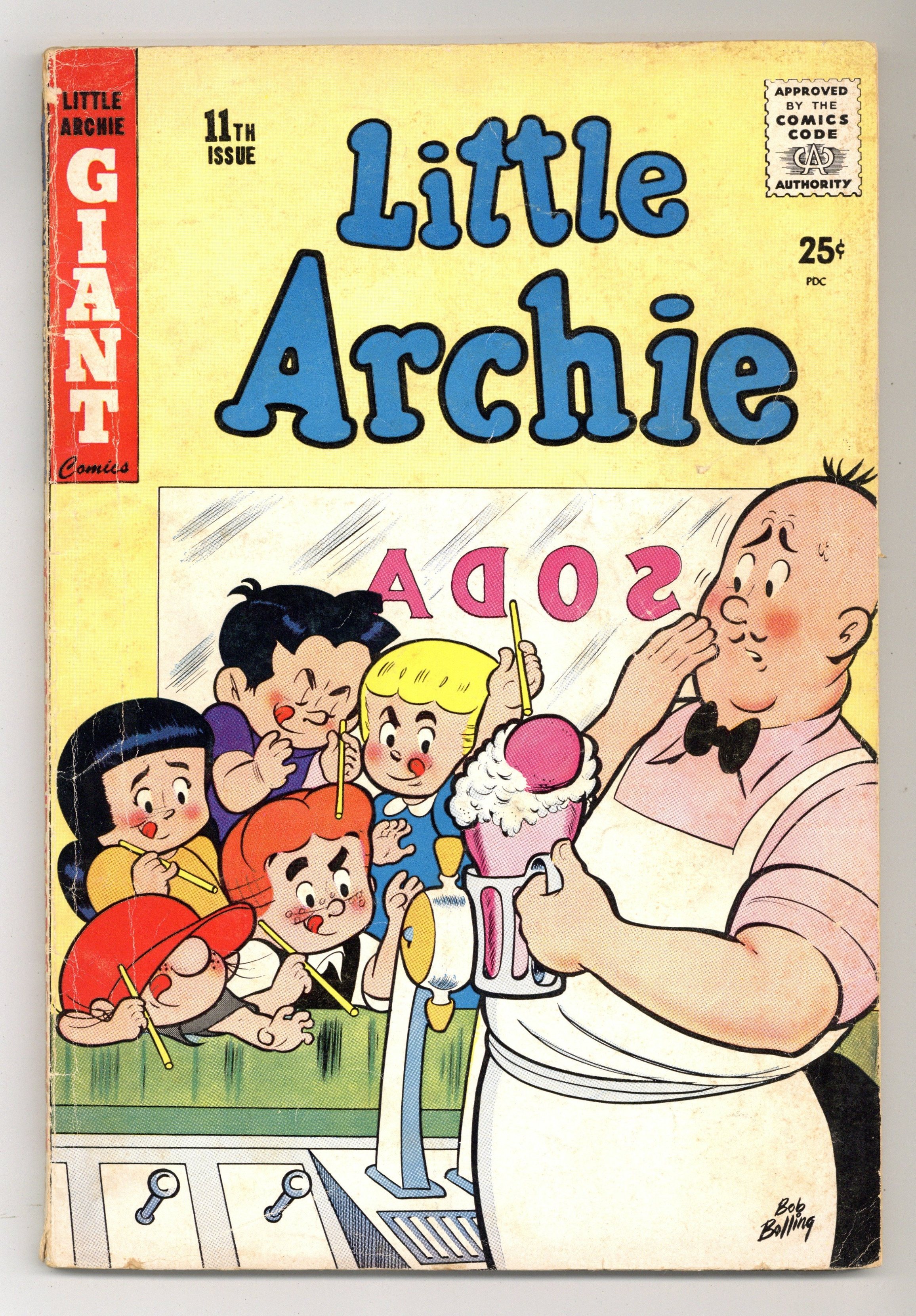 Cover art by Bob Bolling. The Scavengers, script and art by Bob Bolling; When the girls are beating the boys at a scavenger hunt, Little Archie scares away Evelyn, who's guarding the girls' findings, by making her think a ghost is after her. Campaign Capers, script and art by Dexter Taylor; After Fred tells the kids that they should settle dispute democratically instead of with fighting, Little Archie and Reggie run against each other in an election for "Boss of the West Side." Business Build Up, script and art by Dexter Taylor; The boys take Ambrose's money to help finance their health-club business, and then fire him. The Great Mince Pie Mystery, script and art by Bob Bolling; Fred has to go on a diet because Little Archie, being ashamed of his father's weight, won't go on walks with him anymore. The Shrimp From Outer Space, script and art by Bob Bolling; Little Archie and the Good Ol' Gang build a rocket out of a barrel and a giant slingshot. 84 pgs. $0.25. Cover price $0.25.