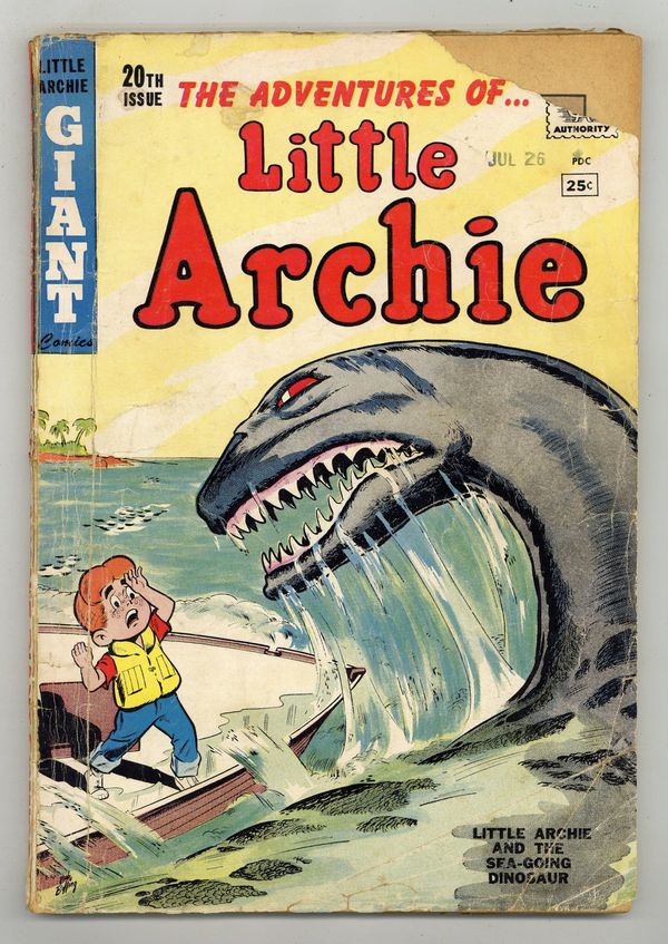 Cover art by Bob Bolling. Plesiosaur, script and art by Bob Bolling; While on vacation in Florida, Little Archie goes out in a boat with his cousin Dan and his girlfriend Vicki. Baseball Dope! humor page starring Li'l Jinx, script and art by Joe Edwards. The Strange Case of Crawford Crab, script and art by Bob Bolling; The story of Crawford, a crab who is shunned by the crab community for having a dull, unattractive shell. Law and Disorder, script and art by Dexter Taylor; Mr. Weatherbee tries to get Reggie to behave by making him a hall monitor, but it just makes him power-mad. 84 pgs. $0.25. Cover price $0.25.