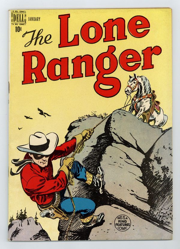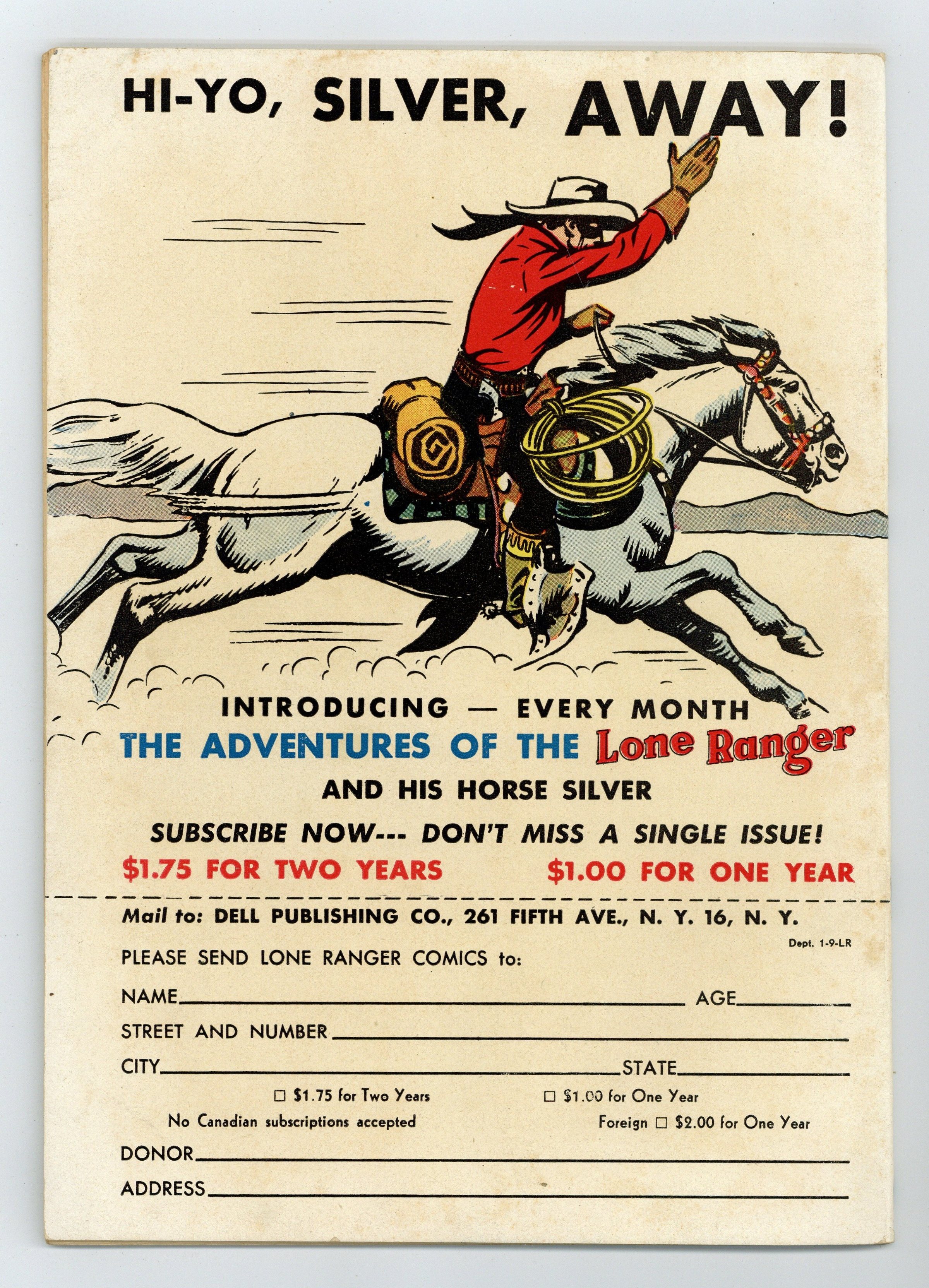 The Indian Travois fact page, art by Till Goodan. The Lone Ranger and the Pony Rider, art by Charles Flanders; A stolen letter from a murdered Pony Express rider leads to Mr. Purdy's gold mine being shut down. The Lone Ranger and the Election Plot, art by Charles Flanders; Slim Hancock brings the Drumm and Finley gangs to town to win an election for Sheriff. The Story of the Horse; Facts about the evolution of horses and their uses in modern times. Color promo for subscriptions to Dells Lone Ranger comic. Based on the popular Western TV series. 52 pages, full color. Cover price $0.10.