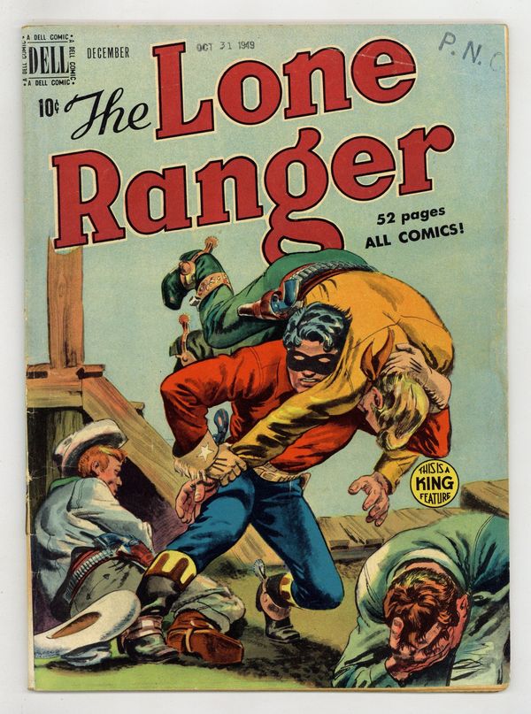 The Lone Ranger and the Hooded Gang of Terrorists, art by Charles Flanders; The Lone Ranger pretends to be a robber to gain membership in "The Hooded Gang." The Lone Ranger and the Murder of Mr. Driscoll, art by Charles Flanders; Driscoll intends to foreclose the mortgage on the Lone Ranger's friend, Mustang Mag, but is shot and killed by someone who frames the Lone Ranger for the murder. Dead-Shot Dandy--The true story of Wild Bill Hickok's days as Sheriff of Hays, Kansas, in 1869. Return of the Sioux, script by Gaylord Du Bois, art by Tom Hickey; Safe in their wolf's den hideout, Young Hawk and Little Buck make a bow and some arrows and hunt a deer; But the Sioux return and chase Young Hawk to the edge of a cliff. Portrait of Chief Joseph of the Nez Perces (1840-1904). Based on the popular Western TV series. 52 pages, full color. Cover price $0.10.