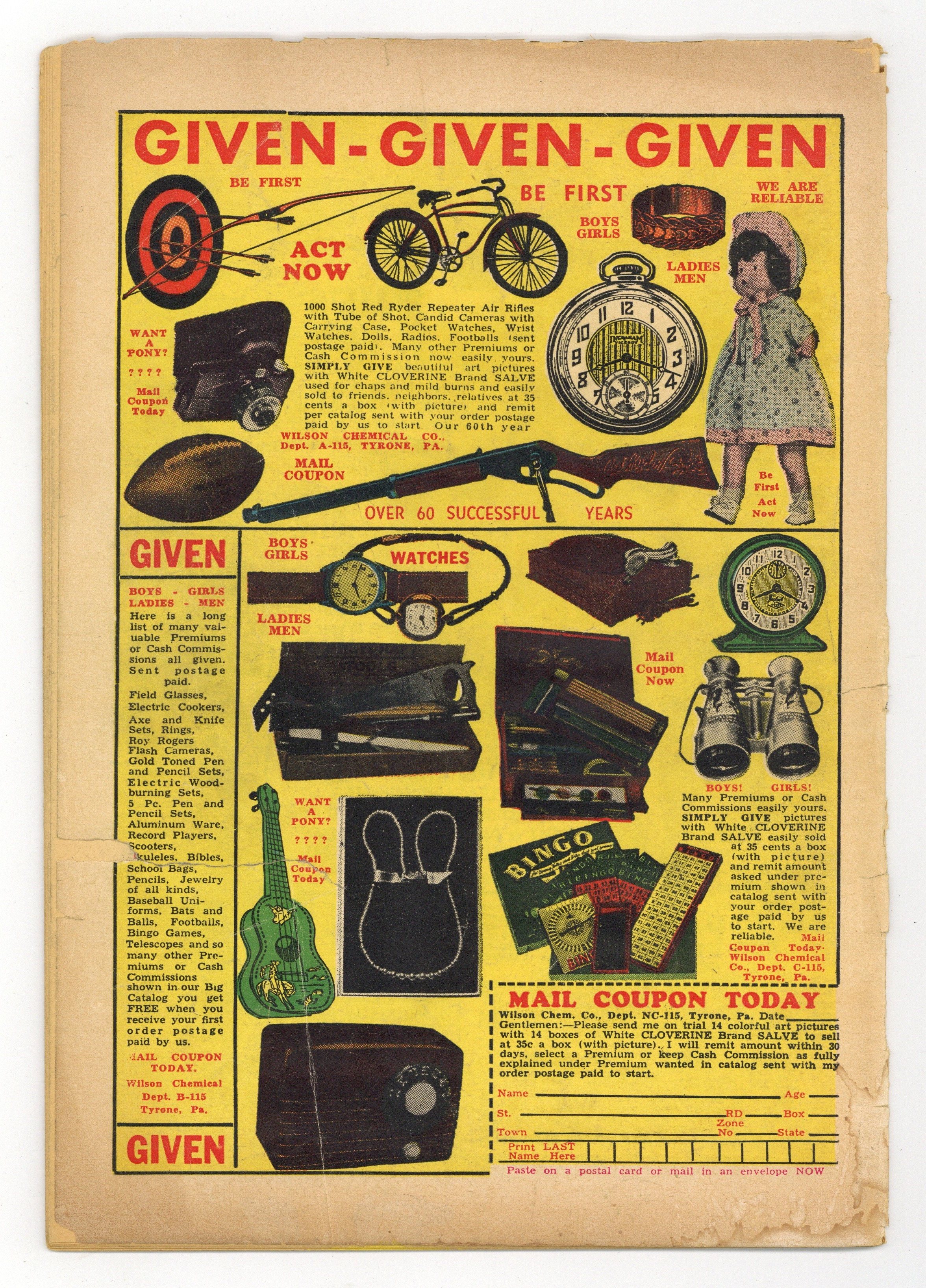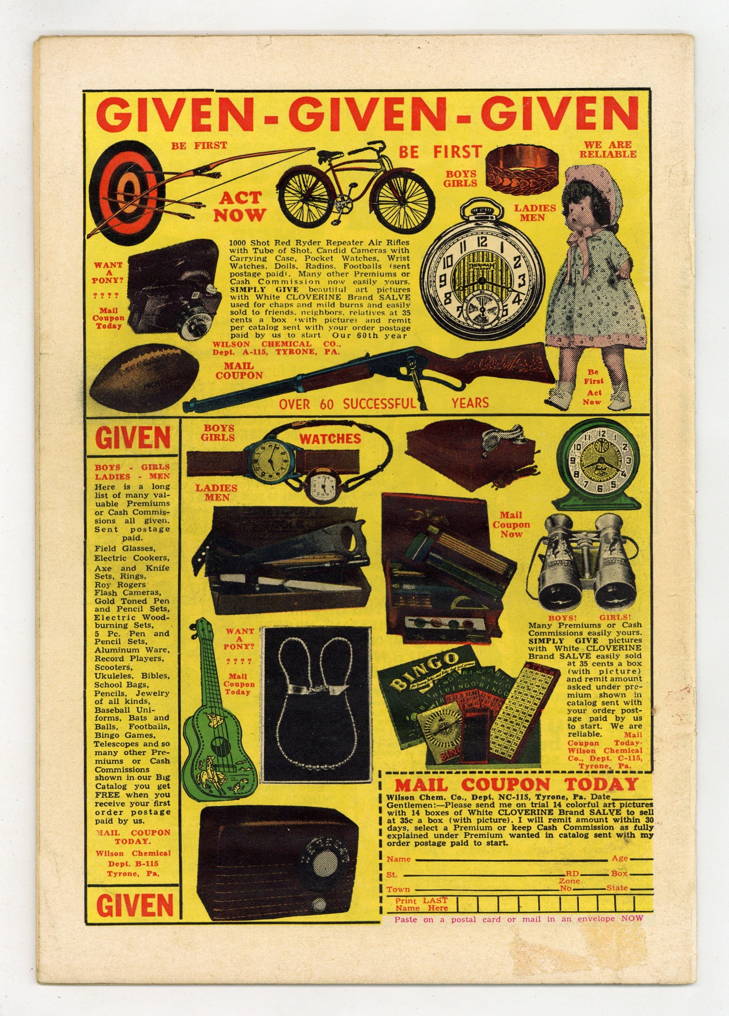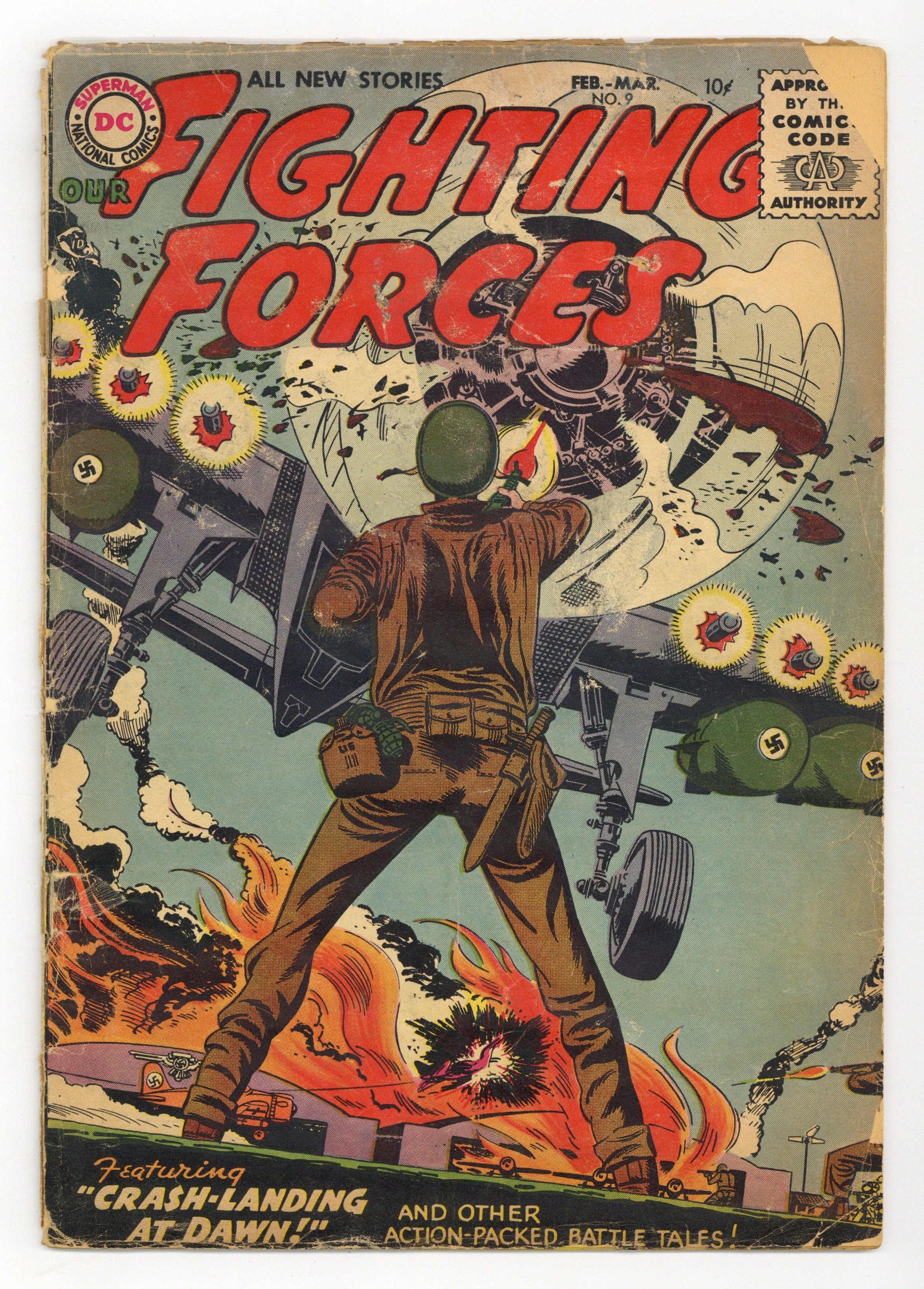 Cover by Jerry Grandenetti. Stories by Robert Kanigher, Jack Miller and Bob Haney. Art by Ross Andru, Jerry Grandenetti, Joe Kubert, Russ Heath, Mike Esposito and Joe Giella. Action-packed battle tales! In this issue: "Crashlanding at Dawn!" by Robert Kanigher, Ross Andru and Mike Esposito; "Empty-Handed Soldier" by Jack Miller, Jerry Grandenetti and Joe Giella; "Battle Map!" by Bob Haney and Joe Kubert; and "The Safe War!" by Haney and Russ Heath. Plus: 2-page text article "Battle Birds"; Khaki-Yaks 1-pager by Irwin Hasen; General Little 1-pager by Hasen; and This Ain't the Army 1-pager by Hasen. And: Quarter-page Wildroot Cream-Oil ad featuring Fearless Fosdick with art by Al Capp. 36 Pages, Full Color. Cover price $0.10.