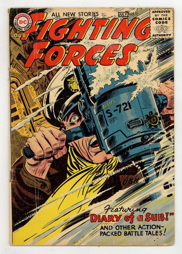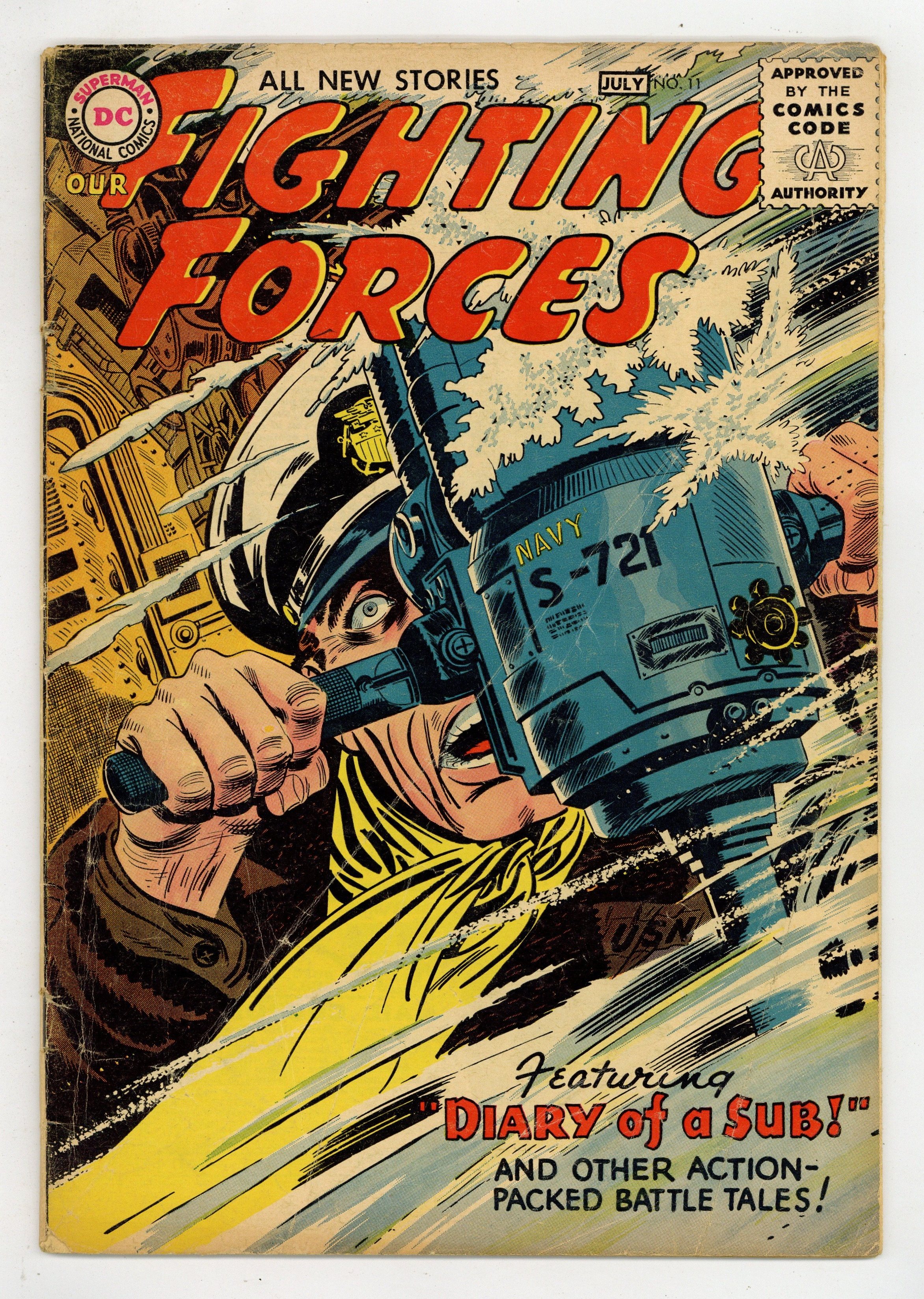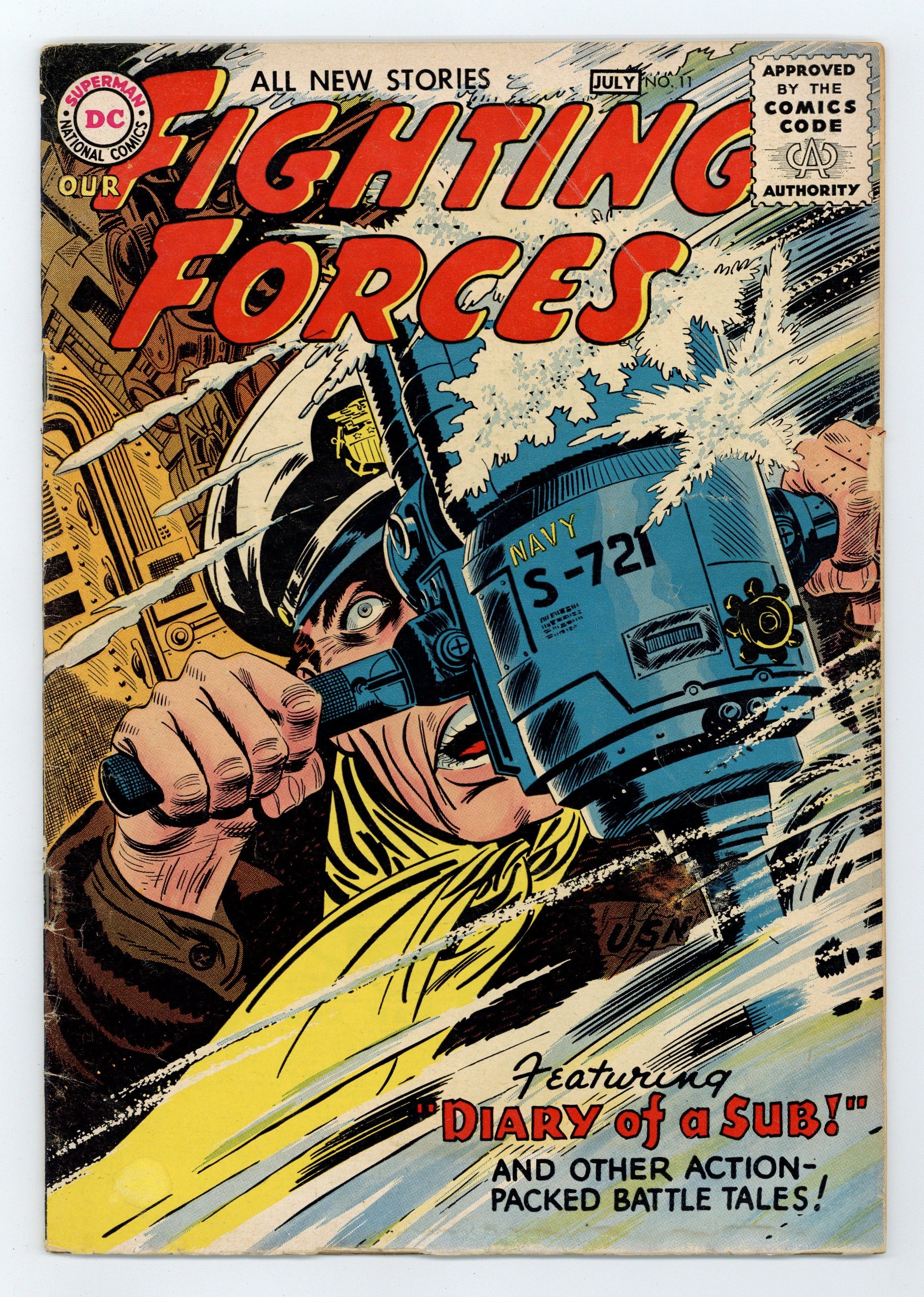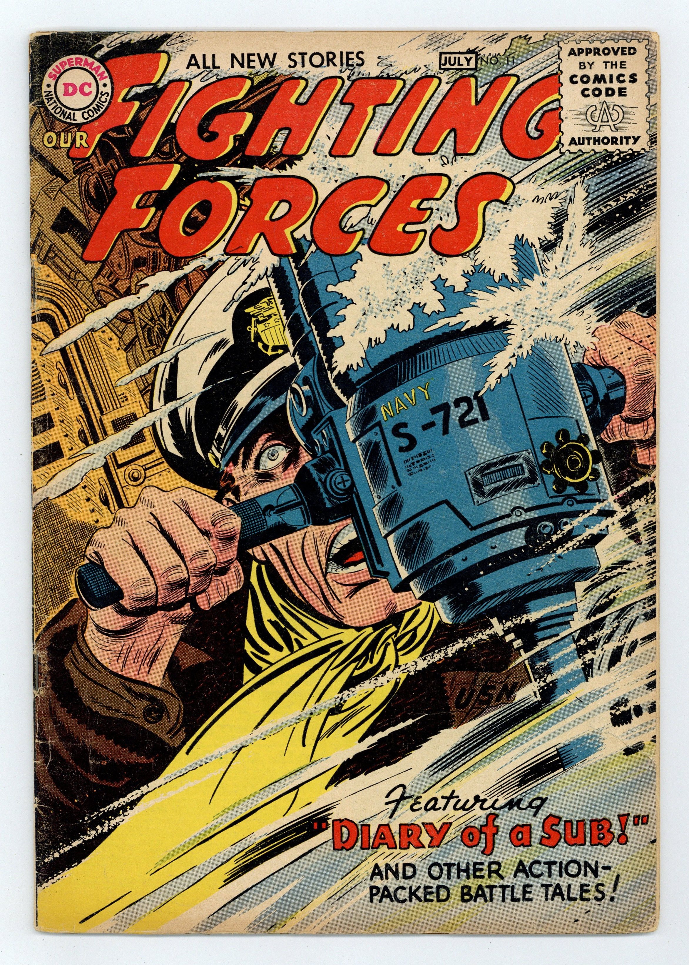 Cover by Jerry Grandenetti. Stories by Robert Kanigher, Bob Haney, Dave Wood and Jack Miller. Art by Jerry Grandenetti, Joe Kubert, Arthur Peddy and George Papp. Action-packed battle tales! In this issue: "Diary of a Sub!" by Robert Kanigher and Jerry Grandenetti; "Return to Beach Red!" by Bob Haney and Joe Kubert; "Combat Inch!" by Dave Wood and Arthur Peddy; and "Beached Frogman!" by Jack Miller and George Papp. Plus: 2-page text article "Soldiers on Horseback"! And: Private Diary 1-pager by Irwin Hasen. 36 Pages, Full Color. Cover price $0.10.