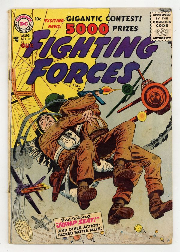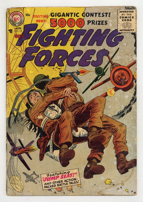 Cover by Jerry Grandenetti. Stories by Robert Kanigher, Bob Haney and Jack Miller. Art by Irv Novick, Ross Andru, Joe Kubert, Jerry Grandenetti, Mike Esposito and Robert Stuart. Action-packed battle tales! In this issue: "Jump Seat!" by Robert Kanigher and Irv Novick; "War Bird!" by Kanigher, Ross Andru and Mike Esposito; "Tank for Beach Green!" by Bob Haney and Joe Kubert; and "Hitch-Hike to War!" by Jack Miller, Jerry Grandenetti and Robert Stuart. Plus: 2-page text article "Find 'Em - Chase 'Em - Sink 'Em!" 36 Pages, Full Color. Cover price $0.10.