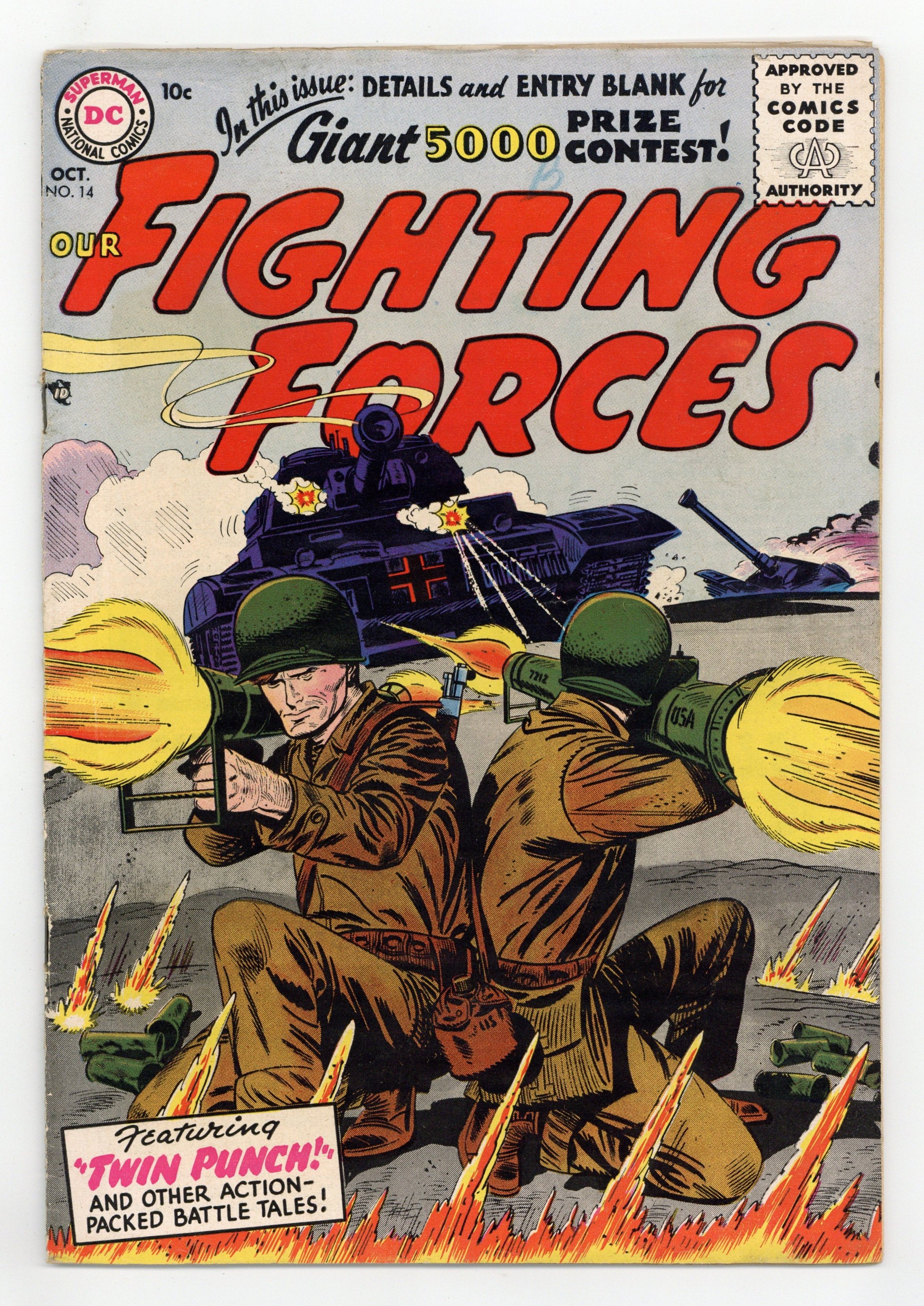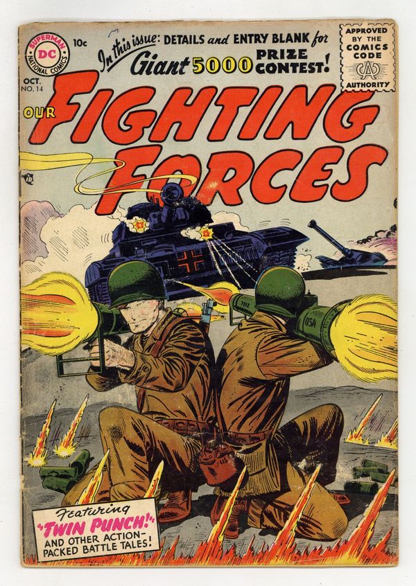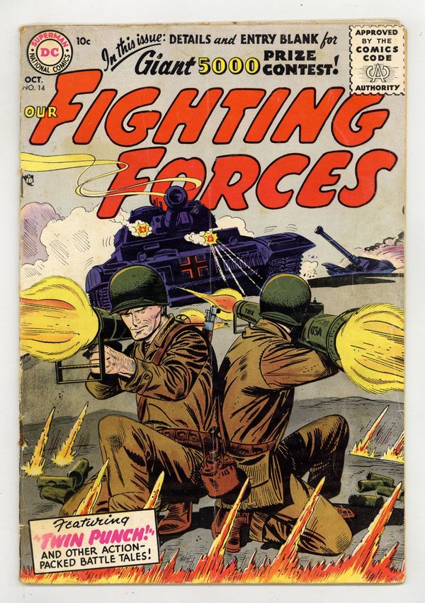Cover by Jerry Grandenetti. Stories by Bill Finger, Bob Haney and Robert Kanigher. Art by Arthur Peddy, Jack Abel, Ross Andru, Irv Novick and Mike Esposito. Action-packed battle tales! In this issue: "Unseen War!" by Bill Finger and Arthur Peddy; "Tank on the Run" by Bob Haney and Jack Abel; "Twin Punch!" by Robert Kanigher, Ross Andru and Mike Esposito; and "PT Boat Log" by Haney and Irv Novick. Plus: 2-page text article "Battle Rating"! And: Khaki Yaks half-pager by Irwin Hasen. 36 Pages, Full Color. Cover price $0.10.