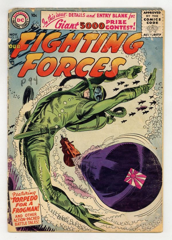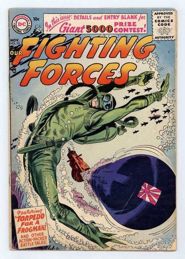 Cover by Jerry Grandenetti. Stories by Ed Herron, Bob Haney and Robert Kanigher. Art by Ross Andru, Jack Abel, Joe Kubert, Russ Heath and Mike Esposito. Action-packed battle tales! In this issue: "Target for a Lame Duck!" by Ed Herron, Ross Andru and Mike Esposito; "Foxhole Break!" by Bob Haney and Jack Abel; "Torpedo for a Frogman" by Robert Kanigher and Joe Kubert; and "The Mountain!" by Haney and Russ Heath. Plus: 2-page text article "Sub Spotters" with art by Raymond Perry. And: Private Pete half-pager by Henry Boltinoff, reprinted from Superboy (1949-1979 1st Series DC) #16. 36 Pages, Full Color. Cover price $0.10.