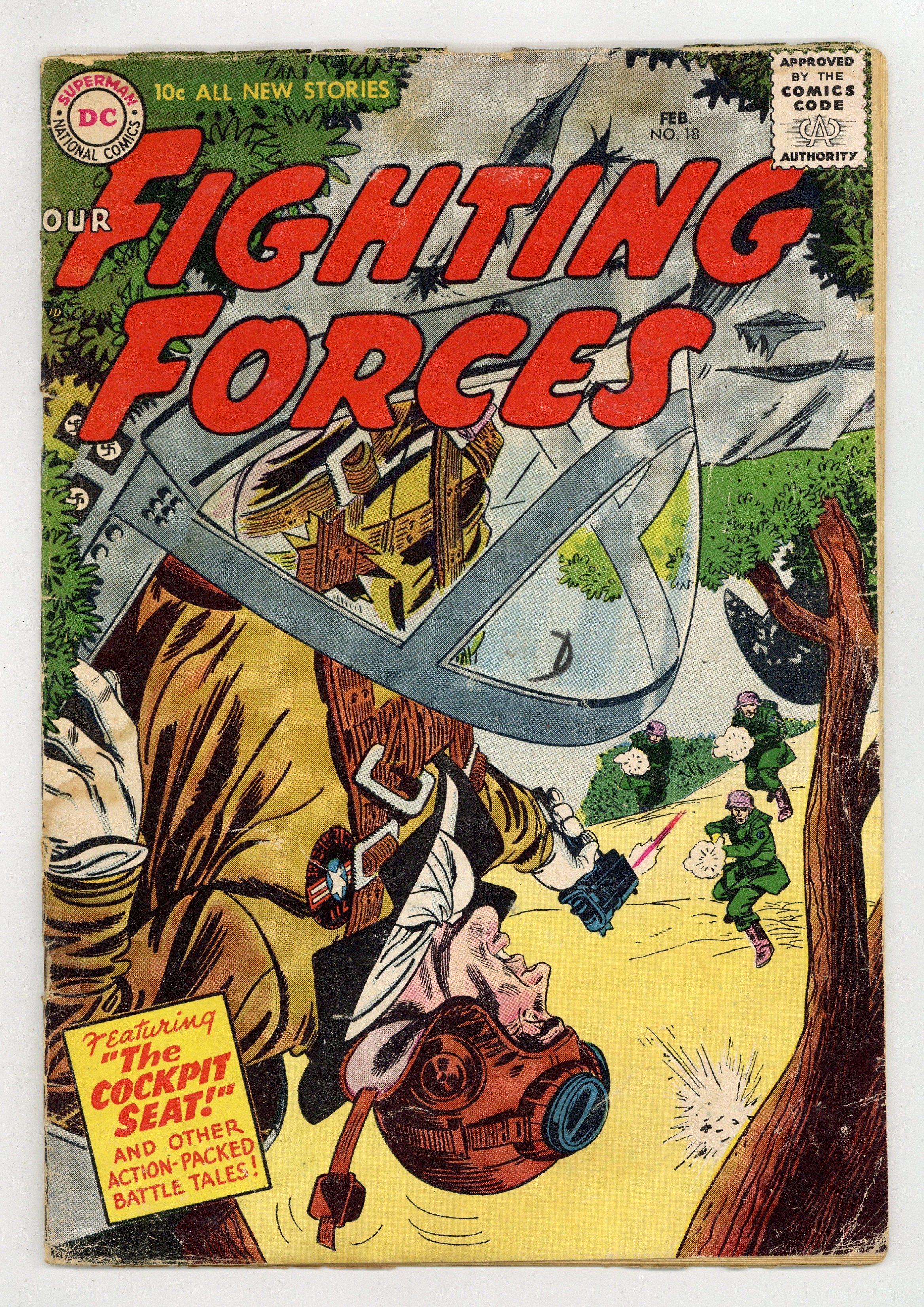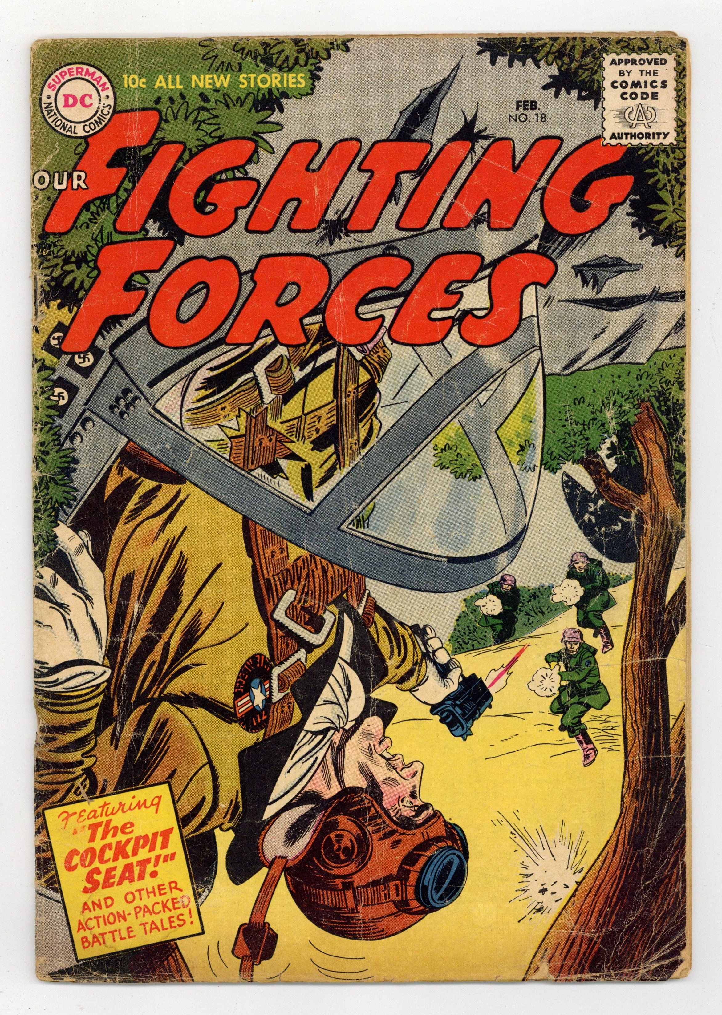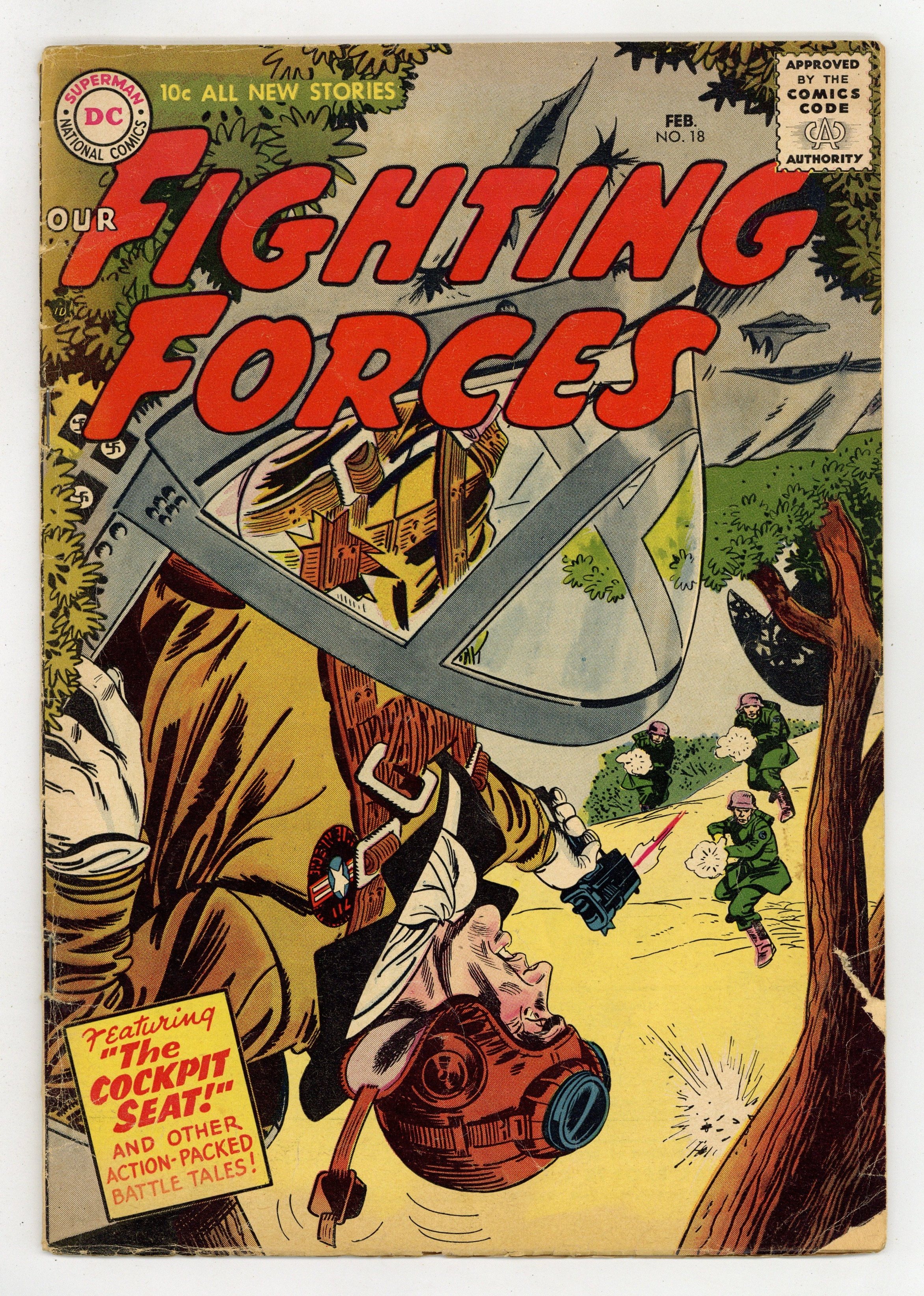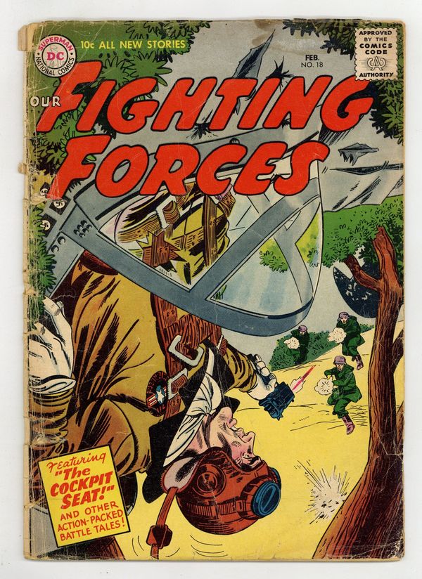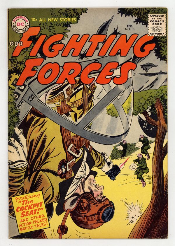 Cover by Jerry Grandenetti. Stories by Robert Kanigher, Ed Herron, Bill Finger and Bob Haney. Art by Ross Andru, Joe Kubert, Arthur Peddy, Russ Heath and Mike Esposito. Action-packed battle tales! In this issue: "The Cockpit Seat!" by Robert Kanigher, Ross Andru and Mike Esposito; "G.I. Speed-Box!" by Ed Herron and Joe Kubert; "The Sands of War!" by Bill Finger and Arthur Peddy; and "Flak Alley!" by Bob Haney and Russ Heath. Plus: 1-page text article "The Seventh Scouts"; War Words! half-pager; 1-page text story "Front-Line Announcer"; and Private Pete half-pager by Henry Boltinoff, reprinted from Star Spangled War Stories (1952 #131-133) #133. 36 Pages, Full Color. Cover price $0.10.