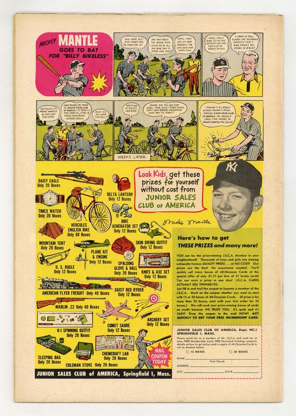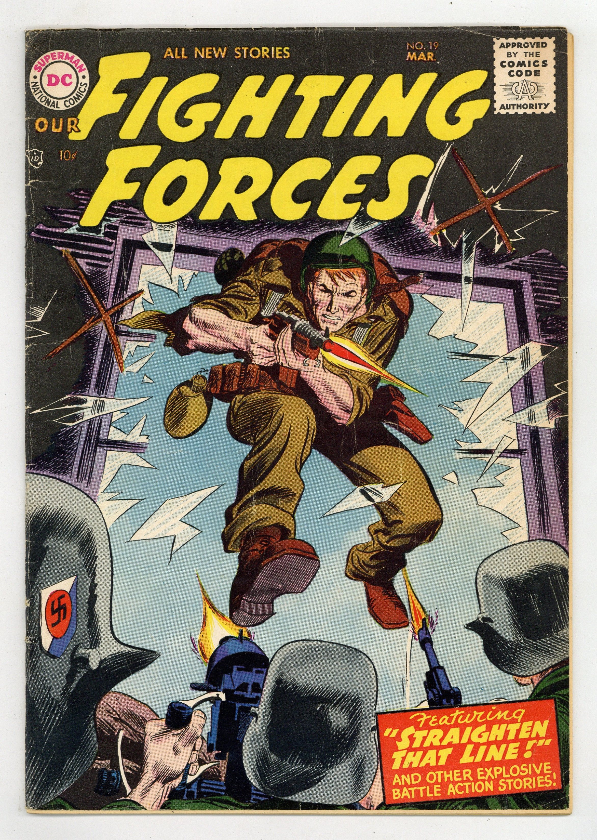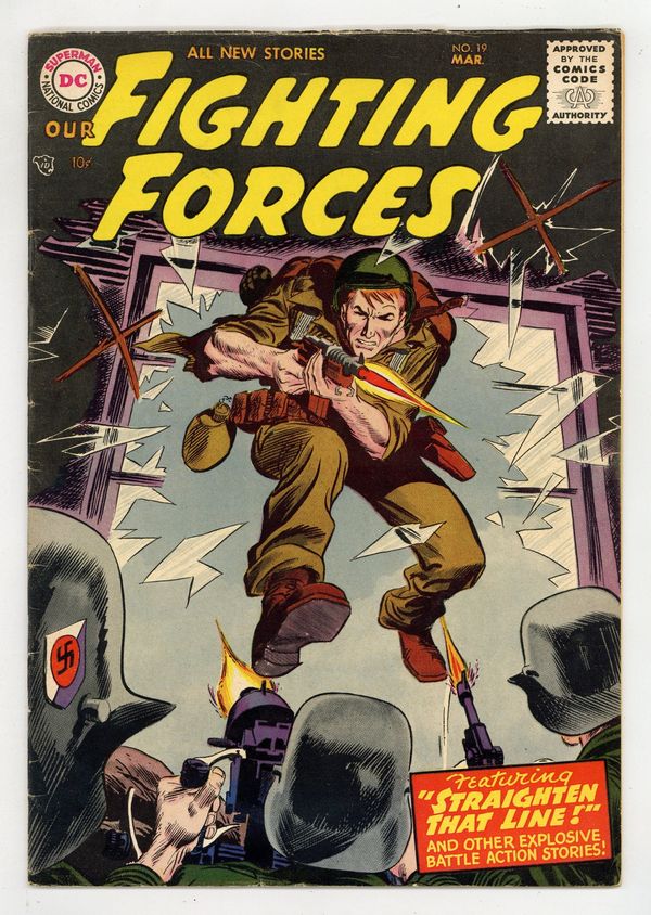 Cover by Joe Kubert. Stories by Robert Kanigher, Bob Haney and Robert Bernstein. Art by Joe Kubert, Arthur Peddy, Ross Andru, Jack Abel and Mike Esposito. Explosive battle action tales! In this issue: "Straighten That Line!" by Robert Kanigher and Joe Kubert; "The Flying Corridor!" by Bob Haney and Arthur Peddy; "Underwater Obstacle!" by Kanigher, Ross Andru and Mike Esposito; and "Step This Way -- War!" by Robert Bernstein and Jack Abel. Plus: 1-page story "The Cottonbalers!" And: 2-page text article "The Army's Strangest Soldiers"! 36 Pages, Full Color. Cover price $0.10.