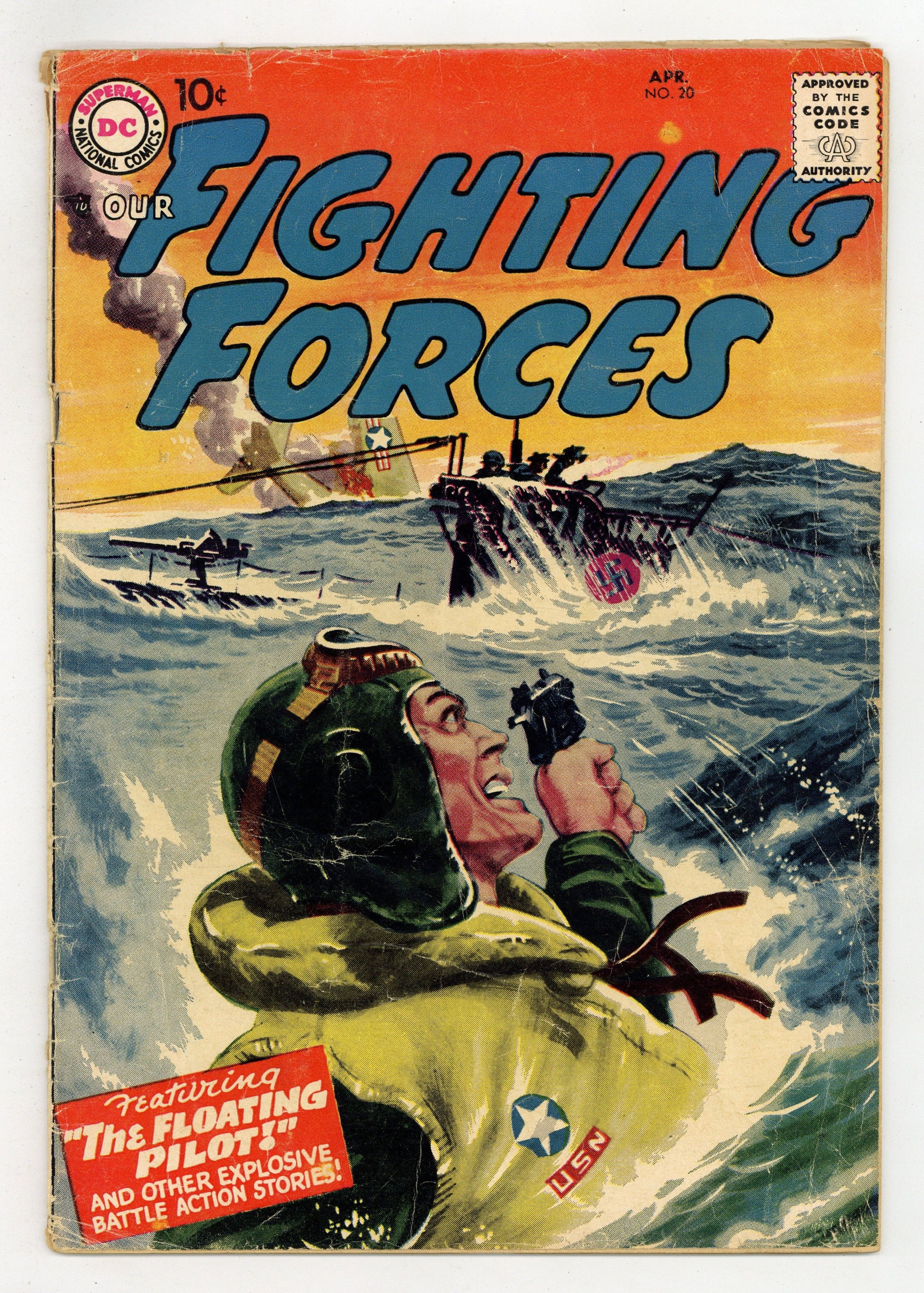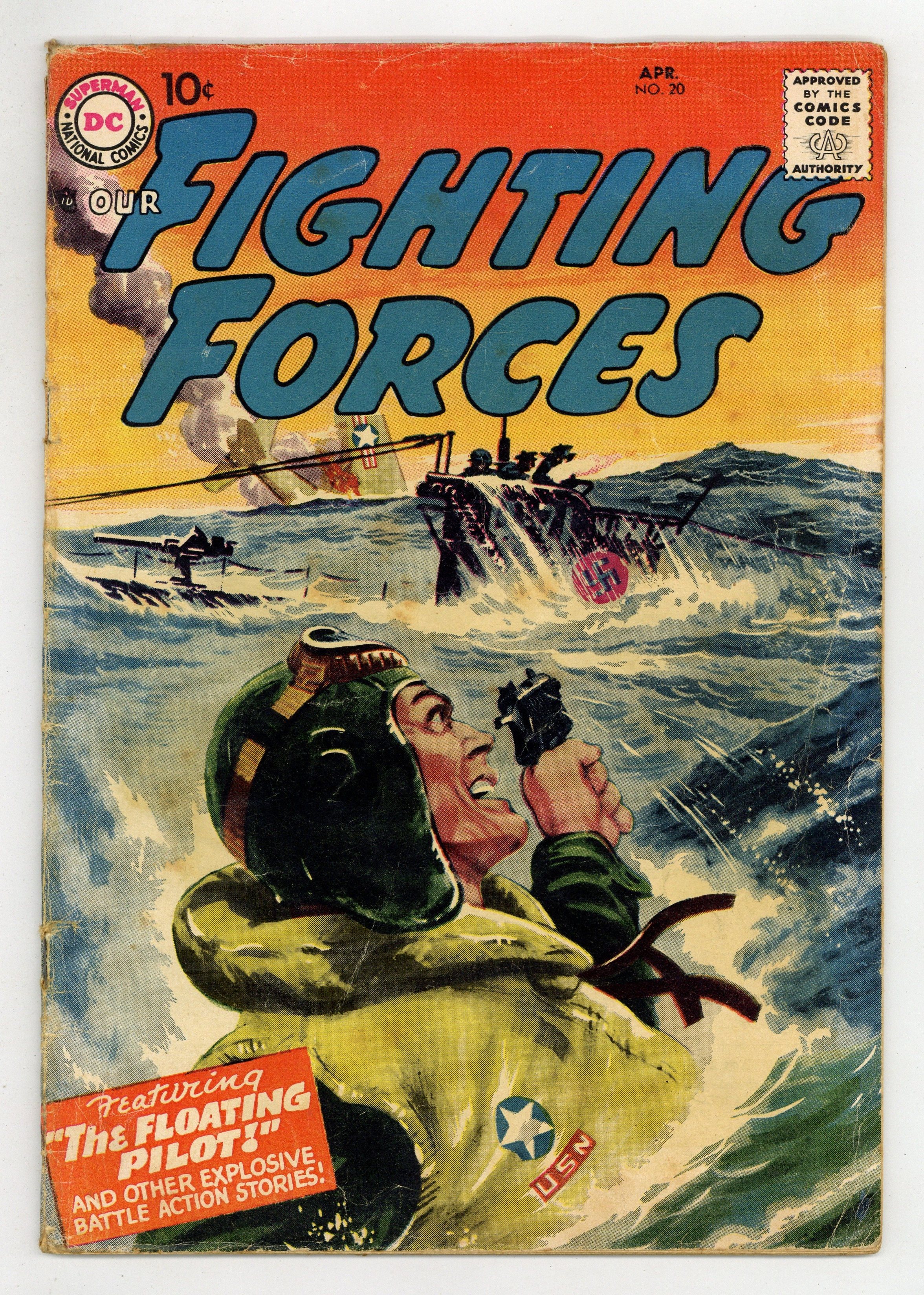 Cover by Jerry Grandenetti and Jack Adler (wash and color). Stories by Robert Kanigher, Bob Haney and Jack Miller. Art by Ross Andru, Arthur Peddy, Mort Drucker and Mike Esposito. Explosive battle action tales! In this issue: "The Floating Pilot!" by Robert Kanigher, Ross Andru and Mike Esposito; "Combat Thumb!" by Bob Haney and Arthur Peddy; "The Weapon" by Kanigher, Andru and Esposito; and "Ring Around the Battlefield" by Jack Miller and Mort Drucker. Plus: 1-pager "Always in Front!" And: 2-page text story "Soldiers at Sea"! 36 Pages, Full Color. Cover price $0.10.