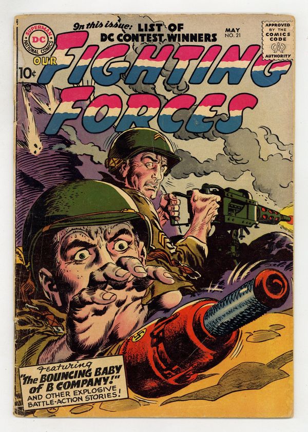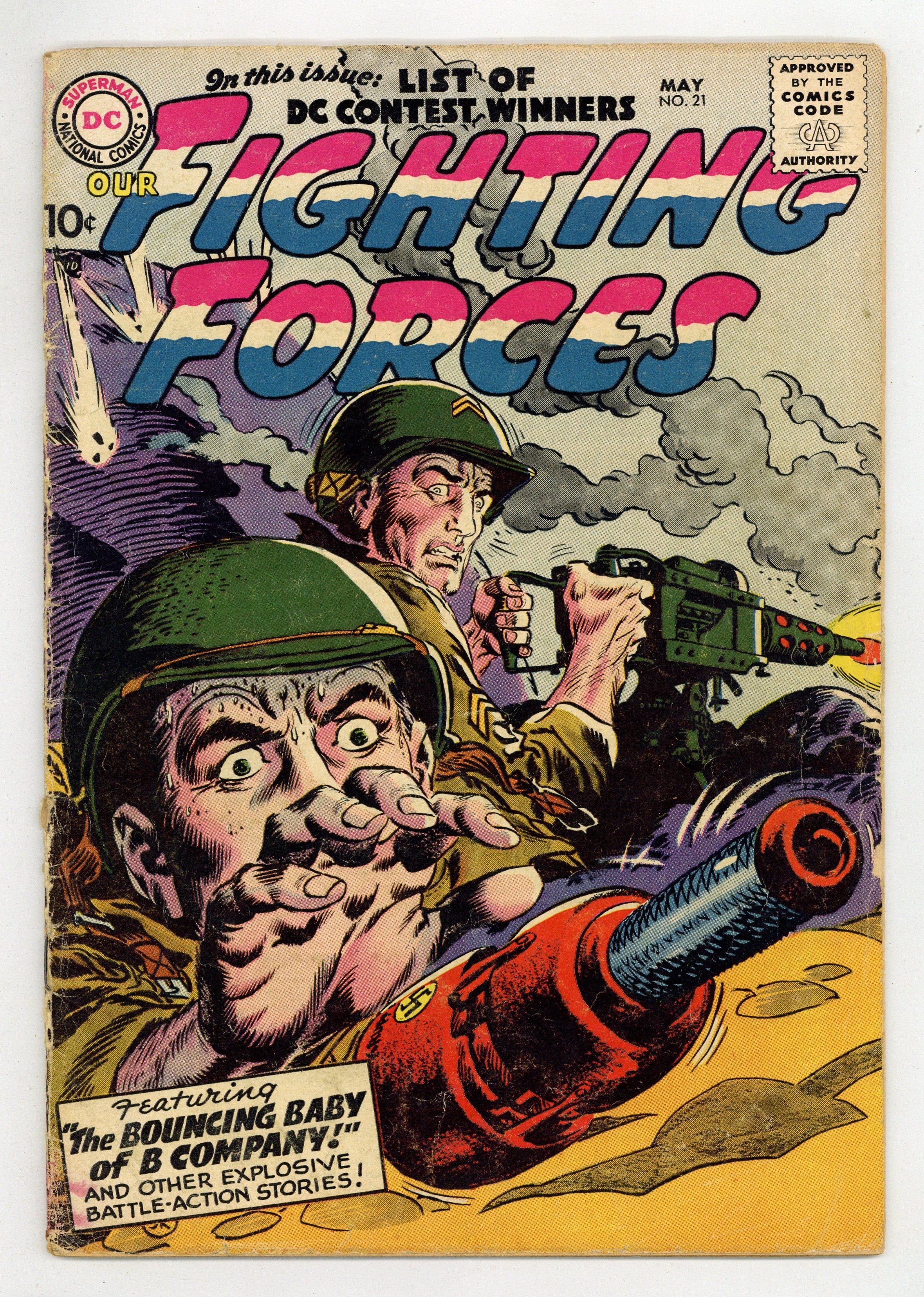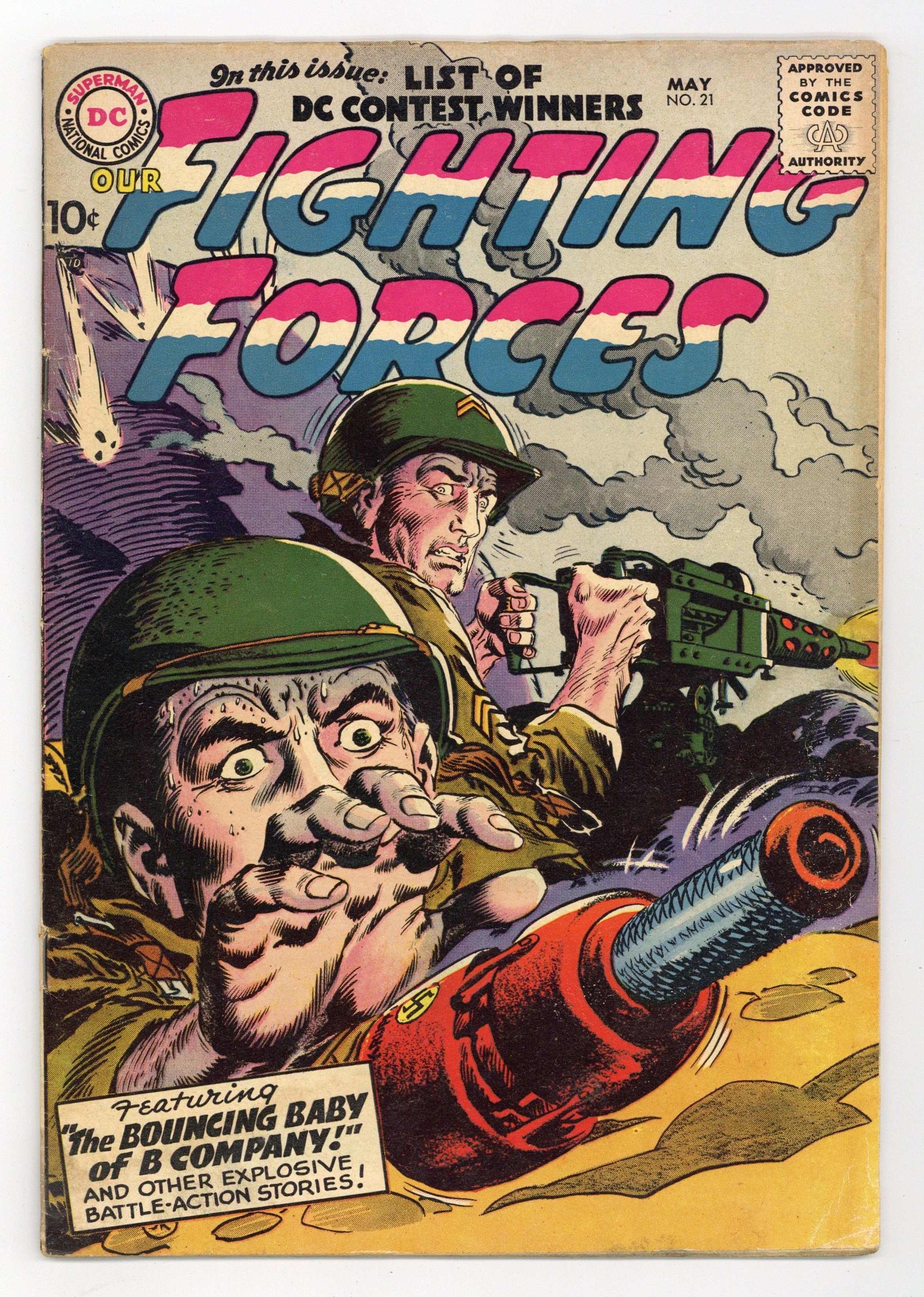 Cover by Joe Kubert. Stories by Bill Finger, Bob Haney and Jack Miller. Art by Ross Andru, Jerry Grandenetti, Mike Esposito and Robert Stuart. Explosive battle action tales! In this issue: "The Bouncing Baby of B Company!" by Bill Finger, Ross Andru and Mike Esposito; "One Man Task Force!" by Bob Haney and Jerry Grandenetti; "Borrowed War!" by Jack Miller, Grandenetti and Robert Stuart; and "Lonely Captain" by Haney, Andru and Esposito. Plus: 1-page story "The Buffalo Regiment!" And: Private Pete 1-pager by Henry Boltinoff, reprinted from Here's Howie Comics (1952) #6. 36 Pages, Full Color. Cover price $0.10.
