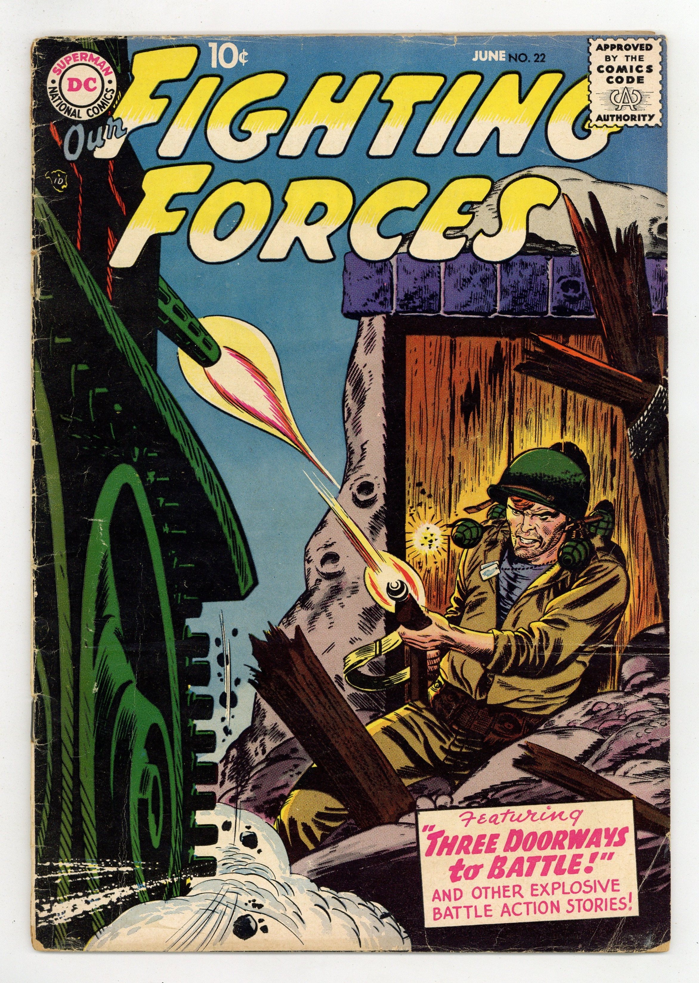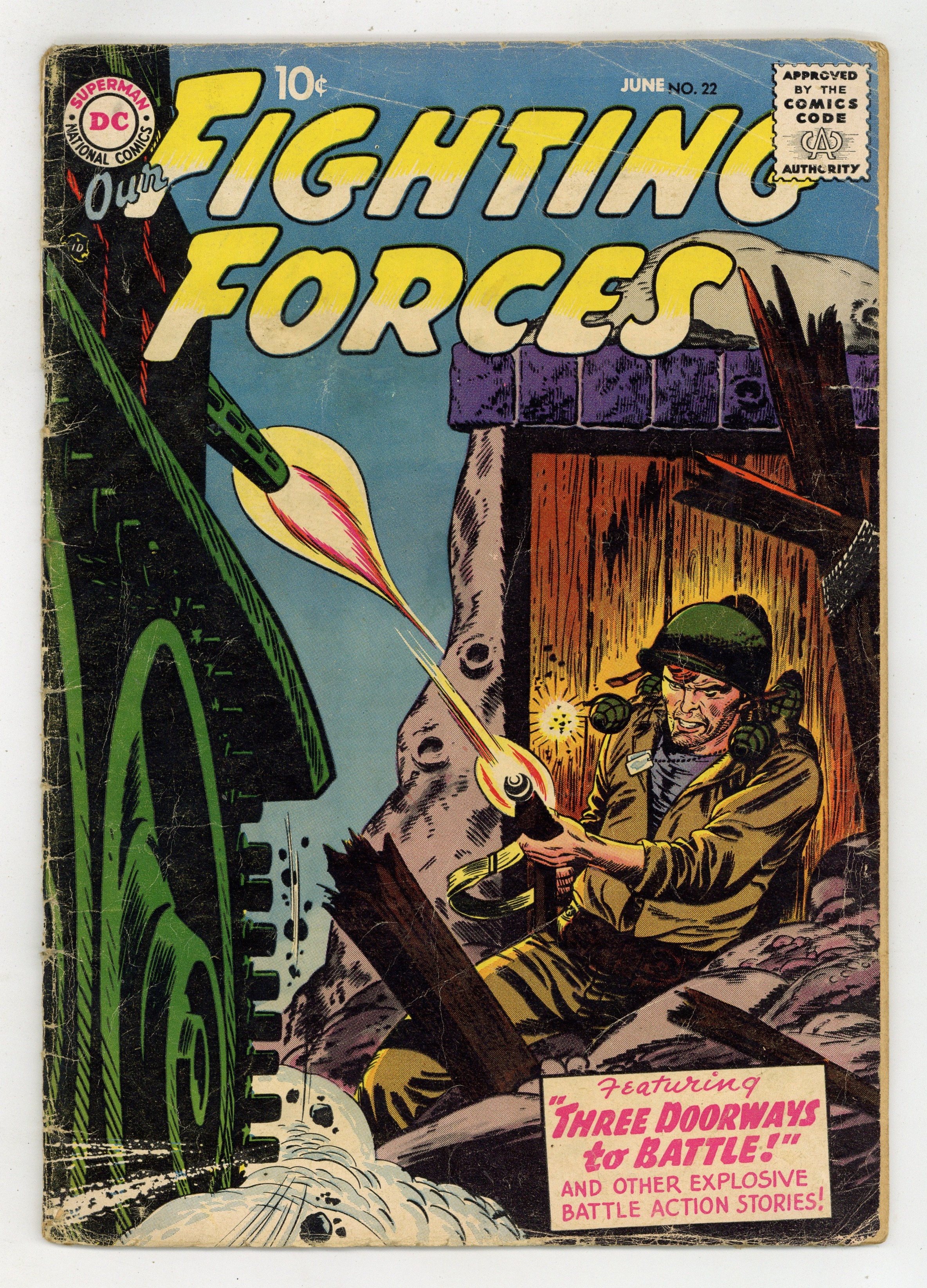 Cover by Jerry Grandenetti. Stories by Robert Kanigher and Bob Haney. Art by Joe Kubert, Arthur Peddy, Ross Andru, Jerry Grandenetti and Mike Esposito. Explosive battle action tales! In this issue: "3 Doorways to War!" by Robert Kanigher and Joe Kubert; "TNT Passenger!" by Bob Haney and Arthur Peddy; "Battle Slot!" by Haney, Ross Andru and Mike Esposito; and "Count the Guys on Hill 90!" by Haney and Jerry Grandenetti. Plus: 2-page text article "Putting the Bark in the Big Guns"! And: Army Almanac! half-pager. 36 Pages, Full Color. Cover price $0.10.