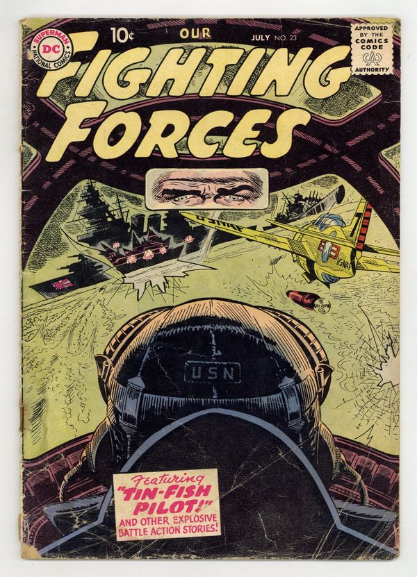 Cover by Jerry Grandenetti. Stories by Robert Kanigher, Bill Finger and Ed Herron. Art by Ross Andru, Irv Novick, Jack Abel, Joe Kubert and Mike Esposito. Explosive battle action tales! In this issue: "Tin Fish Pilot!" by Robert Kanigher, Ross Andru and Mike Esposito; "Police Up the Area!" by Bill Finger and Irv Novick; "Rookie Tank!" by Ed Herron and Jack Abel; and "Don't Fire Back!" by Herron and Joe Kubert. Plus: 2-page text article "Mighty Missy"; Aviation Almanac! half-pager; and Shorty 1-pager by Henry Boltinoff, reprinted from Star Spangled War Stories (1952 DC #3-204) #4. 36 Pages, Full Color. Cover price $0.10.