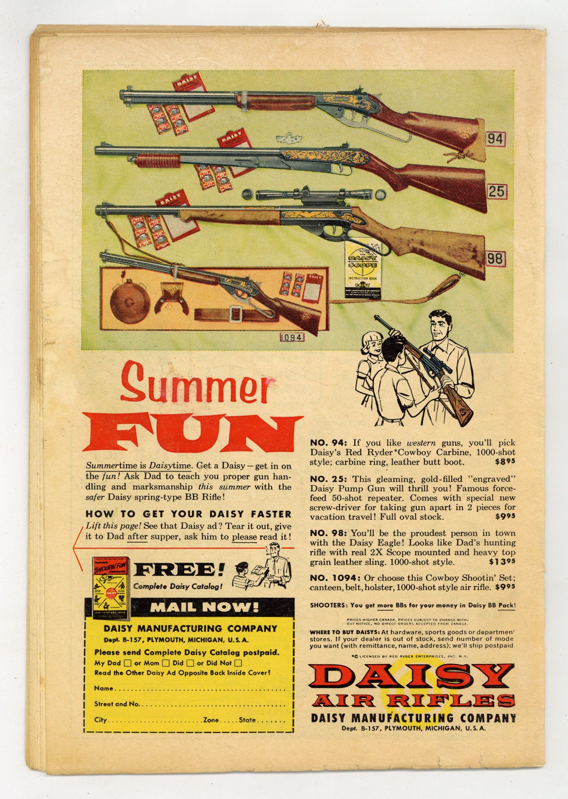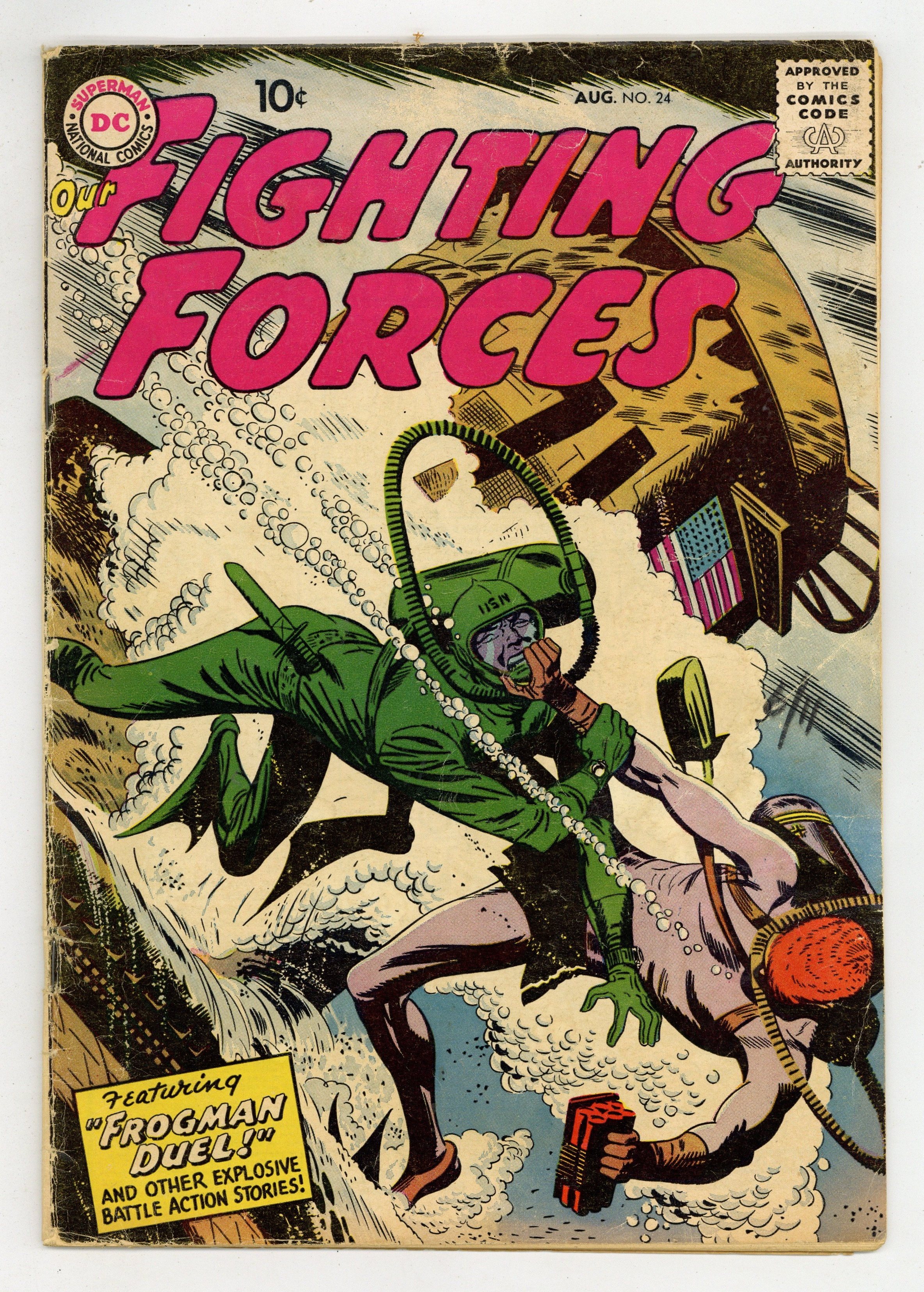 Cover by Jerry Grandenetti. Stories by Robert Kanigher, Ed Herron, Bill Finger and Bob Haney. Art by Ross Andru, Jerry Grandenetti, Russ Heath, Joe Kubert and Mike Esposito. Explosive battle action tales! In this issue: "Frogman Duel!" by Robert Kanigher, Ross Andru and Mike Esposito; "Keep Going!" by Ed Herron and Jerry Grandenetti; "A Bundle for Baker!" by Bill Finger and Russ Heath; and "The Wall Around the War!" by Bob Haney and Joe Kubert. Plus: 1-page story "Rock of Chickamauga!"; Navy Log! half-pager; 1-page text article "Guided Missile Cruiser"; and Private Pete 1-pager by Henry Boltinoff, reprinted from Star Spangled War Stories (1952 #131-133) #131. 36 Pages, Full Color. Cover price $0.10.