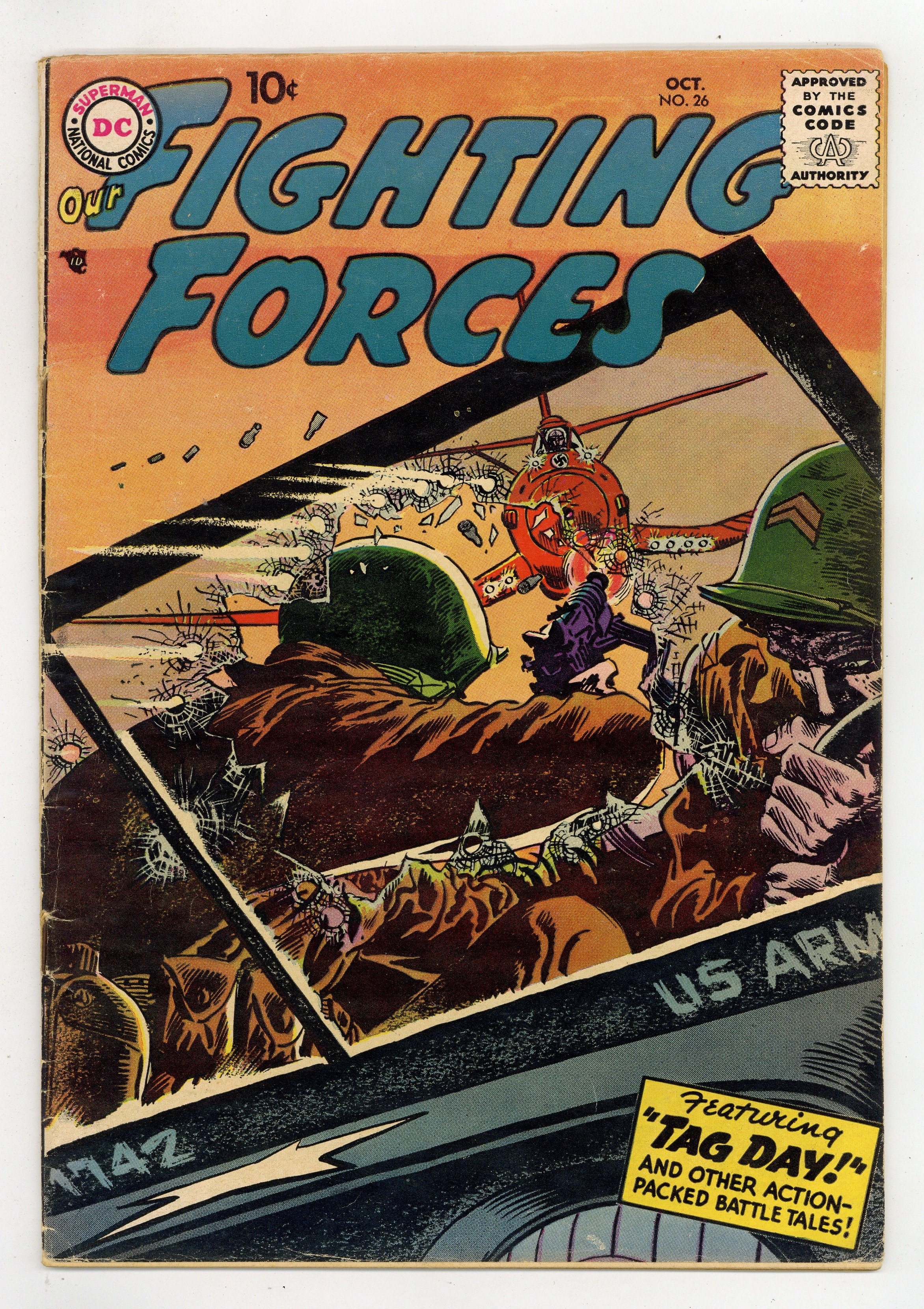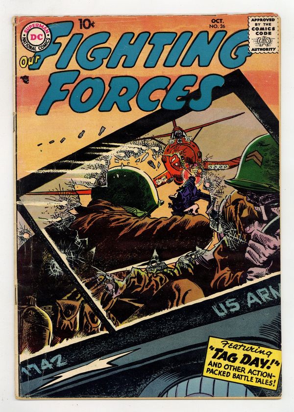 Cover by Jerry Grandenetti. Stories by Robert Kanigher, Bob Haney and Bill Finger. Art by Russ Heath, Irv Novick, Jack Abel and Jerry Grandenetti. Action-packed battle tales! In this issue: "Tag Day!" by Robert Kanigher and Russ Heath; "Battle Light for Easy!" by Bob Haney and Irv Novick; "Finger Man!" by Haney and Jack Abel; and "The Soldier Without a Name!" by Bill Finger and Jerry Grandenetti. Plus: 1-page story "The Gimlet Regiment!" And: General Little 1-pager by Irwin Hasen, reprinted from Our Army at War (1952) #19. 36 Pages, Full Color. Cover price $0.10.