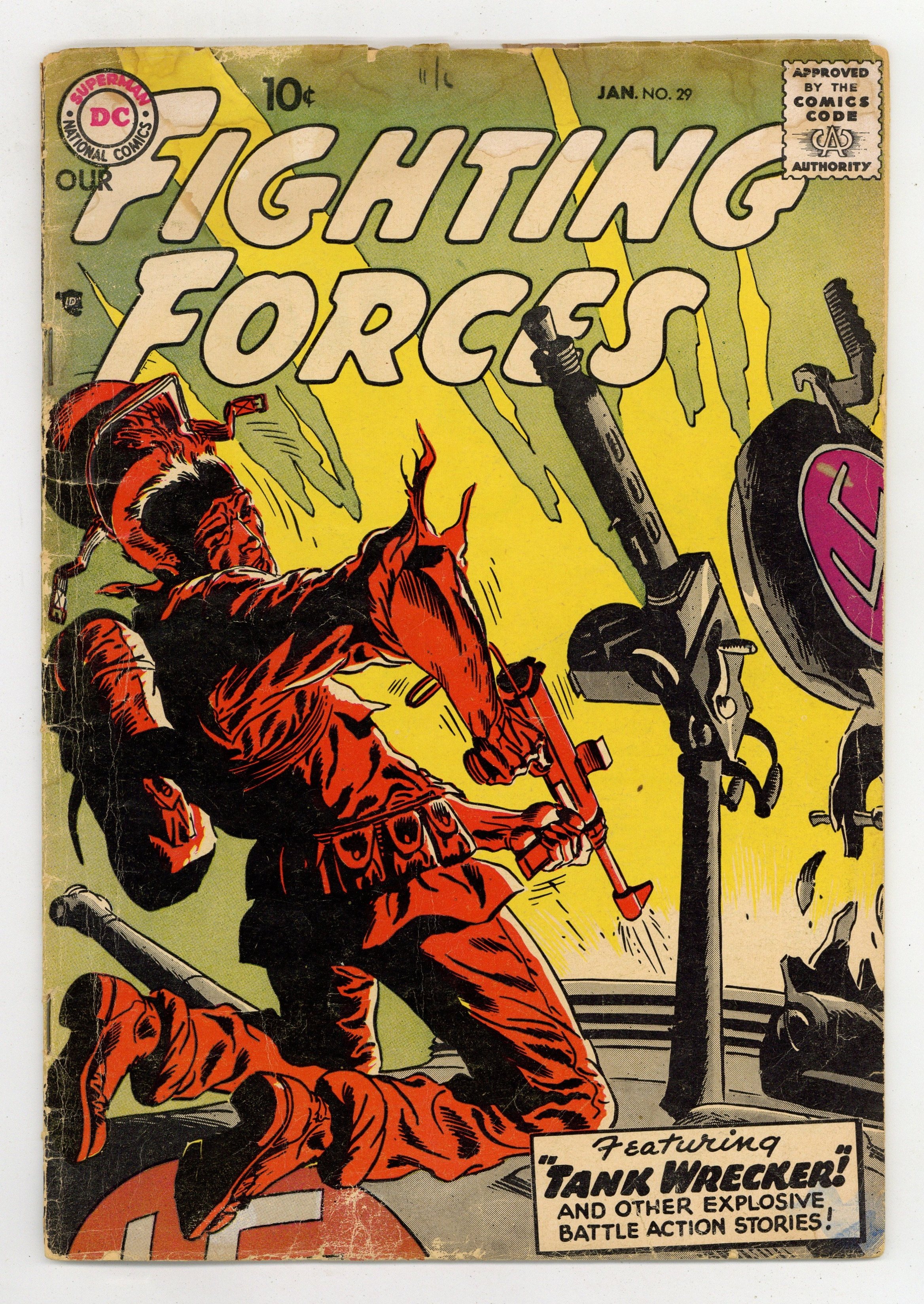 Cover by Joe Kubert. Stories by Bob Haney, Ed Herron, Bill Finger and Julius Schwartz. Art by Joe Kubert, Jack Abel, Carmine Infantino, Jerry Grandenetti, Morris Waldinger, Frank Giacoia and Tommy Nicolosi. Explosive battle action tales! In this issue: "Letter to a Jet!" by Bob Haney and Joe Kubert; "Bottom of the War!" by Ed Herron and Jack Abel; "No Identity!" by Bill Finger, Carmine Infantino and Frank Giacoia; "Tank Wrecker!" by Haney and Jerry Grandenetti; War Words 1-pager by Julius Schwartz, Morris Waldinger and Tommy Nicolosi; and 1-page story "The Palmetto Regiment" by Schwartz, Waldinger and Nicolosi. Plus: Private Pete 1-pager by Henry Boltinoff, reprinted from Batman (1940) #69. 36 Pages, Full Color. Cover price $0.10.