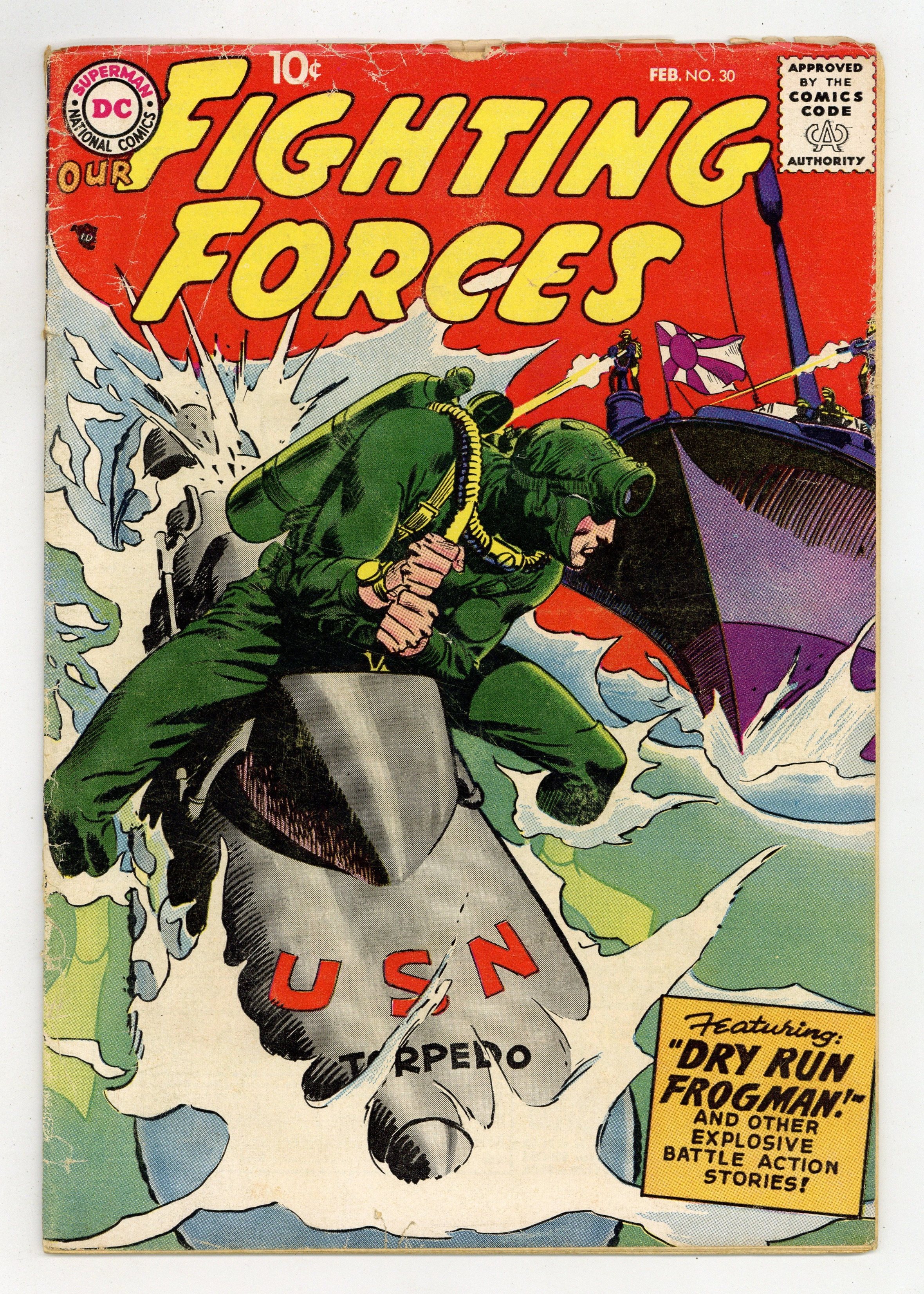 Cover by Joe Kubert. Stories by Robert Kanigher, Bill Finger, Ed Herron and Bob Haney. Art by Ross Andru, Irv Novick, Jack Abel and Mike Esposito. Explosive battle action tales! In this issue: "Fort for a Gunner" by Robert Kanigher, Ross Andru and Mike Esposito; "War Is a One-Way Street!" by Bill Finger and Irv Novick; "Don't Miss!" by Ed Herron and Jack Abel; and "Dry Run Frogman!" by Bob Haney and Novick. Plus: 1-page story "The Century Division"; War Words half-pager; Shorty half-pager by Henry Boltinoff, reprinted from Star Spangled War Stories (1952 DC #3-204) #8; and Private Pete 1-pager by Boltinoff, reprinted from Our Army at War (1952) #15. 36 Pages, Full Color. Cover price $0.10.