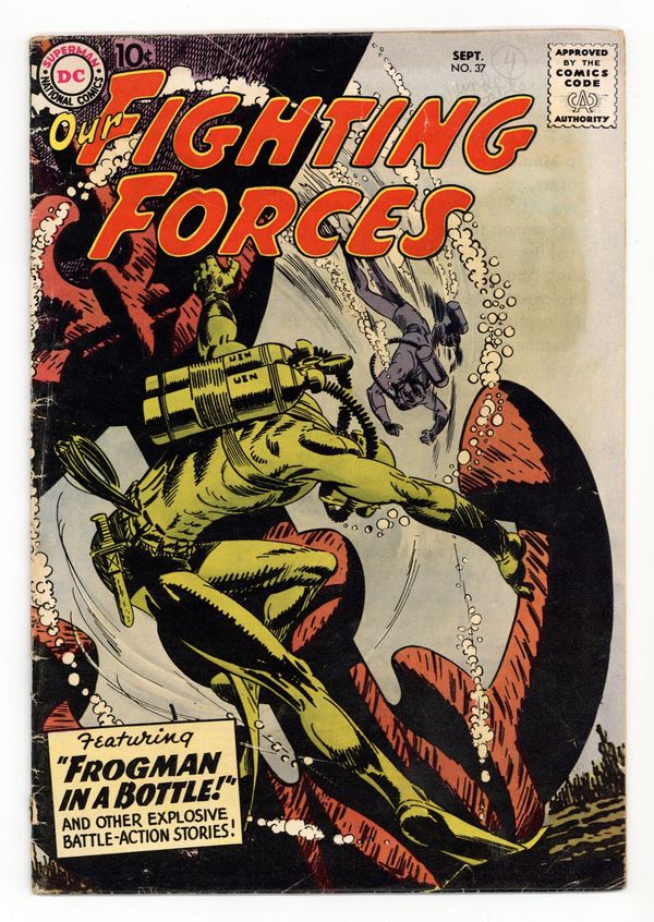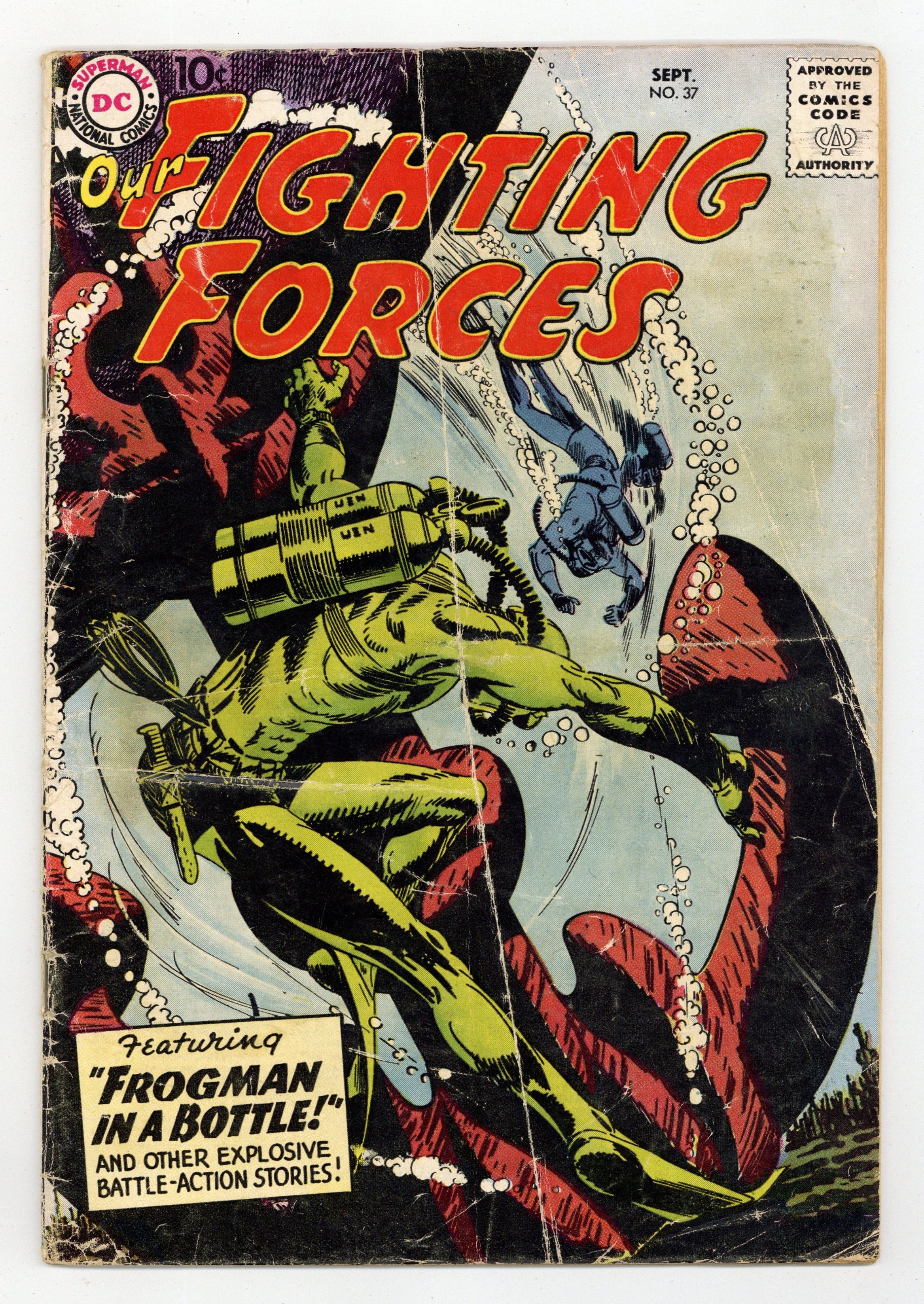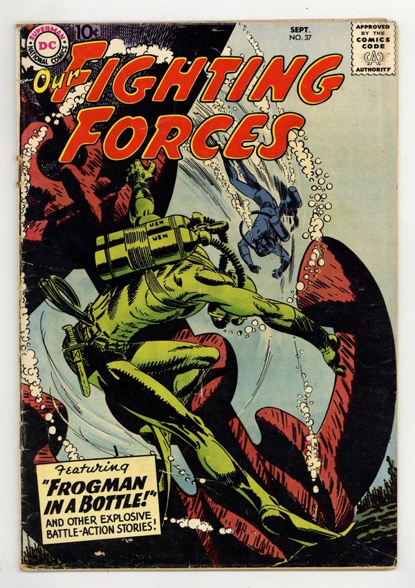 Cover by Joe Kubert. Stories by Robert Kanigher, Ed Herron and Bill Finger. Art by Jerry Grandenetti, John Severin, Jack Abel and Robert Stuart. Explosive battle action tales! In this issue: "Frogman in a Bottle" by Robert Kanigher and Jerry Grandenetti; "T.N.T. Can Opener!" by Ed Herron, John Severin and Robert Stuart; and "Way Out in Front!" by Bill Finger and Jack Abel. Plus: 2-page story "The Angels...Battle Story of the 11th Airborne Division"! And: Khaki-Yaks half-pager by Irwin Hasen, reprinted from Here's Howie Comics (1952) #12. 36 Pages, Full Color. Cover price $0.10.