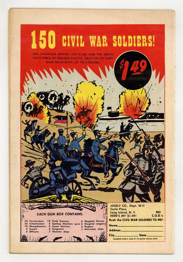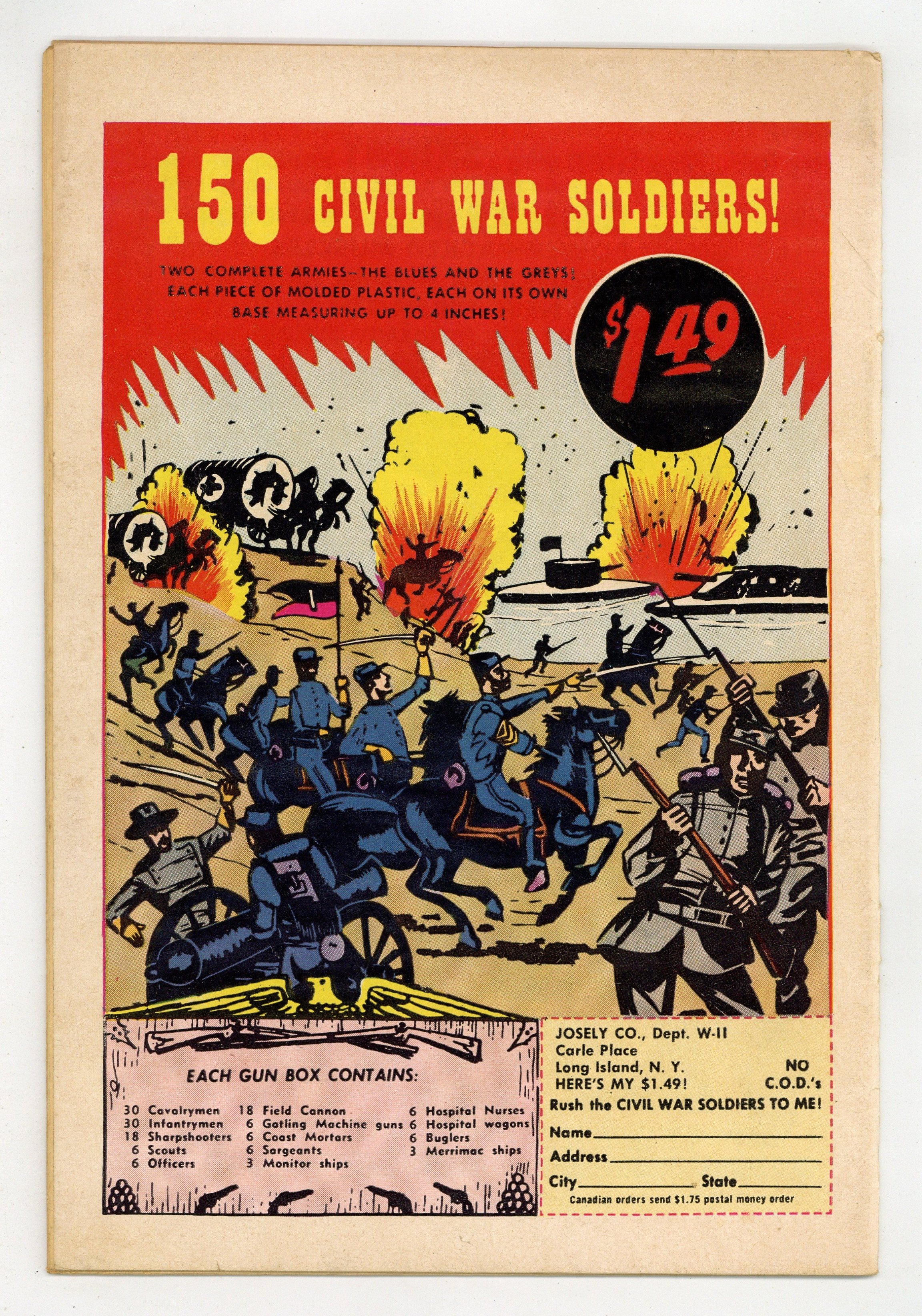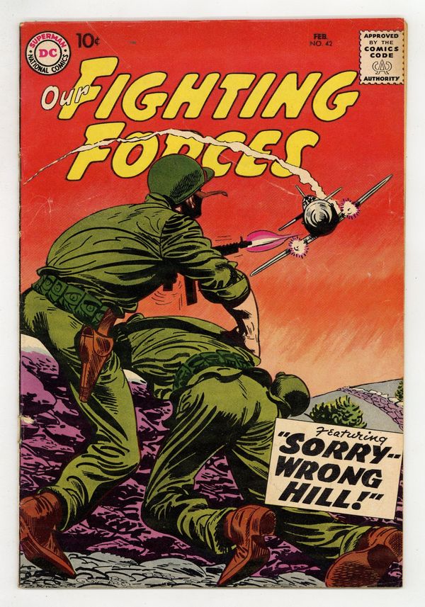 Cover by Jerry Grandenetti. Stories by Robert Kanigher, Bob Haney and Bill Finger. Art by Ross Andru, Russ Heath, Mort Drucker and Mike Esposito. Explosive battle action tales! In this issue: "Sorry - Wrong Hill!" by Robert Kanigher, Ross Andru and Mike Esposito; "Bull's-Eye Fort!" by Bob Haney and Russ Heath; and "Fire Jumper!" by Bill Finger and Mort Drucker. Plus: 1-page story "First in Aviation!"; 1-page story "Let 'Em Have It!"; and Private Pete 1-pager, reprinted from Here's Howie Comics (1952) #15. 36 Pages, Full Color. Cover price $0.10.