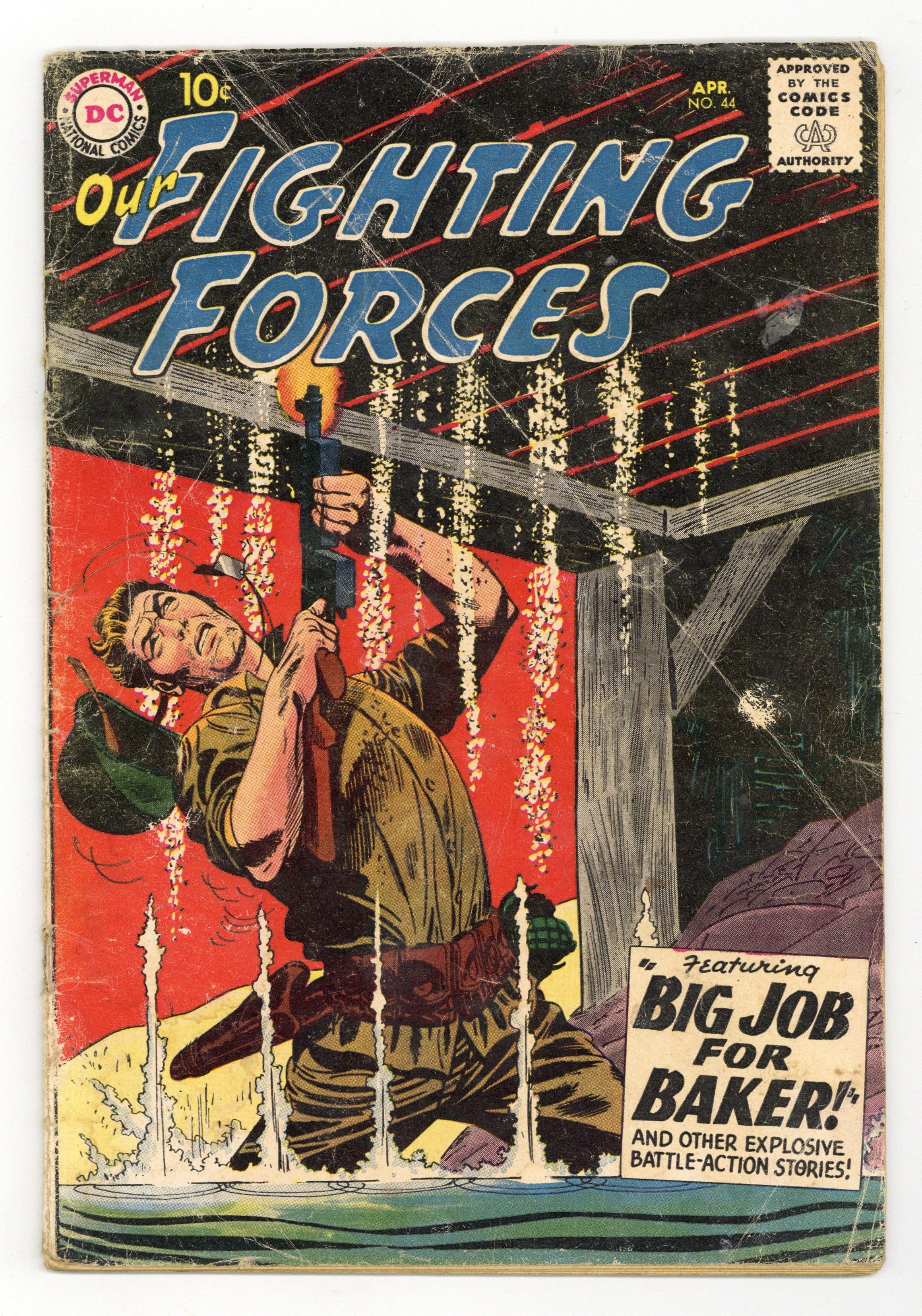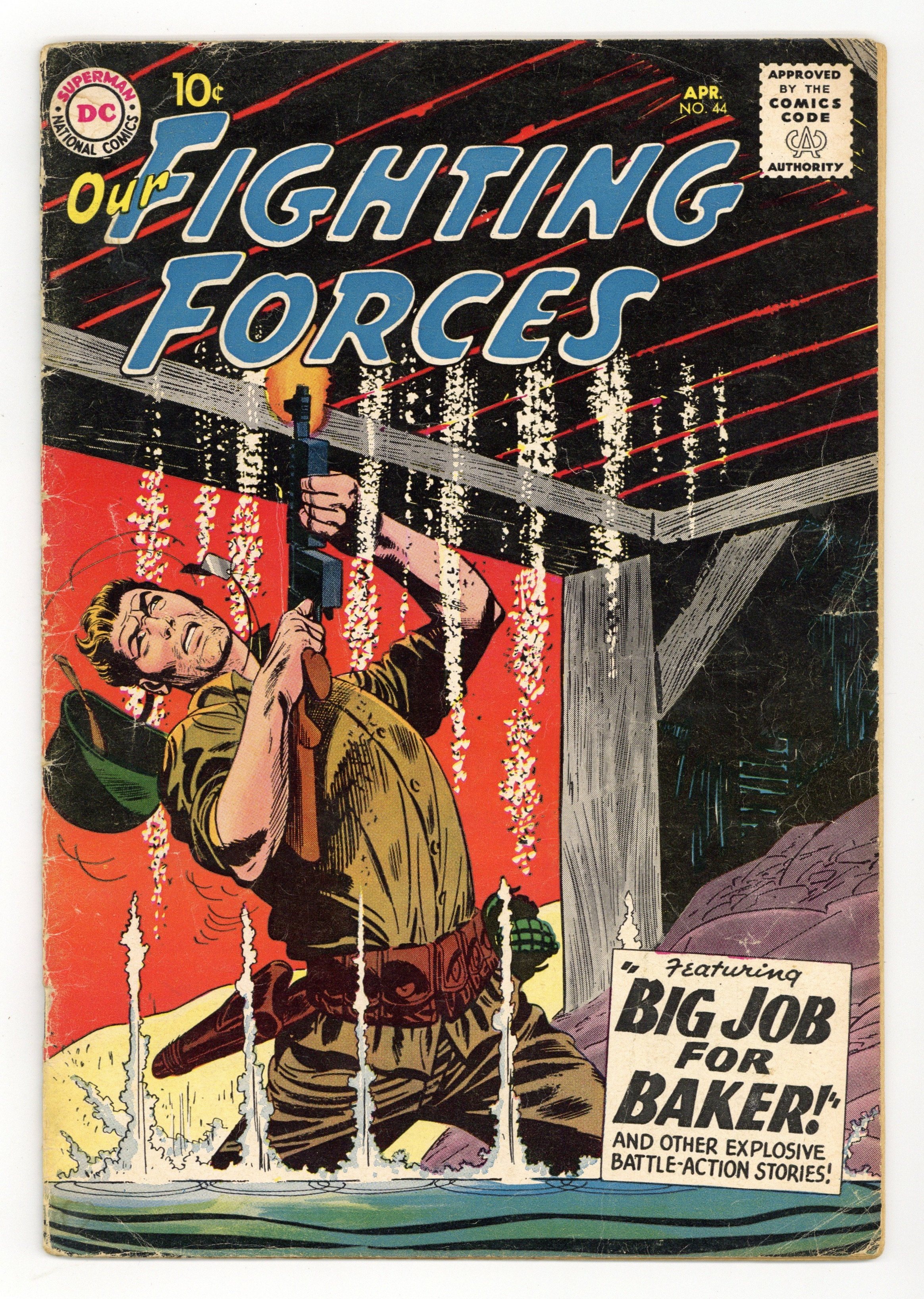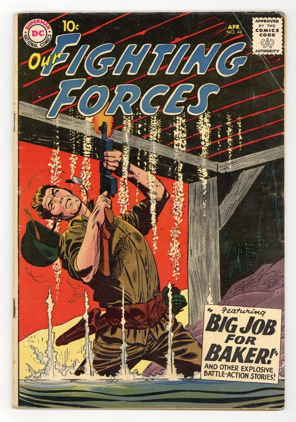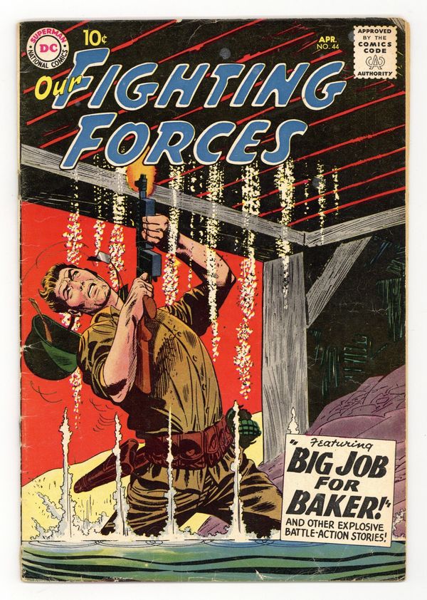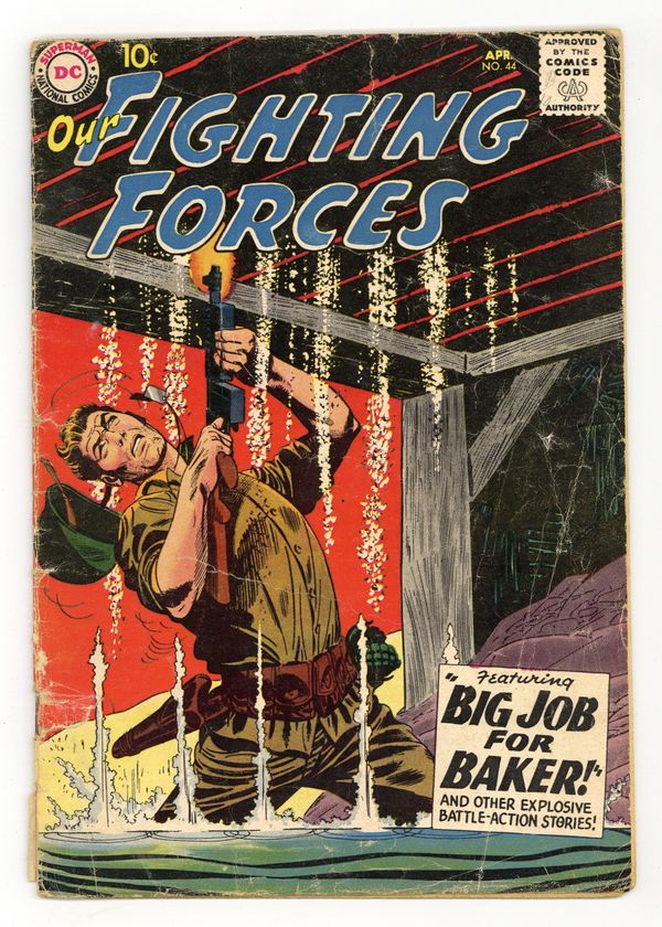 Cover by Jerry Grandenetti. Stories by Bob Haney. Art by Mort Drucker, Russ Heath, Ross Andru and Mike Esposito. Explosive battle action tales! In this issue: "Big Job for Baker" by Bob Haney and Mort Drucker; "Torpedo Bait!" by Haney and Russ Heath; "Last Man In!" by Haney, Ross Andru and Mike Esposito; and "Ready Rifle!" by Haney, Andru and Esposito. Plus: 2-page story "Thunder from Heaven...Battle Story of the 18th Airborne Division"! And: This Ain't the Army 1-pager by Irwin Hasen, reprinted from Our Army at War (1952) #20. 36 Pages, Full Color. Cover price $0.10.