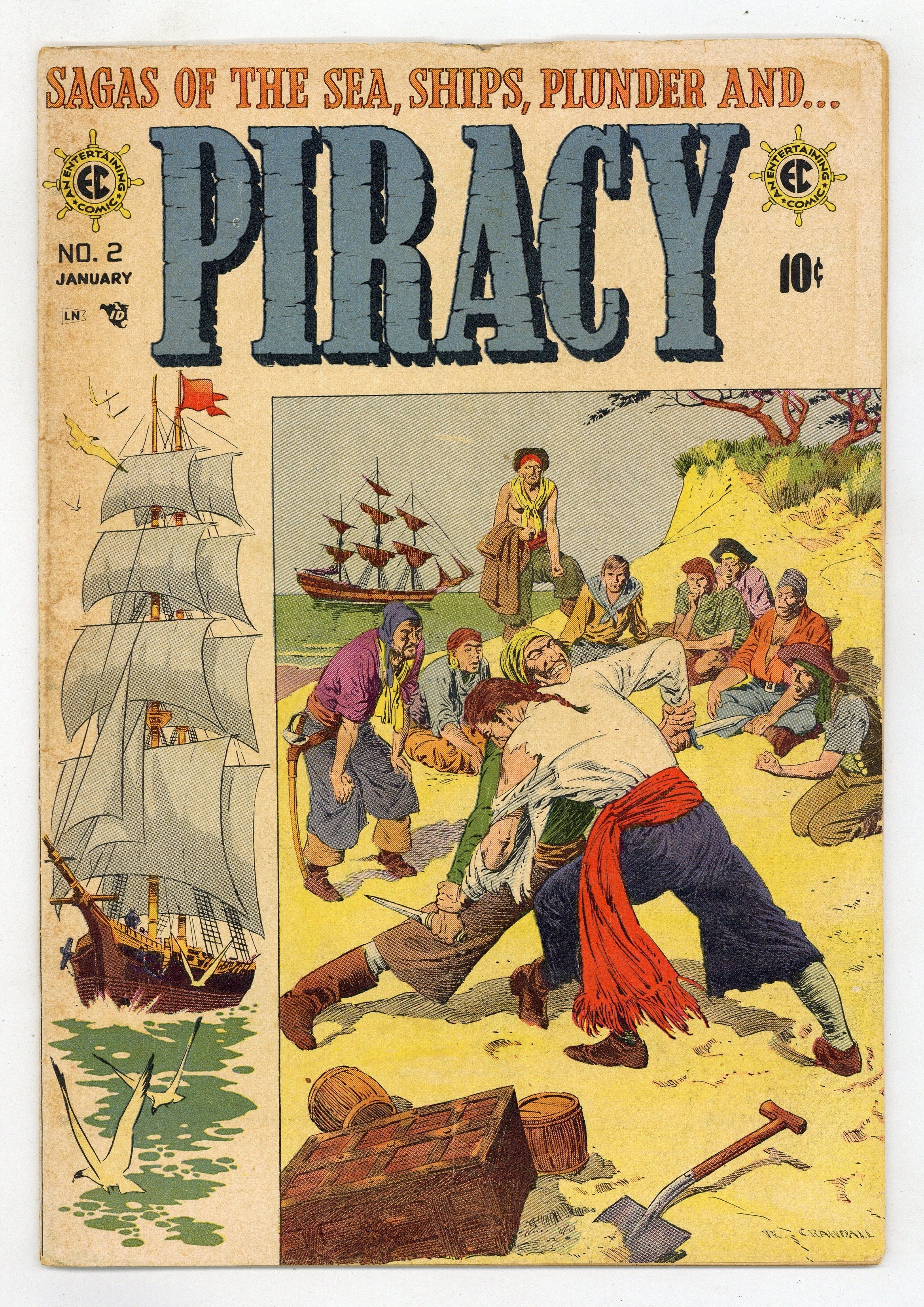 Cover by Reed Crandall. Stories by Carl Wessler and others. Art by Wally Wood, Al Williamson, Angelo Torres, Jack Davis, and Reed Crandall. One of EC Comics' early New Direction titles, featuring pre-Code tales of piracy on the high seas. Wally Wood's art highlights a Cain and Abel story played out on the pirate decks. A pre-Code tale of murder and mutiny with art by Jack Davis. A pirate ship on its way home encounters a Dutch merchant vessel. The cover is inspired by the 1911 Howard Pyle painting "Who Shall Be Captain?" Sea Food; Kismet; Loblolly Boy; The Shell Game; The Dive; A Fitting End. 32 pages, Full Color. Cover price $0.10.