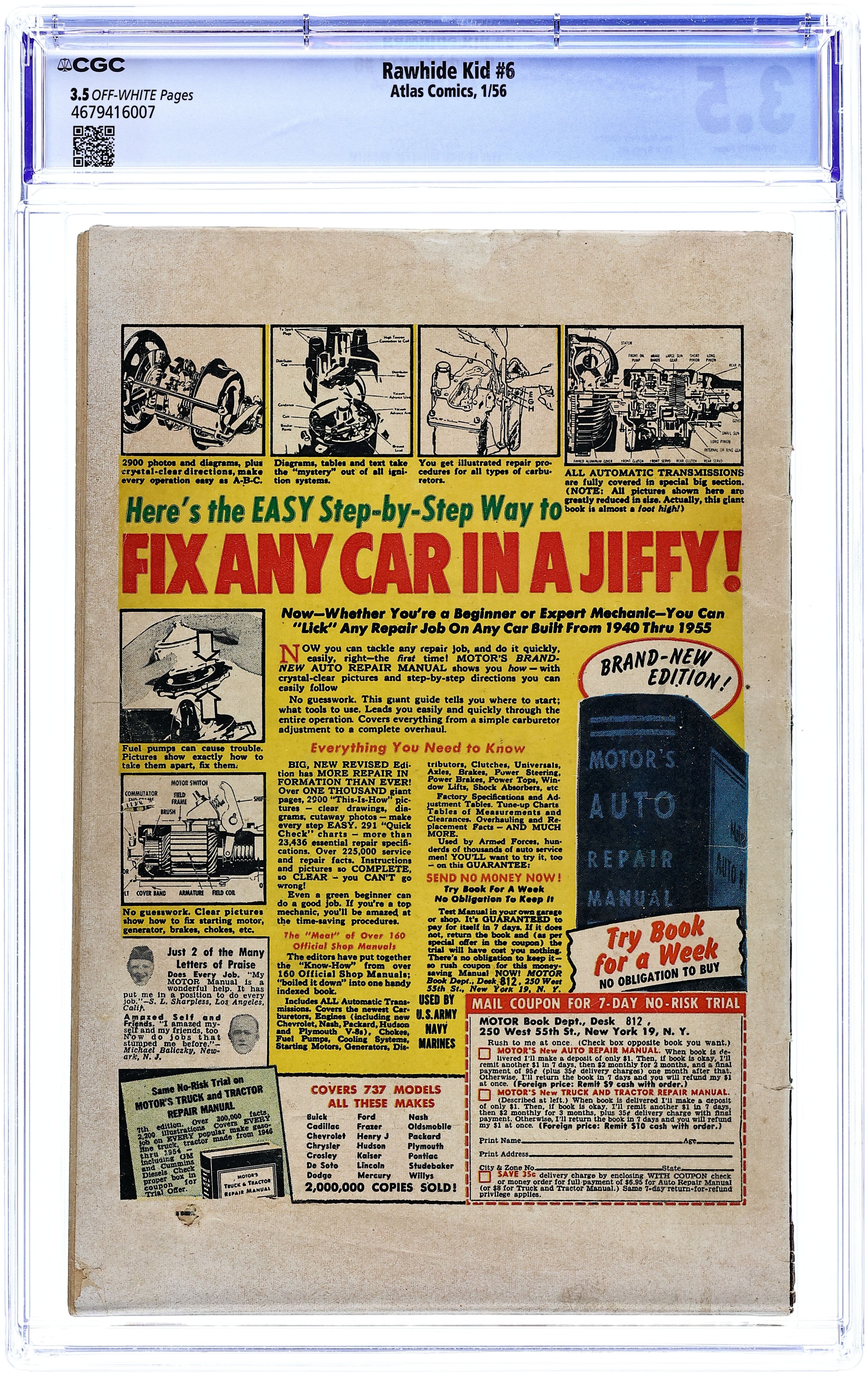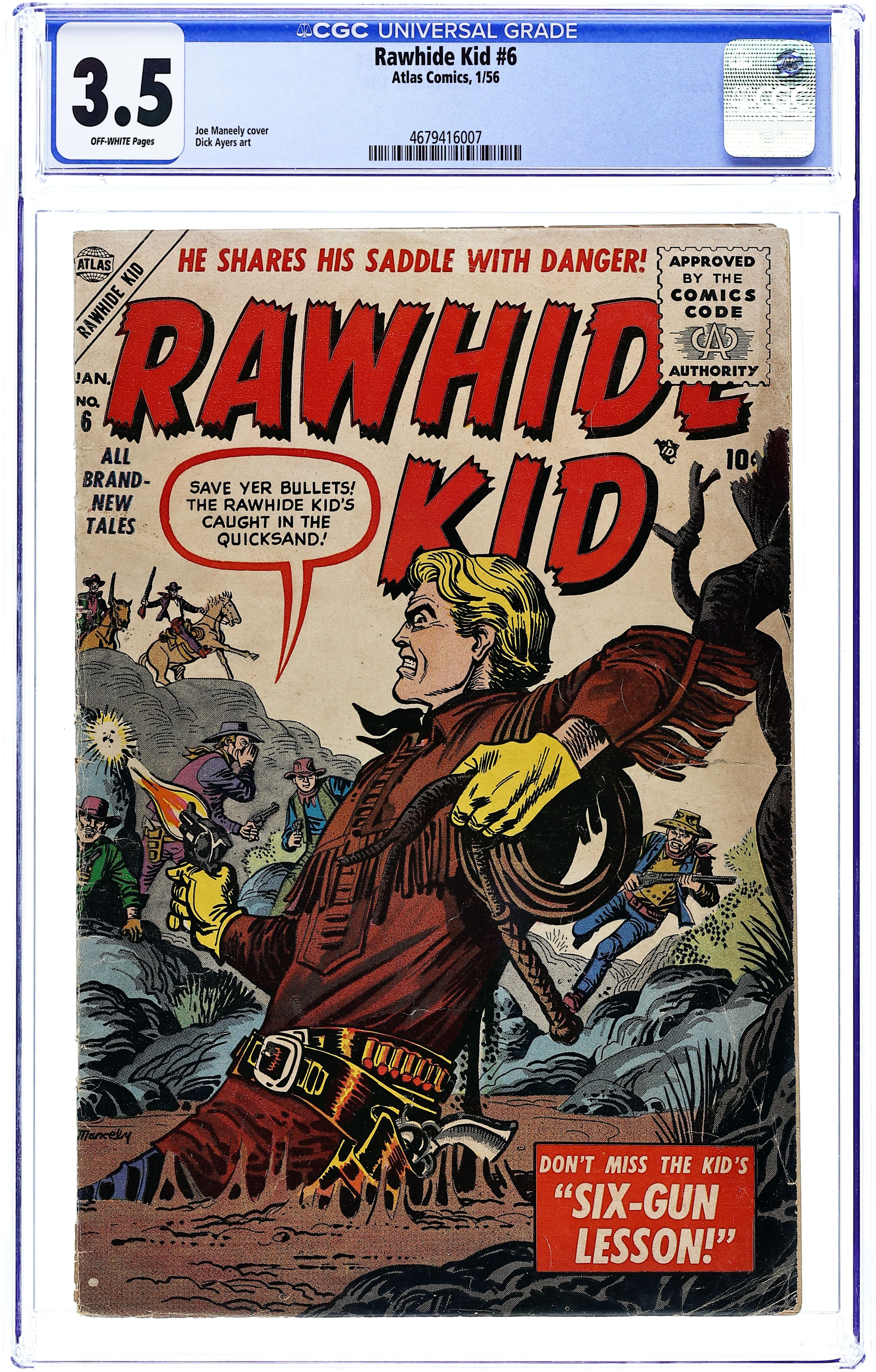 Cover art by Joe Maneely. "Quicksand!", pencils by Dick Ayers, inks by Ernie Bache; The Rawhide Kid and his young ward Randy Clayton are out on a ride when they spot a coyote chasing a rabbit near a patch of quicksand; They watch as the rabbit tricks the coyote into following him into the quicksand, the coyote gets stuck but the rabbit manages to flee; After saving the coyote from the quicksand, the Kid and Randy decide to investigate how the rabbit managed to survive. "Showdown" text story. "Six Gun Lesson!", pencils by Dick Ayers, inks by Ernie Bache; The Rawhide Kid happens past the ranch owned by a man named Barlow and witnesses him whipping one of his horses; Disliking how the horse is being treated the Kid pulls his gun and shoots the whip and then roughs up Barlow and his men; When he notices that all the horses have the Circle Q brand on them, Barlow tells the Kid that he bought the horses fair. "Sting of the Hornet!", pencils by Dick Ayers, inks by Ernie Bache; The Rawhide Kid is out for a ride where he comes across a dead body; Suspecting who the dead man might be, the Kid cannot know for sure because the man's guns are missing; After burying the dead man the Rawhide Kid returns to town and finds it under alert due to a sighting of an outlaw gunslinger named the Hornet. "Untamed!" "Trail to Ruin!", pencils by Dick Ayers, inks by Ernie Bache; The Rawhide Kid comes upon a freshly robbed stage coach and frees the tied up riders learning that they were robbed by a bunch of young kids. 36 pgs., full color. Cover price $0.10.