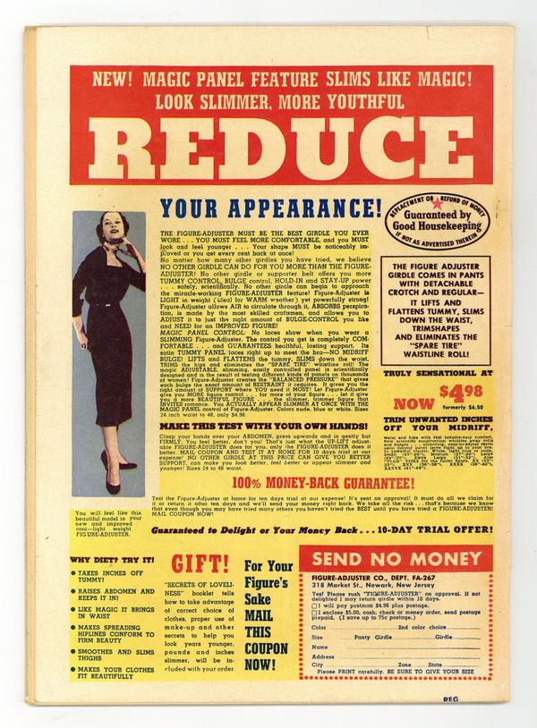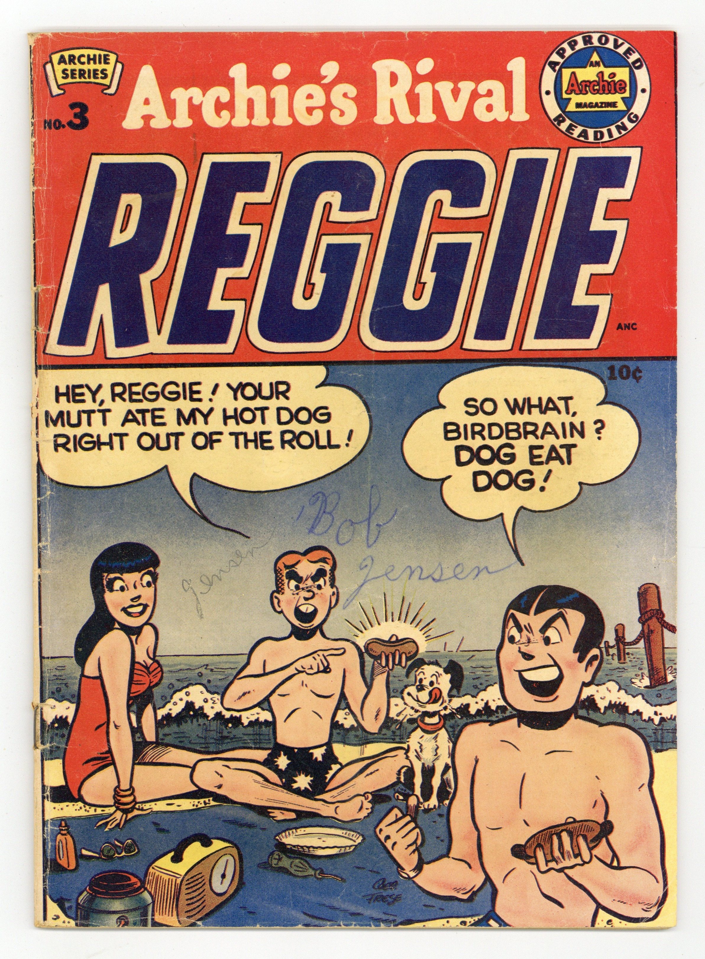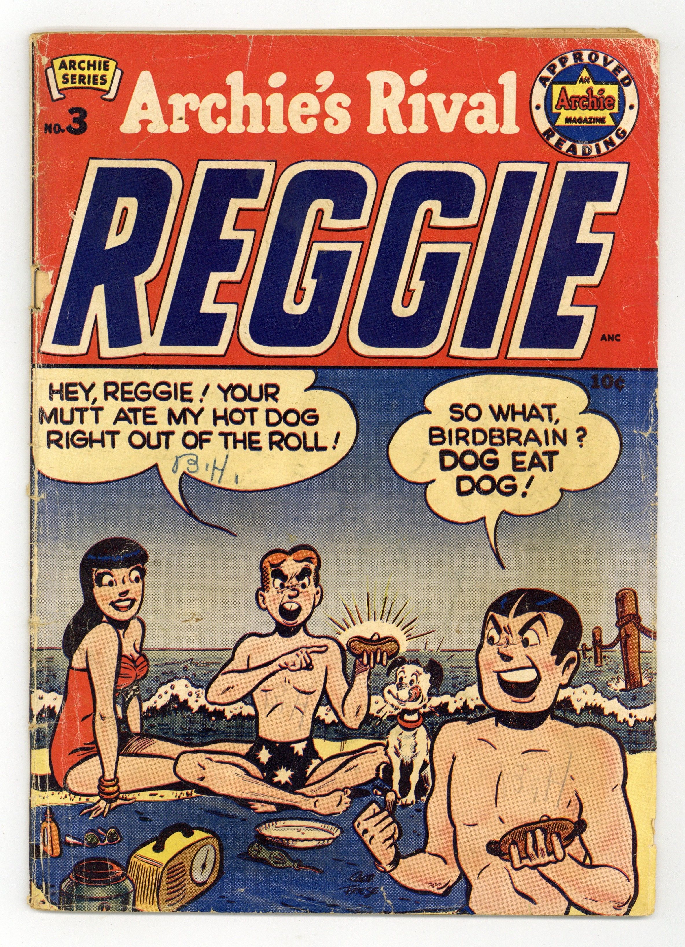 Cover art by George Frese. "Call of the Wild," pencils by George Frese; After getting pranked with a hot foot by Reggie Jughead decides to play a prank on Reggie using hypnotism. "Come Sit with Me," pencils by George Frese; Archie starts a baby-sitting operation with Betty, Veronica and Jughead as his sitters and this takes Veronica's time away from Reggie so he calls in to the service with a disguised voice so Veronica will come and babysit him; He dresses up like a baby as a gag but it's not Veronica who shows up. "Hot Seat," pencils by George Frese; Reggie buys an electric cushion that gives shocks to anyone who sits on it and he tries to use it on Archie but Miss Grundy sits on it instead. "On the Rocks"; Reggie gets injured from diving in shallow water. "The Tree Bears," pencils by George Frese; Archie has a plan to earn money to take Veronica to the dance and Reggie tries to spoil Archie's money-making plans. "Reggie's Good Deed!"; Reggie overhears the doctor telling Archie that his hangnail will be gone in three days but Reggie doesn't get the whole conversation and thinks Archie is dying so he gets everyone together to raise money to send Archie to New York to see a specialist. 36 pgs., full color. Cover price $0.10.