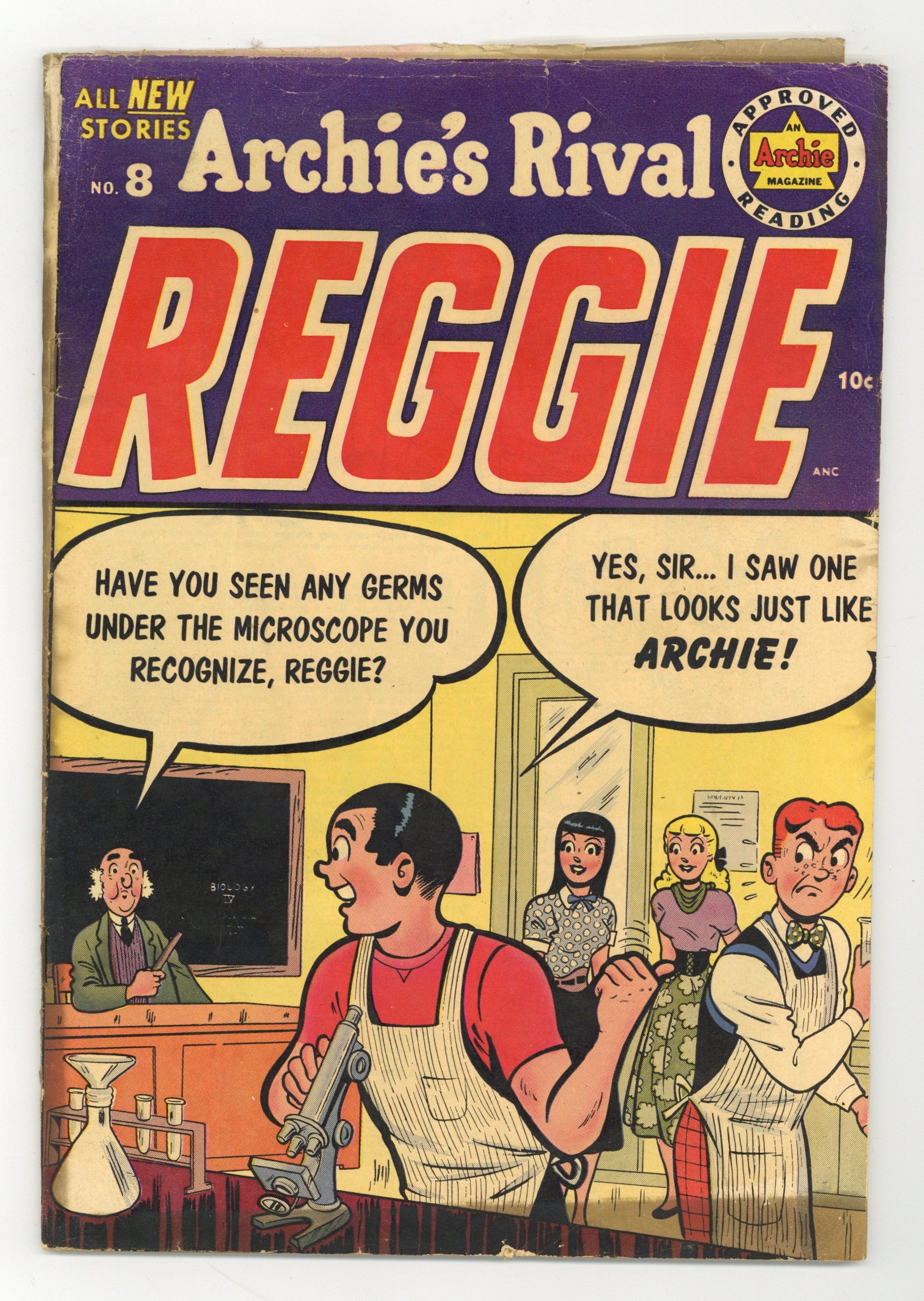 "Love it Alone"; Reggie tries to start a relationship between Miss Grundy and Mr. Weatherbee. "The Yolks On You"; Jughead has brought a basket of eggs for Miss Grundy and Reggie has a rubber egg. "Glover Come Back To Me"; Reggie was picked for the inter-high school boxing tournament and Archie is annoyed at the attention Veronica is giving him. "A Barrow of Fun"; Reggie and Jughead make a bet that Reggie can't push a load in a wheelbarrow that Jughead can. "The China Clipper!"; Reggie has a vase appraised for his mom and learns it's worth a hundred dollars. "Kiss of Death!"; Moose is going out of town, but he'll trust Jughead to take Midge to the dance. 36 pgs., full color. Cover price $0.10.