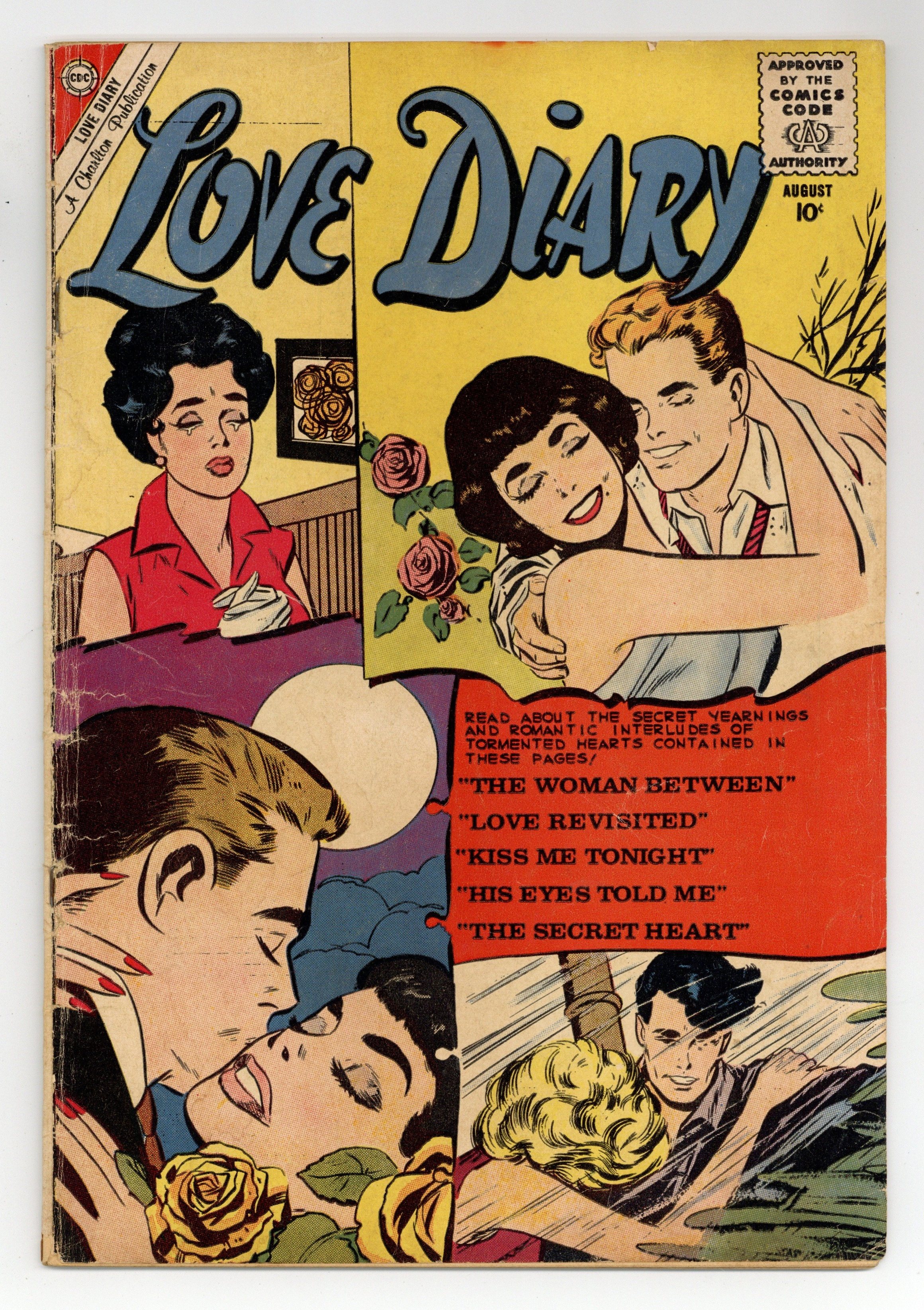 Published Aug 1960 by Charlton Publishing.$18.00Cover by Joe Sinnott and Vince Colletta. Stories and art by Joe Sinnott and Vince Colletta. Women confide tales of romance to their diaries, in a series that sometimes reflected its tumultuous times. Bessy says she's through with men, but then she meets Lester, in a story featuring early art by Joe Sinnott of Fantastic Four fame. Doris secretly longs to meet someone more exciting than Mel, but it turns out Mel has a secret of his own. Sally loves widower Stan and his son Denny, but sometimes feels she can never live up to Denny's mother. The Woman Between; Love Revisited; Kiss Me Tonight; Love Laughs a Laugh; His Eyes Told Me; Secret Heart. 32 pages, Full Color. Cover price $0.10.