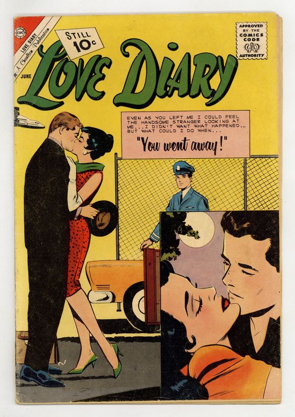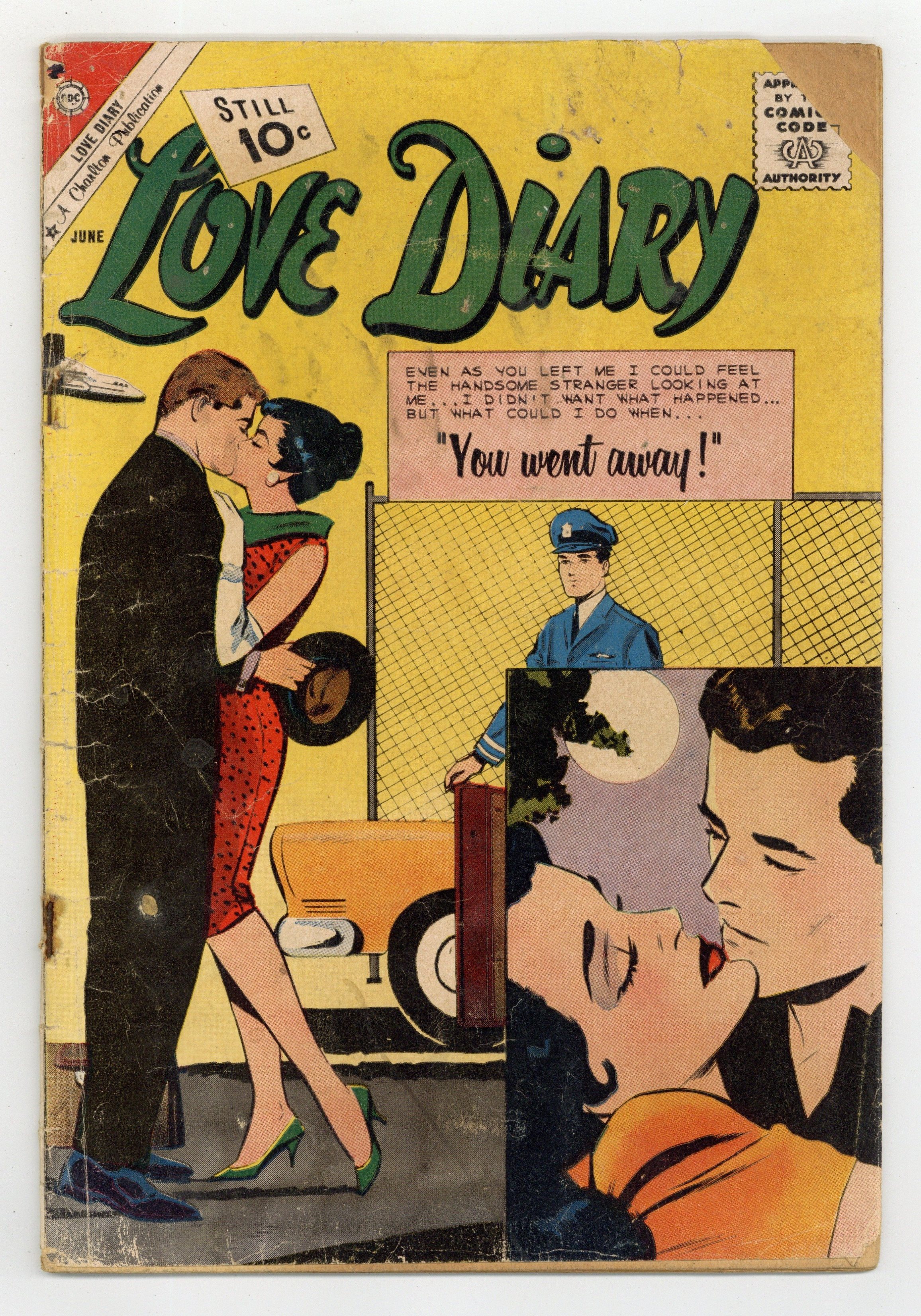Cover by Joe Sinnott and Vince Colletta. Stories and art by Charles Nicholas, Sal Trapani, Joe Sinnott and Vince Colletta. Women confide tales of romance to their diaries, in a series that sometimes reflected its tumultuous times. While Laura's husband Miles is away for two months, she's sorely tempted by handsome pilot Chuck. In the years after WWII, Celia meets handsome German professor Kurt, but she can't forget that her brother was killed by Nazis in the war. After his wife Anne is lost in a hurricane, Greg finds her diary chronicling their early days together. Featuring early art by Joe Sinnott of Fantastic Four fame. You Went Away!; Love Thine Enemy; When Love Dies; Wreckers of Romance; Our Days of Love. 32 pages, Full Color. Cover price $0.10.