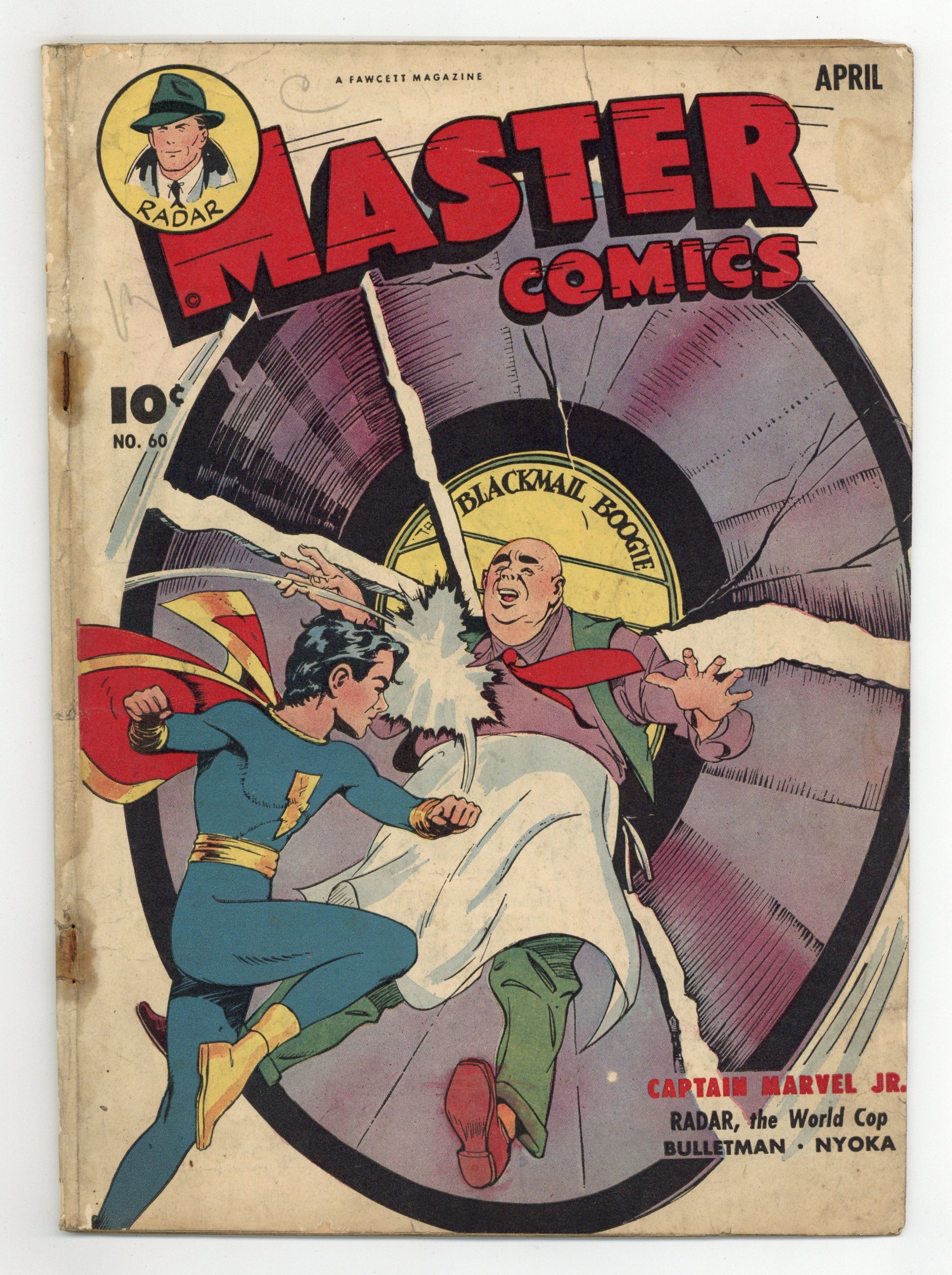 Cover by Bud Thompson. Stories and art by Otto Binder, Jack Sparling, and Al Carreno. Fawcett's showcase for comics covers the humor, Western, adventure and superhero genres, featuring Captain Marvel Jr., Bulletman and Bulletgirl. Captain Marvel, Jr. battles jukebox gangsters who use special records that expose the dark secrets of anyone listening, leaving them open to blackmail - now there's a new angle. "International policeman" Radar uncovers a plot to blow up the Panama Canal. When a gang thug and his moll get hold of Bulletman and Bulletgirl's gravity helmets, the result is Bullethug and Bulletmoll. Radar: Rocket Bombs Over Panama; Nyoka, the Jungle Girl: The Terrible Tiara: Part 2; Bulletman: Bullethug and Bulletmoll; Helpful Hugo in Hollywood; Boxcar Benny; Hoodoo Hannigan, Ch. 32; Captain Marvel, Jr.: The Racket in Wax. 32 pages, Full Color. Cover price $0.10.