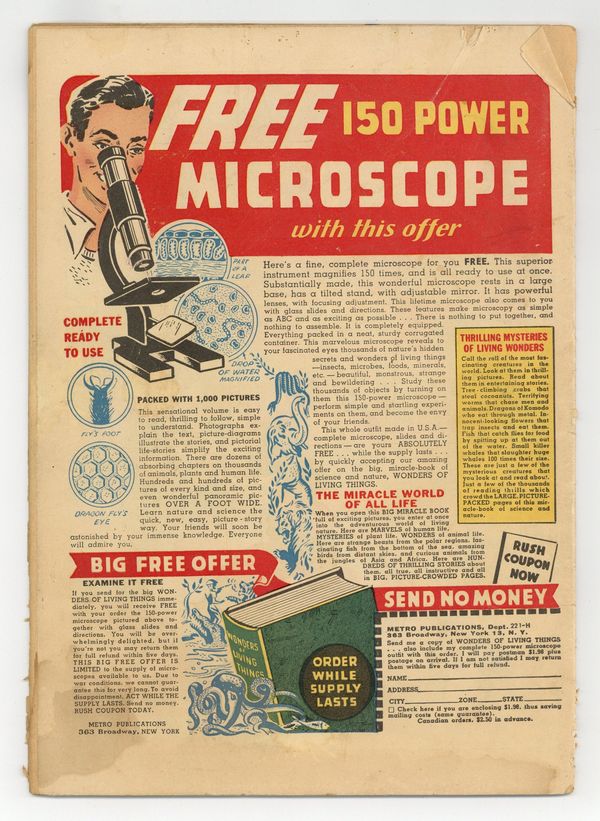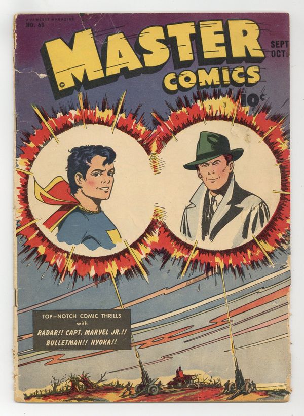 Stories and art by Gene MacDonald and Al Carreno. Fawcett's showcase for comics covers the humor, Western, adventure and superhero genres, featuring Captain Marvel Jr., Bulletman and Bulletgirl. "International policeman" (spy) Radar discovers the sinister link between swastikas on ancient Mayan ruins and the more modern ones in Berlin. Captain Marvel, Jr. investigates when political figures begin disappearing. Bulletman gets some help from "Bulletdog" (yes, a flying dog) when facing the Thief of Arts. Plus a vintage Tootsie Roll ad, Captain Tootsie Captures the Red Terror!, with art by Shazam co-creator CC Beck. Radar: The Brand of the Swastika; Tumbleweed Jr.; Sam the Sheriff; Nyoka, the Jungle Girl: Jungle Doom: Part 1: The Hairless Horror; Bulletman: The Thief of Arts; Boxcar Benny; Hoodoo Hannigan, Ch. 35: Thunder in the Dawn; Captain Marvel, Jr.: Mystery of the Vanishing Senators. 32 pages, Full Color. Cover price $0.10.