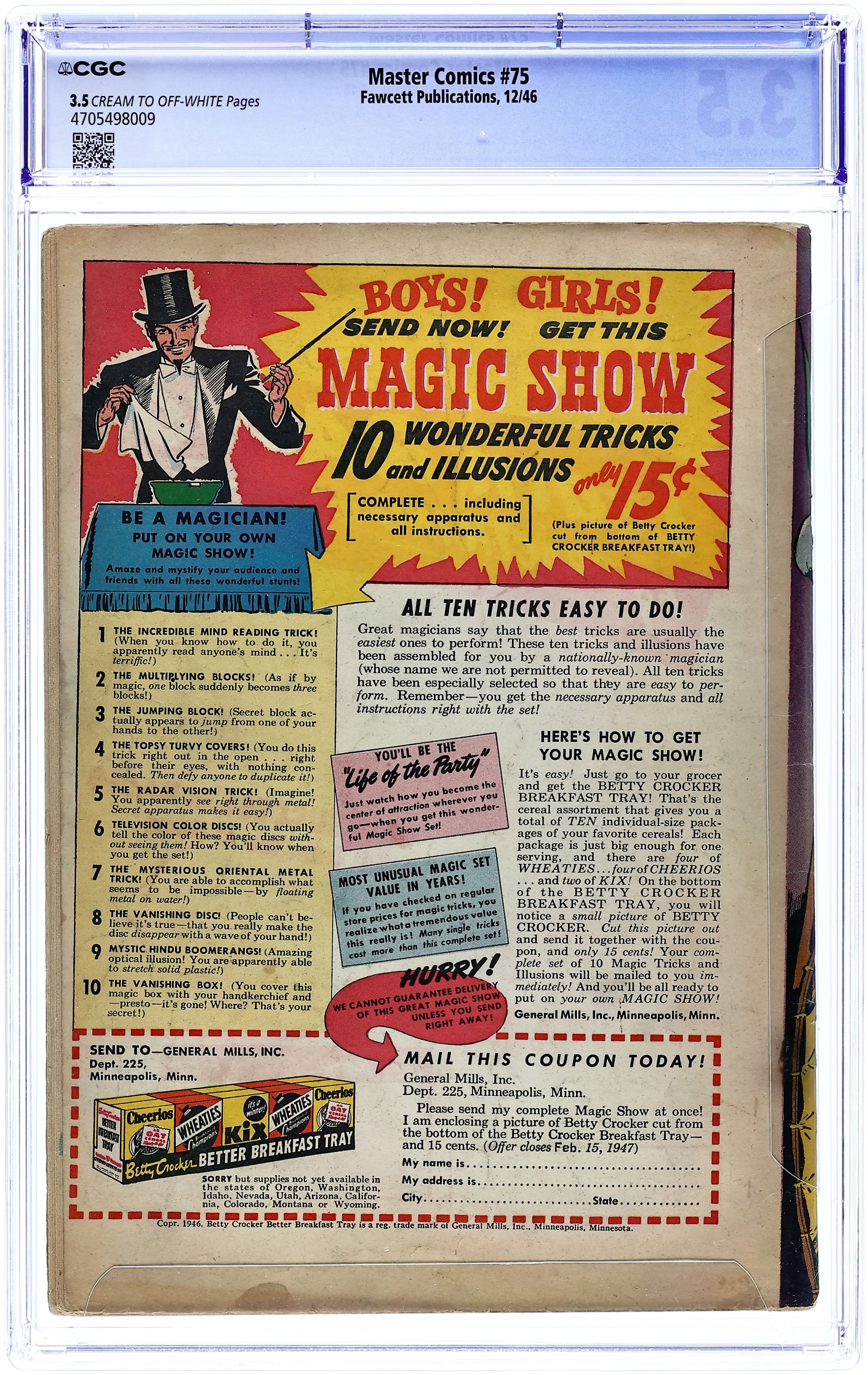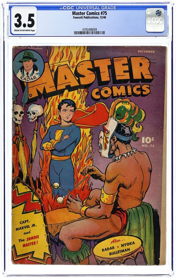 Stories and art by Howard Boughner and others. Fawcett's showcase for comics covers the humor, Western, adventure and superhero genres, featuring Captain Marvel Jr., Bulletman and Bulletgirl. Action girl Nyoka meets tigers in the jungles of India. Radar the superspy tracks war profiteers. Captain Marvel, Jr. battles a master of zombies - not the George Romero kind, but the Haitian voodoo kind. Plus a full-page comics-format ad for Mary Marvel fashions for girls (dresses, not the costume). Capt. Marvel Jr.: The Zombie Master; Lumber Jack: Small of Him!!; Nyoka in India; Whippersnappers: Exercise; Trader Tom: He Drives Us Crazy; Marooned; Bulletman: The Terrible Trio!; The Tragedy of Joe Miller; Whippersnappers: Dental Drolleries; Radar: The Merchant of War!. 48 pages, Full Color. Cover price $0.10.