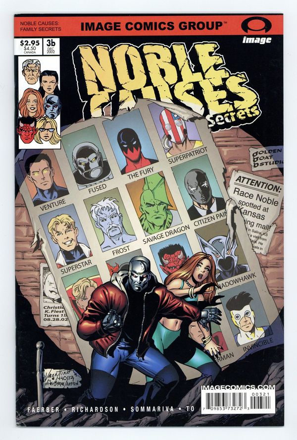 (W) Jay Faerber (P) Ian Richardson & Jon Sommariva (I) John Wycough & Jon Sommariva Cover A by Mike Avon Oeming Cover B by Jim Valentino FC 32pp $2.95 The Concept: When everyday girl Liz Donnelly married super-hero Race Noble, she didn't realize "until death do you part" would come so soon! Now, with Race dead, she's a stranger in a strange land ? an everyday person living with a family of celebrity super-heroes! Behind the glamour and wonder lie dark secrets, ruthless ambition, and twisted desires. Each issue features a lead story set in the present, and a back-up story set in the past. This Issue: It's guest-stars galore as Rusty goes on a rampage, interrogating various Image super-heroes who he thinks may have gotten Zephyr pregnant! Meanwhile, Doc makes a startling discovery of his own, and Liz has a confrontation with the person who leaked the latest Noble scandal to the press. Australian artist Jon Sommariva illustrates the back-up story, which provides a glimpse into Frost's troubled childhood. Cover price $2.95.