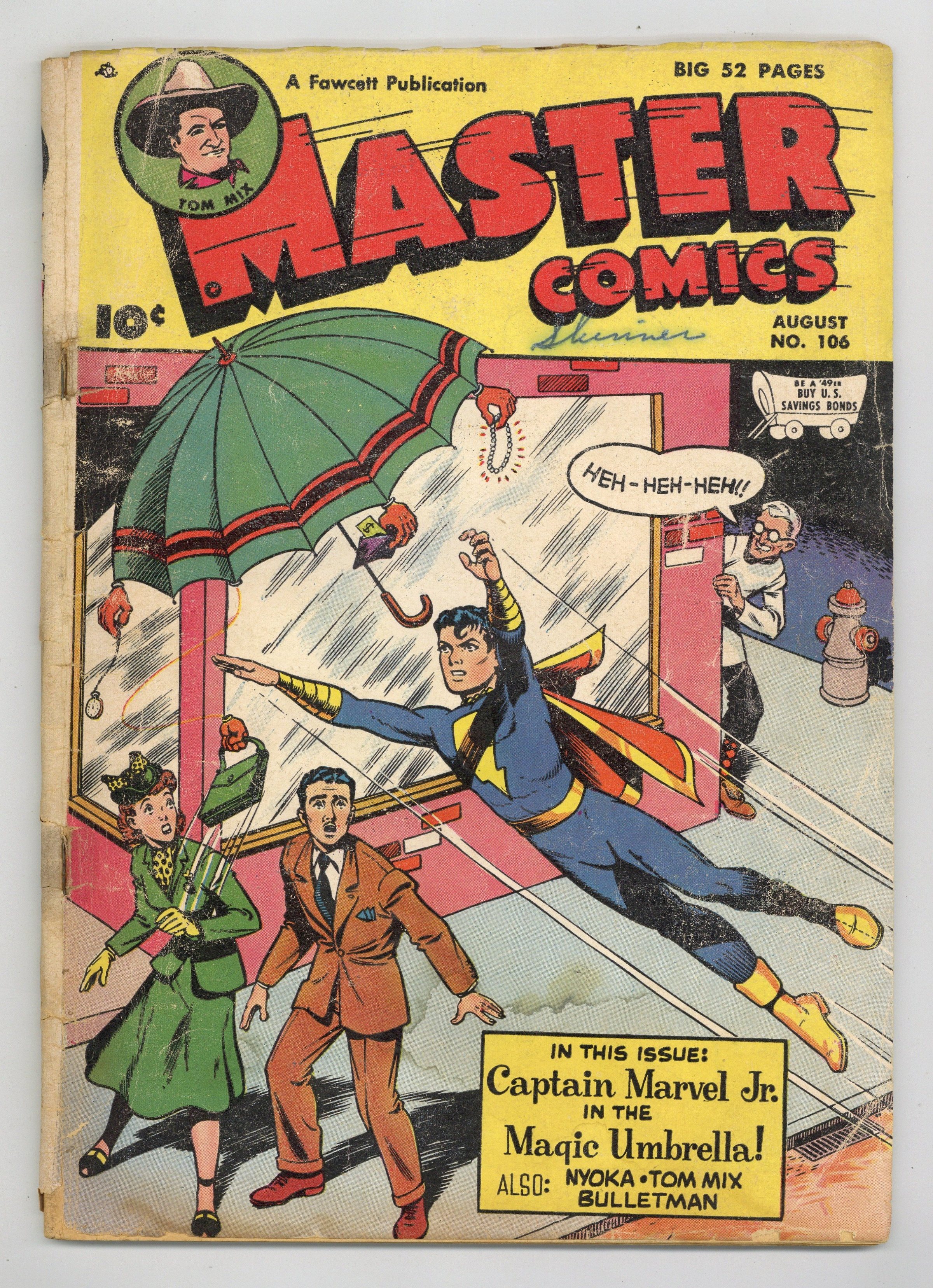 Cover by Kurt Schaffenberger. Stories and art by Bill Ward, Bud Thompson, Howard Boughner, Henry Kiefer, Carl Pfeufer and John Jordan. Fawcett's showcase for comics covers the humor, Western, adventure and superhero genres, featuring Captain Marvel Jr., Bulletman and Bulletgirl. Sivana Jr.'s latest trick is to animate Mrs. Wagner's umbrella, so Freddy Freeman's landlady is accused of crimes actually committed...by the umbrella! While guiding hunters in the South Pacific islands, jungle queen Nyoka encounters the poisonous skunkfish, whose deadly spray is legendary. When a prospector goes on an insane rampage shortly after discovering gold, Western hero Tom Mix wants to find out what it's all about. Bulletman and Bulletgirl make their final Golden Age appearance, in a story with art by Torchy artist Bill Ward. Plus a plethora of vintage comics-format ads, including a hair-cream ad featuring detective Sam Spade, and a Tootsie Roll ad, Captain Tootsie to the Rescue!, with art by Shazam co-creator CC Beck. Capt. Marvel Jr.: The Magic Umbrella; Nyoka: The Fatal Spray; Dizzy Daisy; Bulletman: The Case of the Crime Portrait; Alkali Pete; Muscle Hedd Sweats It Out!; Vacuum Bloobstutter: Summer Santa Claus; Great Gus; Tom Mix: Madness in the Mountains. 48 pages, Full Color. Cover price $0.10.