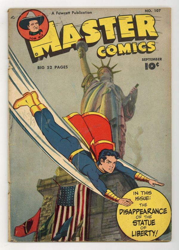 Cover by Kurt Schaffenberger. Stories and art by Kurt Schaffenberger, Carl Pfeufer and John Jordan. Fawcett's showcase for comics covers the humor, Western, adventure and superhero genres, featuring Captain Marvel Jr. Sivana Jr.'s latest trick is to make the entire Statue of Liberty disappear, years before David Copperfield did the same. Jungle queen Nyoka joins the search for a miracle potion from jungle resources. Western hero Tom Mix wonders if the so-called Witch of Shallow Gulch could be the real thing. Capt. Marvel Jr.: The Disappearance of the Statue of Liberty; Colonel Corn & Korny Kobb: Photogenic Fools; Nyoka: The Miracle Potion; Ozzie and Babs: No Base Like Home; Fashionable Fred; Tom Mix: The Witch of Shallow Gulch. 48 pages, Full Color. Cover price $0.10.