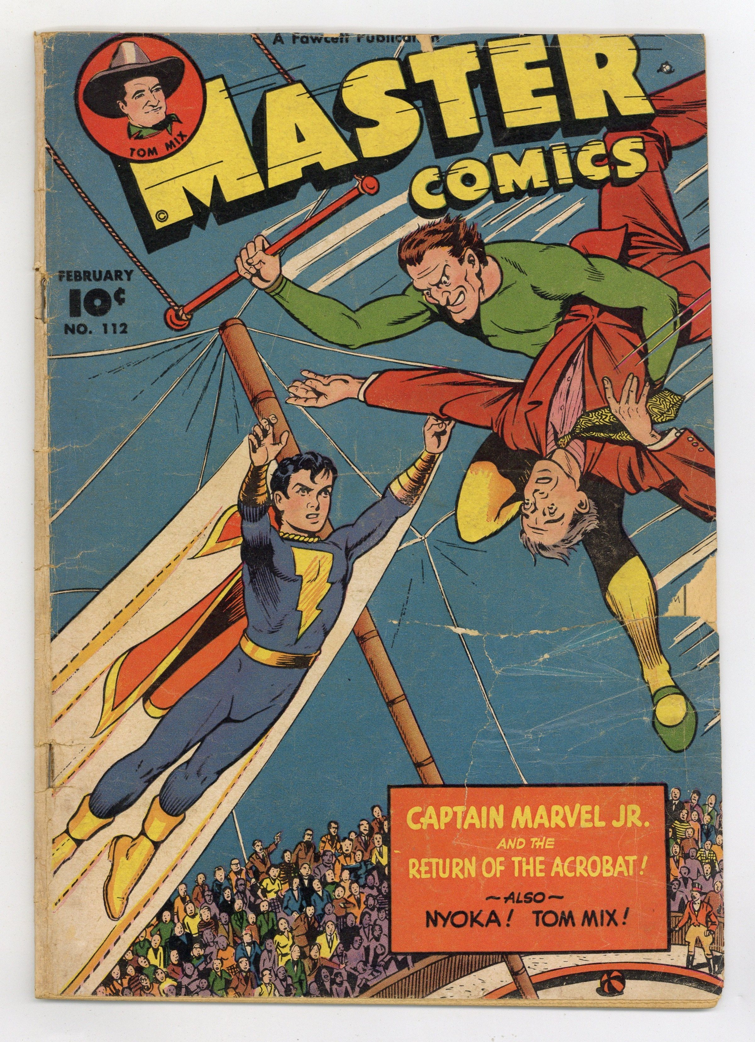 Cover by Kurt Schaffenberger. Stories and art by Kurt Schaffenberger, Henry Kiefer, Howard Boughner, Carl Pfeufer and John Jordan. Fawcett's showcase for comics covers the humor, Western, adventure and superhero genres, featuring Captain Marvel Jr. Captain Marvel Jr. faces the return the circus performer-gone-wrong known as The Acrobat, in a story (and cover) with art by longtime Superman artist Kurt Schaffenberger. The Acrobat has "moonitis," which gives him super-strength and an evil personality during a full moon. Action girl Nyoka tries to help her friend the Maharajah when his daughter Ama falls for a commoner and runs off with him. Western hero Tom Mix seeks the arsonist who's setting the town afire, but first he must rescue people trapped in burning buildings, using only his lasso and his courage. Capt. Marvel Jr.: The Return of the Acrobat!; Muscle Hedd; Nyoka: The Sacrifice of Death!; Dizzy Daisy; Plump Priscilla; Vacuum Bloobstutter: Bloob's BB Barrage; Tom Mix: The Flame Fiend; Gus the Guide. 32 pages, Full Color. Cover price $0.10.