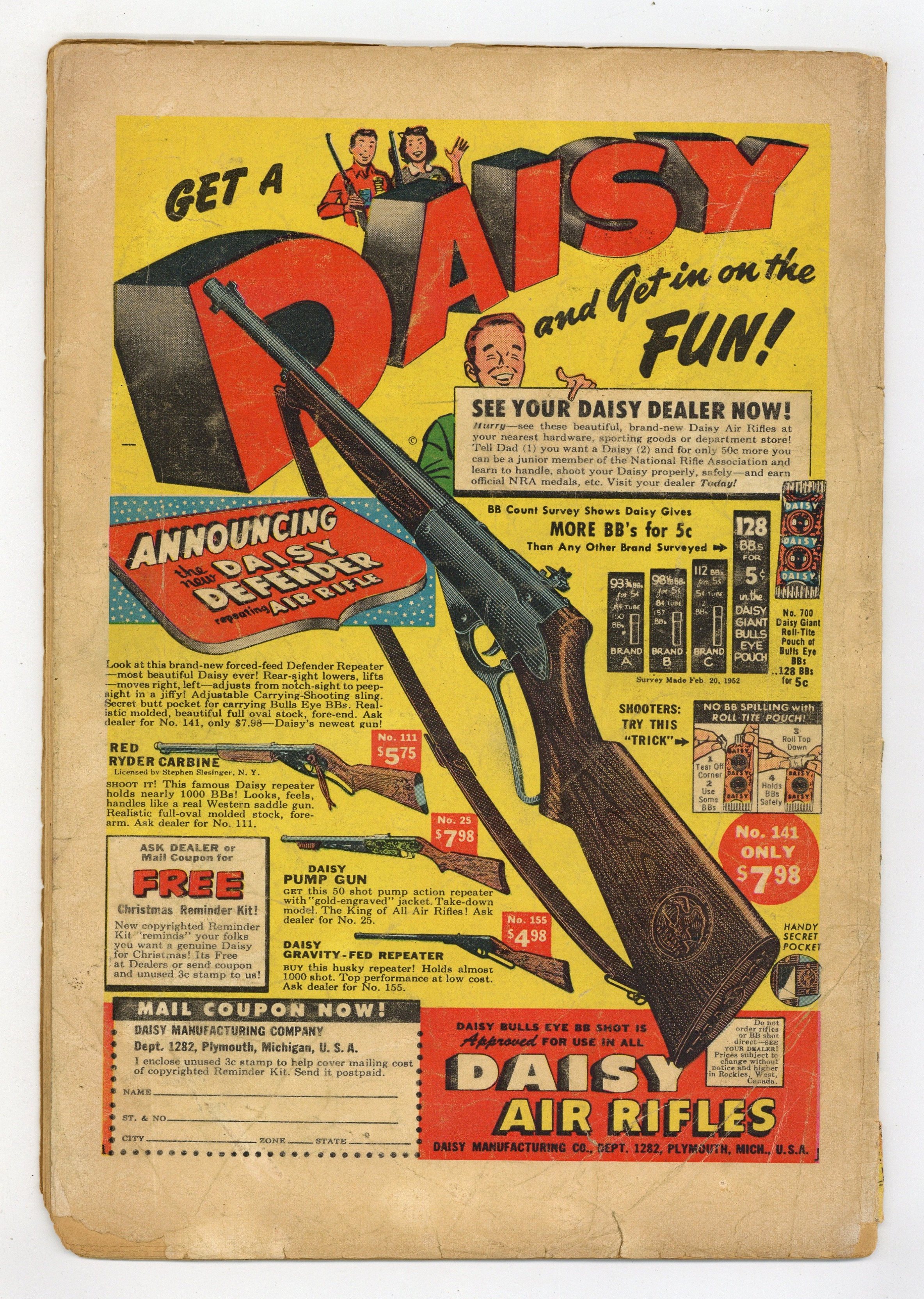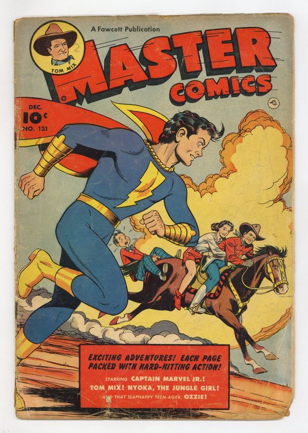 Cover art by Kurt Schaffenberger. The Deadly Fraud starring Captain Marvel, Jr., script and art by Bill Ward. The Mask of Death starring Nyoka the Jungle Girl. The Meeting On the High Seas starring Ozzie. The Shadows of the Grave, pencils by Carl Pfeufer, inks by John Jordan; While scouting out land for the Governor Tom Mix discovers gold; He intends to stake a claim and then turn over the land to the new settlers that the Governor wants to deed the land to; Unfortunately, Rangy Joe sees him find the gold nugget and he and his two friends attempt to kill him before he can stake the claim. 36 Pages, Full Color. Cover price $0.10.
