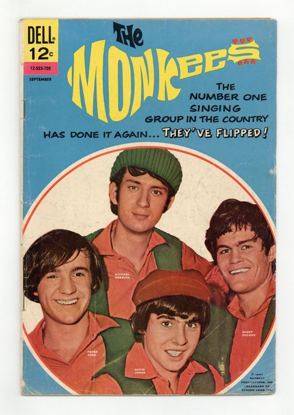 $17.50Photo cover features Peter Tork, Michael Nesmith, Micky Dolenz, and Davy Jones. Art by Jose Delbo. Cover number is 12-533-709. Dell's comic about the TV rock band does surprisingly well at capturing the madcap, absurd humor of the beloved show. The Monkees win a lost gold mine in a game show. But before they can claim the gold, they have to find the lost mine. The boys find work in a department store. Sons of the Desert; This is a Job for… The Monkees! 32 pages, Full Color. Cover price $0.12.