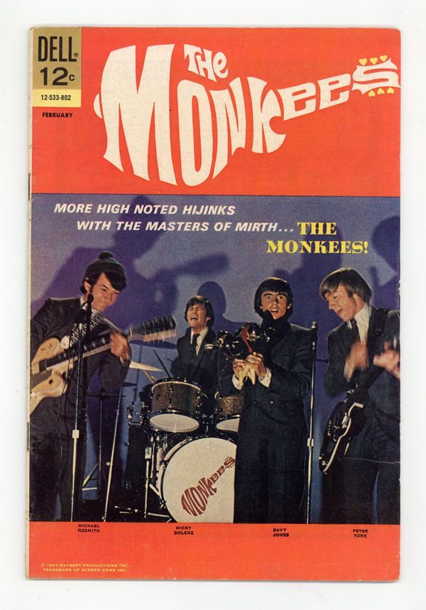 Photo cover features Peter Tork, Michael Nesmith, Micky Dolenz, and Davy Jones. Art by Jose Delbo. Cover number is 12-533-802. Dell's comic about the TV rock band does surprisingly well at capturing the madcap, absurd humor of the beloved show. The boys are hired by a boat designer to enter his new ship in a yachting race. The Monkees give up their instruments when a hot-dog concessionaire asks them to promote his hot dogs. Ship O Fools; A Bird in the Hand; The Ad Men. 32 pages, Full Color. Cover price $0.12.