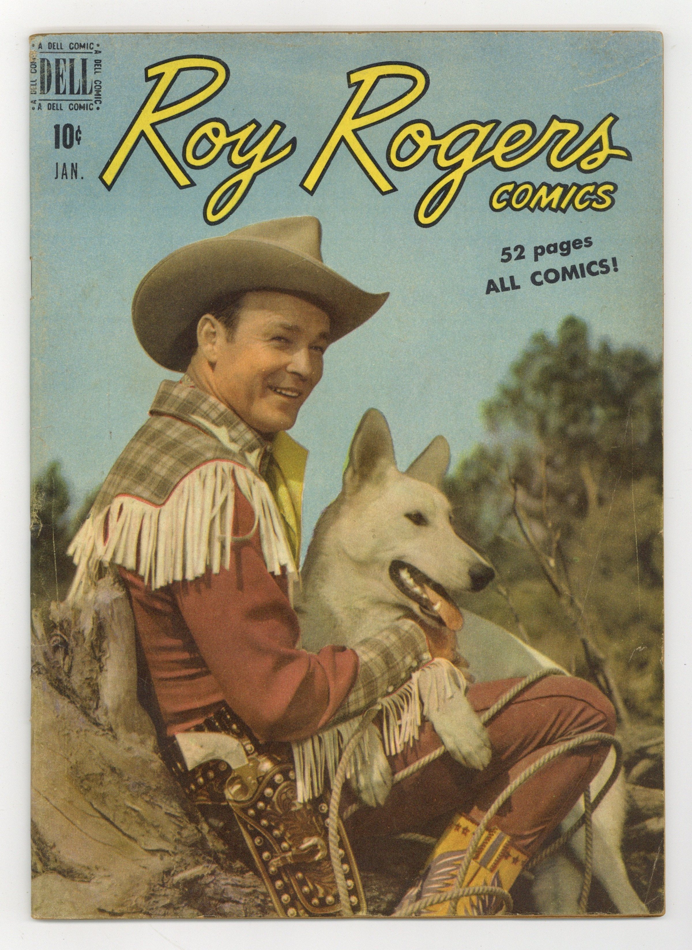 Photo covers of the famous singing cowboy, plus interior photos. Roy Rogers and the Lady Marshal, art by Albert Micale and Randy Steffen; Roy locks horns with a lady peace officer. Roy Rogers Trades Lead, art by Al McKimson and Randy Steffen; Roy goes searching in rugged country for a man's lost son. Pioneers of the Old West story, script by Gaylord DuBois, art by Albert Micale. Trigger story, script by Gaylord DuBois, art by Harry Parks. Back cover: color photo of Roy standing at fence, back to camera. 52 pages, full color. Cover price $0.10.