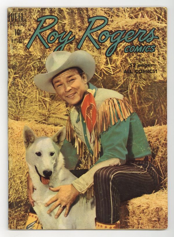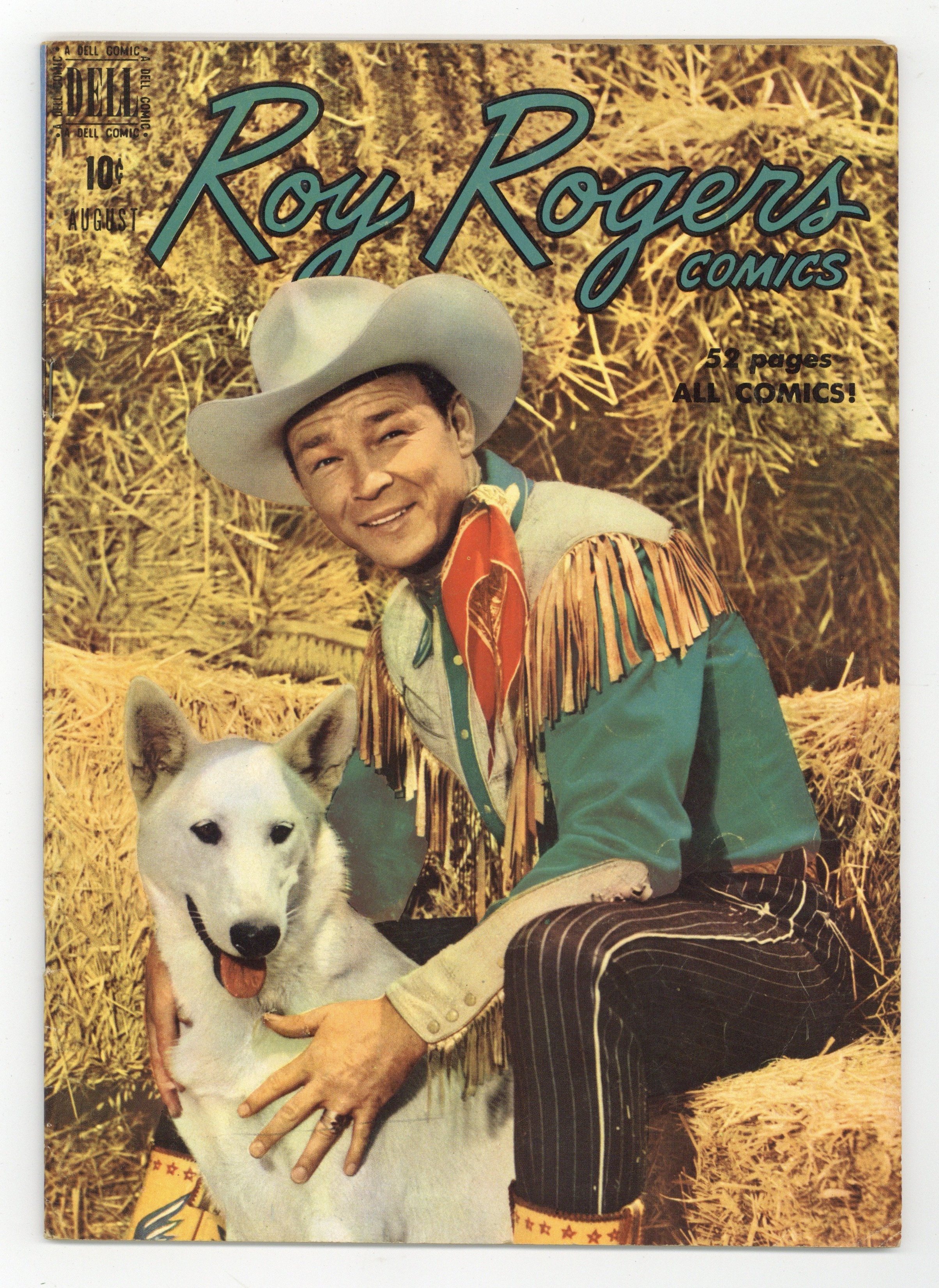 $16.00Photo cover of the famous singing cowboy, plus interior photos. Lynching Moon starring Roy Rogers, art by Albert Micale; As Roy takes a swim, a man borrows his clothes, and then kills Mr. Norton to frame Roy for the killing. Thirsty Creek starring Roy Rogers, art by Albert Micale; Roy runs into a dispute over fencing and water rights. Pioneers of the Old West text story, art by Albert Micale. Trigger story, art by Harry Parks. Full back cover pin-up of Roy Rogers. 52 pages, full color. Cover price $0.10.