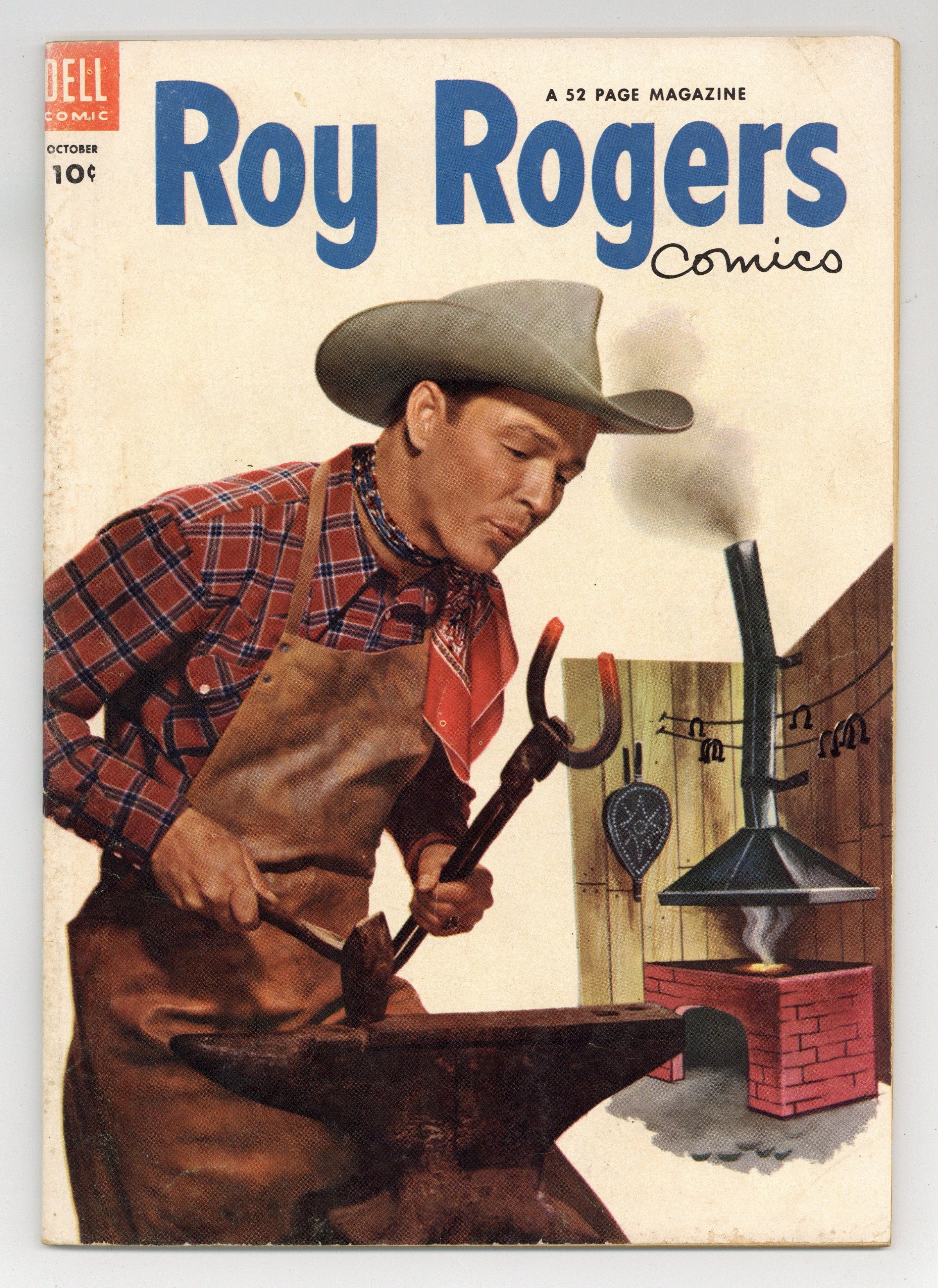 Photo cover of the famous singing cowboy. The Ravening Pack starring Roy Rogers, art by Albert Micale; a whole family of Navajos have been killed by a crazy Indian. Burro Business starring Roy Rogers, Bullet, and Trigger, art by Albert Micale; Roy and Bart are out tracking wild burros who may have killed a man. Bullet meets a Test, art by the Al McKimson team. Jeremy's Promise text story. Chuckwagon Charley's Tales story, art by Ray Thayer. The Tonyo Basin text article, art by August Lenox. Genuine Roy Rogers Button/Grape-Nuts Flakes ad. 52 pages, full color. Cover price $0.10.