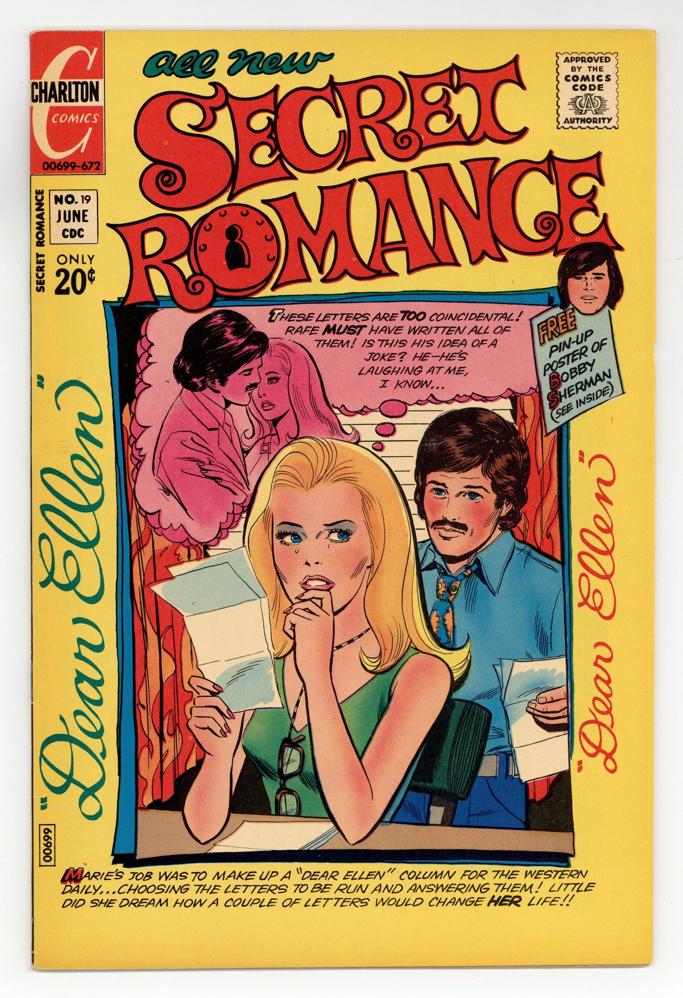 Published Jun 1972 by Charlton Comics Group.$41.00Cover by Sal Gentile? Stories by unknown. Art by unknown. Marie's job was to make up a 'Dear Ellen' column for the Western Daily...choosing the letters to be run and answering them! Little did she dream how a couple of letters would change her life! Read..."Dear Ellen..."! Also featuring: "Out of the Past" and "Comfort Me, My Love"! Plus: pin-up of Bobby Sherman! And: letters page "Just Jeannette" by Jeannette Copeland. 32 pages, full color. Cover price $0.20.