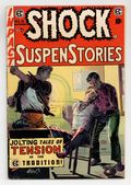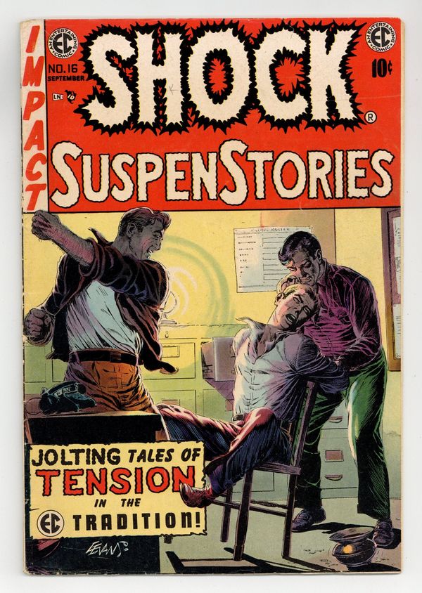 $210.00Cover art by George Evans. "Are You A Red Dupe" editorial on interior front page. ...My Brother's Keeper, script by Carl Wessler, art by George Evans; An evil Siamese twin murders but the state does not execute him as it would mean the death of the good one. The good one finally commits suicide to halt the evil of the other. The Hazing, art by Joe Orlando; A college student wants to join a frat so he makes up a story about a professor they don't like being a communist in order to get him fired. Slob! text story by Albert B. Feldstein. A Kind Of Justice, script by Carl Wessler, art by Reed Crandall; A mob beat a vagrant to death for the rape of a sixteen year old girl that the town sheriff has been violating. The Pen Is Mightier, script by Carl Wessler, art by Jack Kamen; A newspaper columnist murders his gangster friend to get his wife and frames an innocent man for the crime through the power of his words. 36 pgs. $0.10. Cover price $0.10.