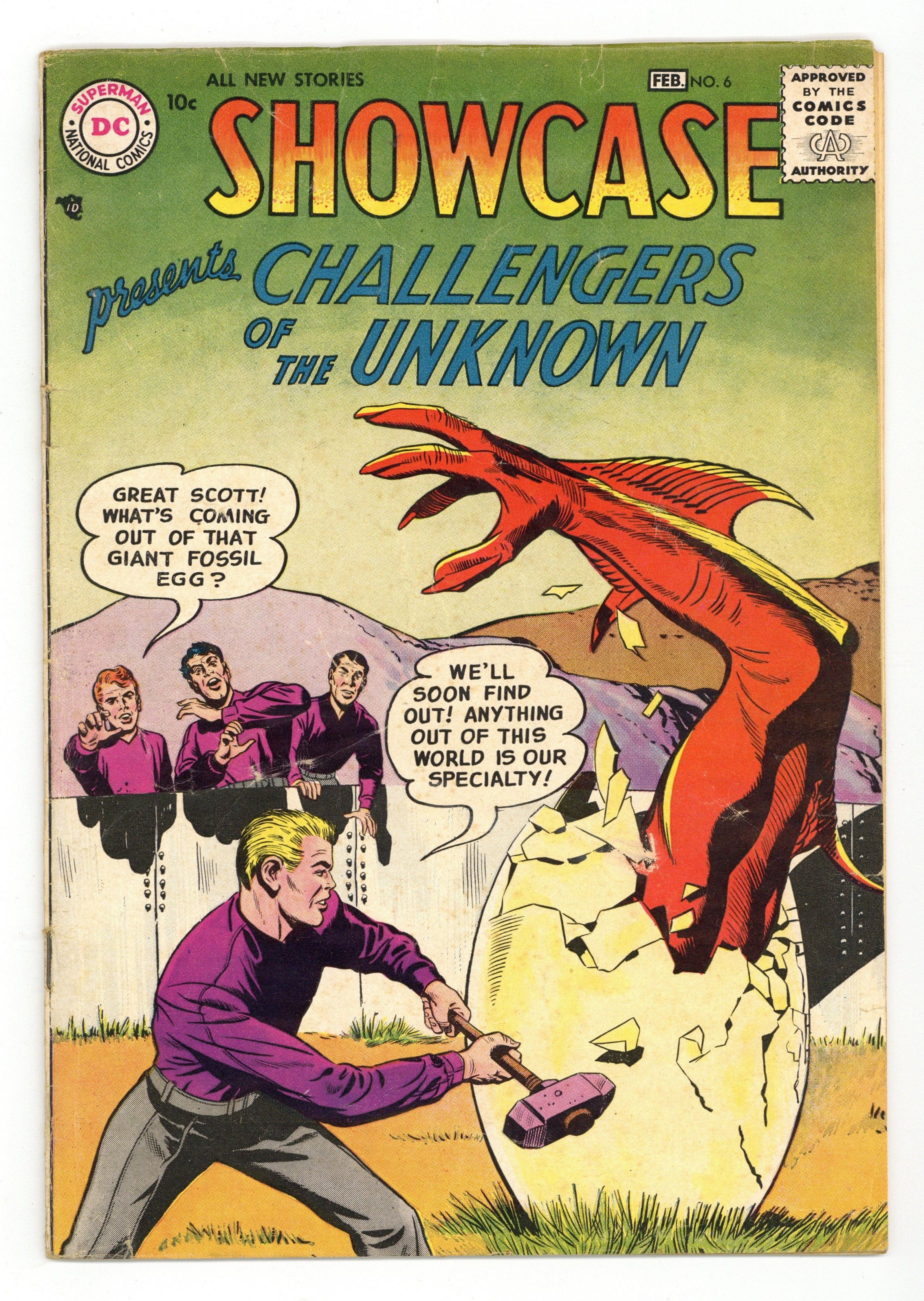 Cover pencils by Jack Kirby. Origin and first appearance of Challengers of the Unknown in The Secret of the Sorcerer's Box (Chapter 1), script by Jack Kirby (plot, script) and Dave Wood (script), pencils by Jack Kirby; Four heroes are being flown to appear on the radio show "Heroes" when their jet crashes in a storm; Miraculously, all four survive unharmed, even down to a working watch; First Silver Age hero team and first original concept Silver Age series. Shorty humor page by Henry Boltinoff. Whistle Magic! fact page by Mort Drucker. Dragon Seed! (Chapter 2), script by Jack Kirby (plot, script) and Dave Wood (script), pencils by Jack Kirby; The Challs relocate the box to a tropical island and draw straws; The first chamber releases a "Dragon's Egg" that hatches a stone giant of legend. Moolah the Mystic humor page by Henry Boltinoff. The Freezing Sun! (Chapter 3), script by Jack Kirby (plot, script) and Dave Wood (script), pencils by Jack Kirby. I Fought the Phantom Planes text story. The Whirling Weaver! (Chapter 4). First Silver Age hero team and first original concept Silver Age series. Reprinted in Challengers of the Unknown 64-65. 36 Pages, Full Color. Cover price $0.10.