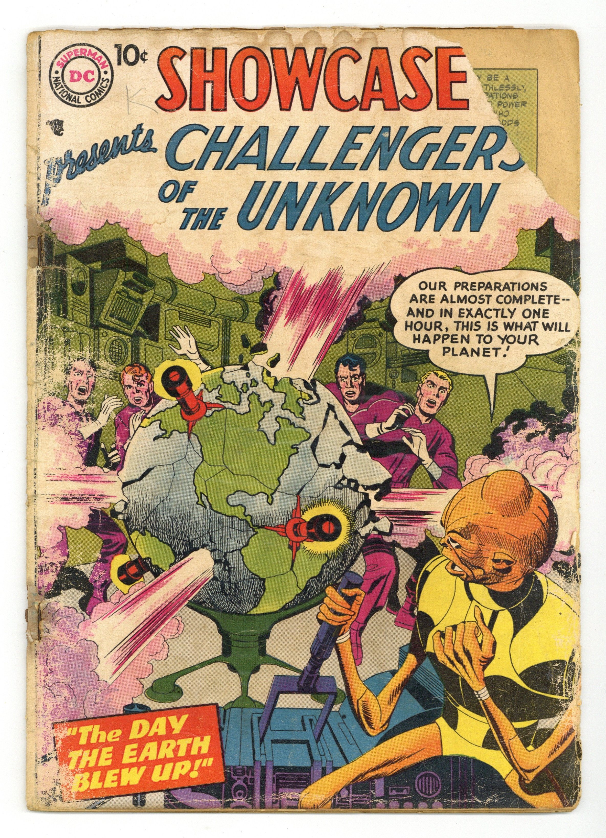 Cover art by Jack Kirby. 3rd apearance of Challengers of the Unknown in The Day the Earth Blew Up, script by Dave Wood, pencils by Jack Kirby, inks by Bruno Premiani; At the Pentagon, Navy officers and scientists are stumped; Two scientists mysteriously disappeared in Antarctica; They call in "men capable of handling the unknown," and Ace takes the call; He, Rocky, and Red fly; They'll pick up Prof along the way; Off New Guinea, Prof is astounded to find a volcano rising from the sea bed; In the Antarctic, the Challengers snow-tractor toward the mystery spot; The tractor bogs in a snowstorm and needs repairs; Ace and Rocky explore and fall through thin ice!; They land on a futuristic bridge; Above, Prof and Red are captured by skinny orange aliens in bubble-suits. Just Imagine story, art by Virgil Finlay. 36 Pages, Full Color. Cover price $0.10.