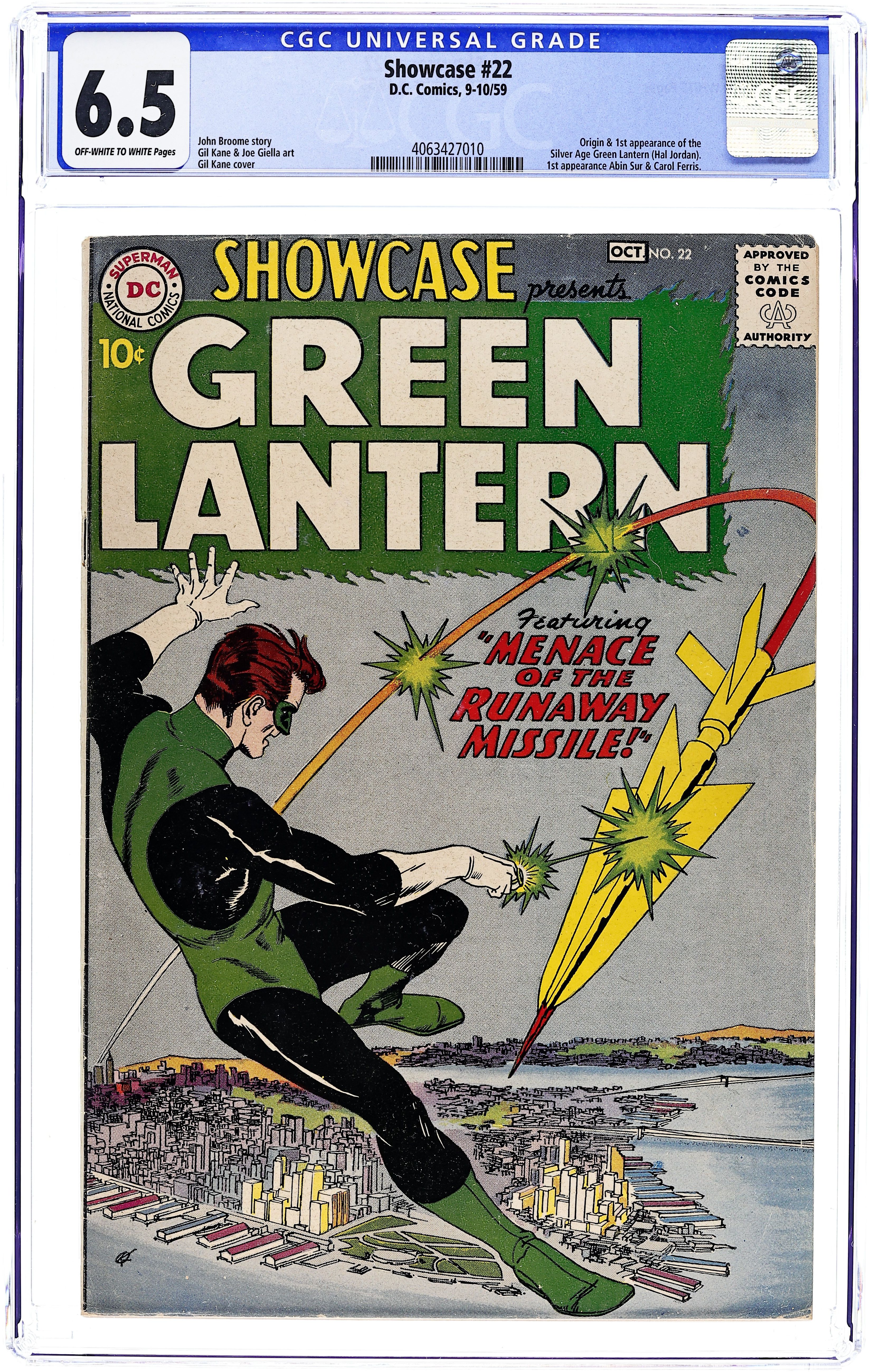 Origin and 1st appearance of Hal Jordan (Silver Age Green Lantern). Cover and interior art by Gil Kane. SOS Green Lantern; Hal Jordan is selected by the power ring of Abin Sur to become a Green Lantern. Secret of the Flaming Spear!; Saboteurs try to crash a new experimental aircraft created by Ferris Aircraft. Menace of the Runaway Missile!; Green Lantern stops a missile launched by Dr. Parris at a government Hydrogen Power facility. Scripts by John Broome. 36 Pages, Full Color. Cover price $0.10.
