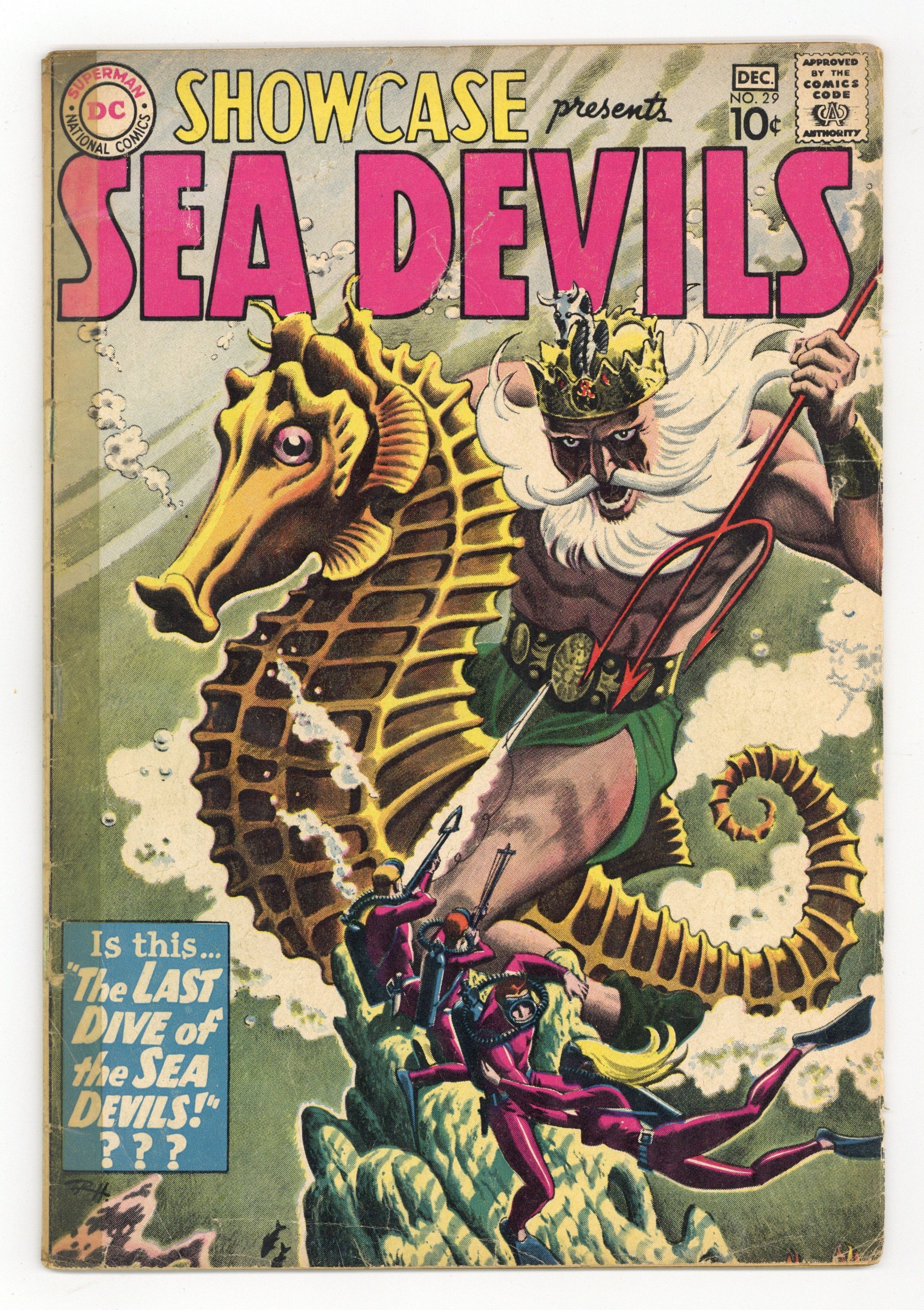 Cover art by Russ Heath. Last Dive of the Sea Devils!, art by Russ Heath; As the radio reports a UFO sighting, the Sea Devils, out in the boat Sea Witch, meet a giant "King Neptune" spearing boats from a giant sea horse. Ad for Justice League of America. Frogmen(?) of Olde!; Historical piece about Alexander the Great's use of "combat divers." Undersea Scavenger Hunt!, script by Robert Kanigher, art by Russ Heath; Having lost their boat, the Sea Witch, the Sea Devils enter a millionaire-sponsored underwater scavenger hunt to win a new boat; They find a life ring from the Marie Celeste, a jeweled sword, and other treasures, but lose them through mishaps. Ad for Our Army at War. 36 Pages, Full Color. Cover price $0.10.