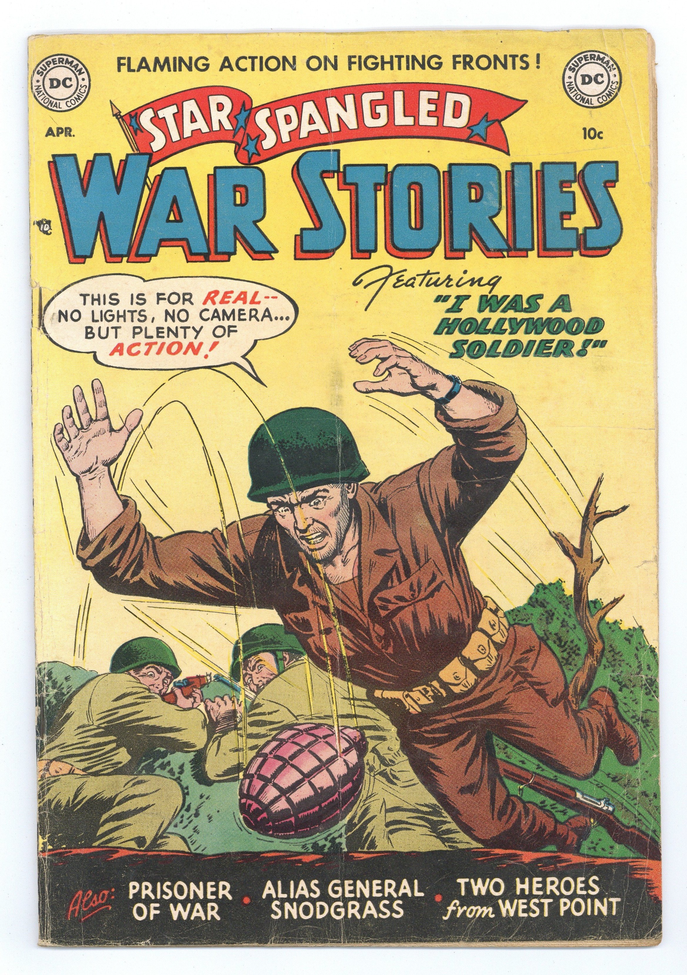 Cover pencils by Curt Swan, inks by Ray Burnley. I Was a Hollywood Soldier, pencils by Curt Swan, inks by Ray Burnley. Two Heroes from West Point, art by Ramona Fradon. Alias General Snodgrass, art by Jim McArdle. Prisoner of War, pencils by Jerry Grandenetti, inks by Ray Burnley. Private Pete filler page by Henry Boltinoff. Shorty filler page by Henry Boltinoff. 36 Pages, Full Color. Cover price $0.10.